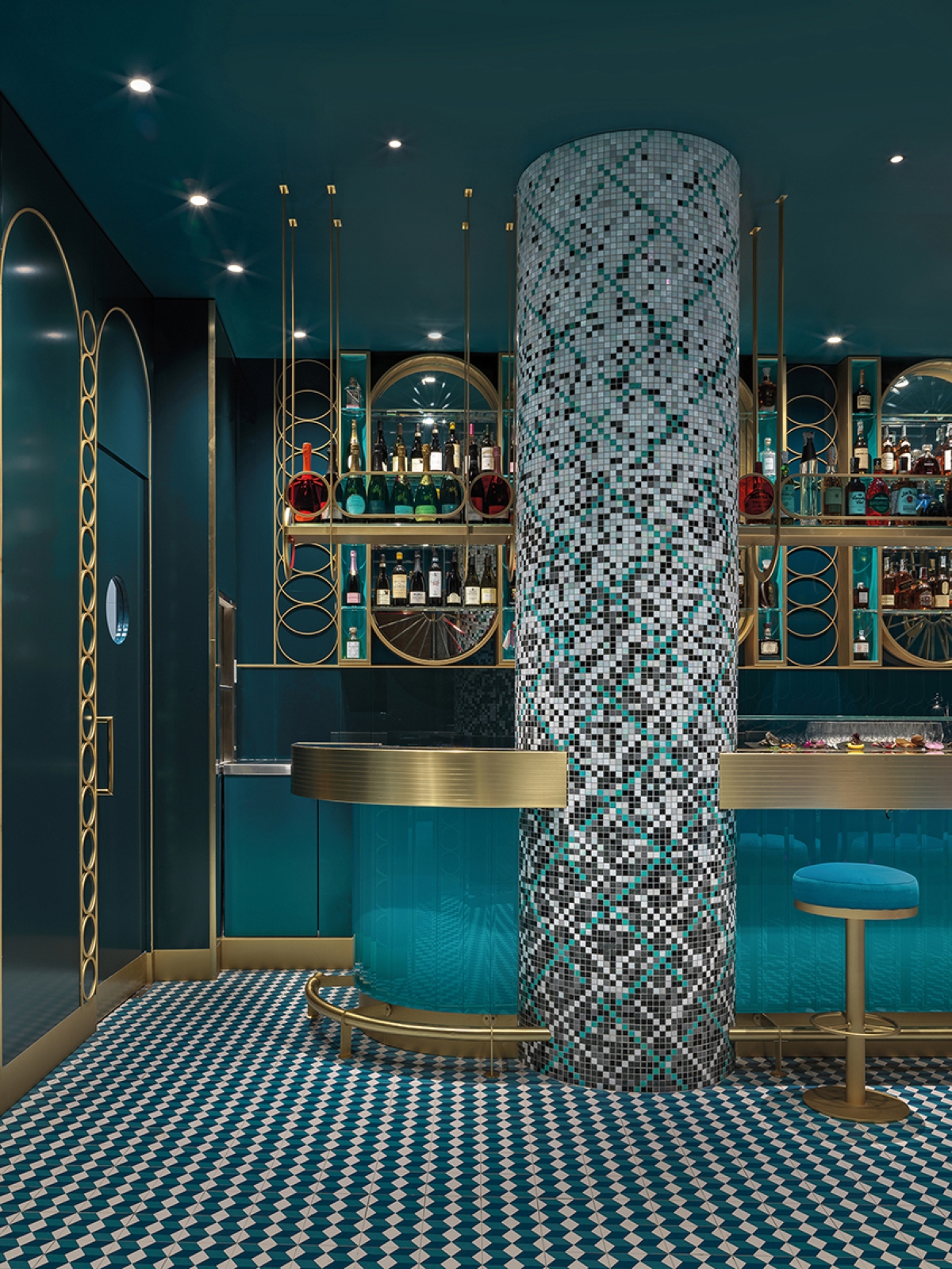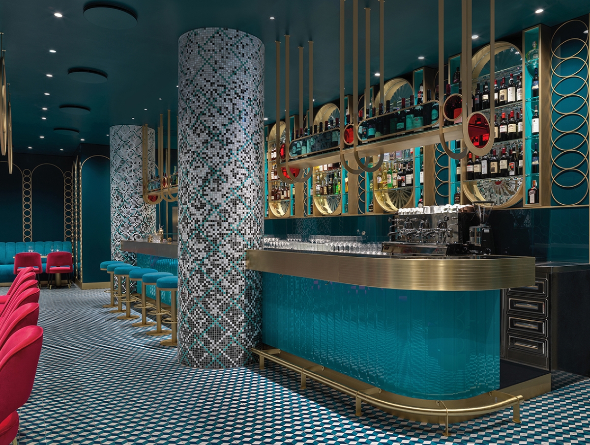 Le grandi colonne rivestite in mosaico trafiggono il lungo bancone dal rivestimento in vetro diamantato turchese dove su uno spesso piano in ottone fresato, gli acrobatici bar tender miscelano i loro cocktails.