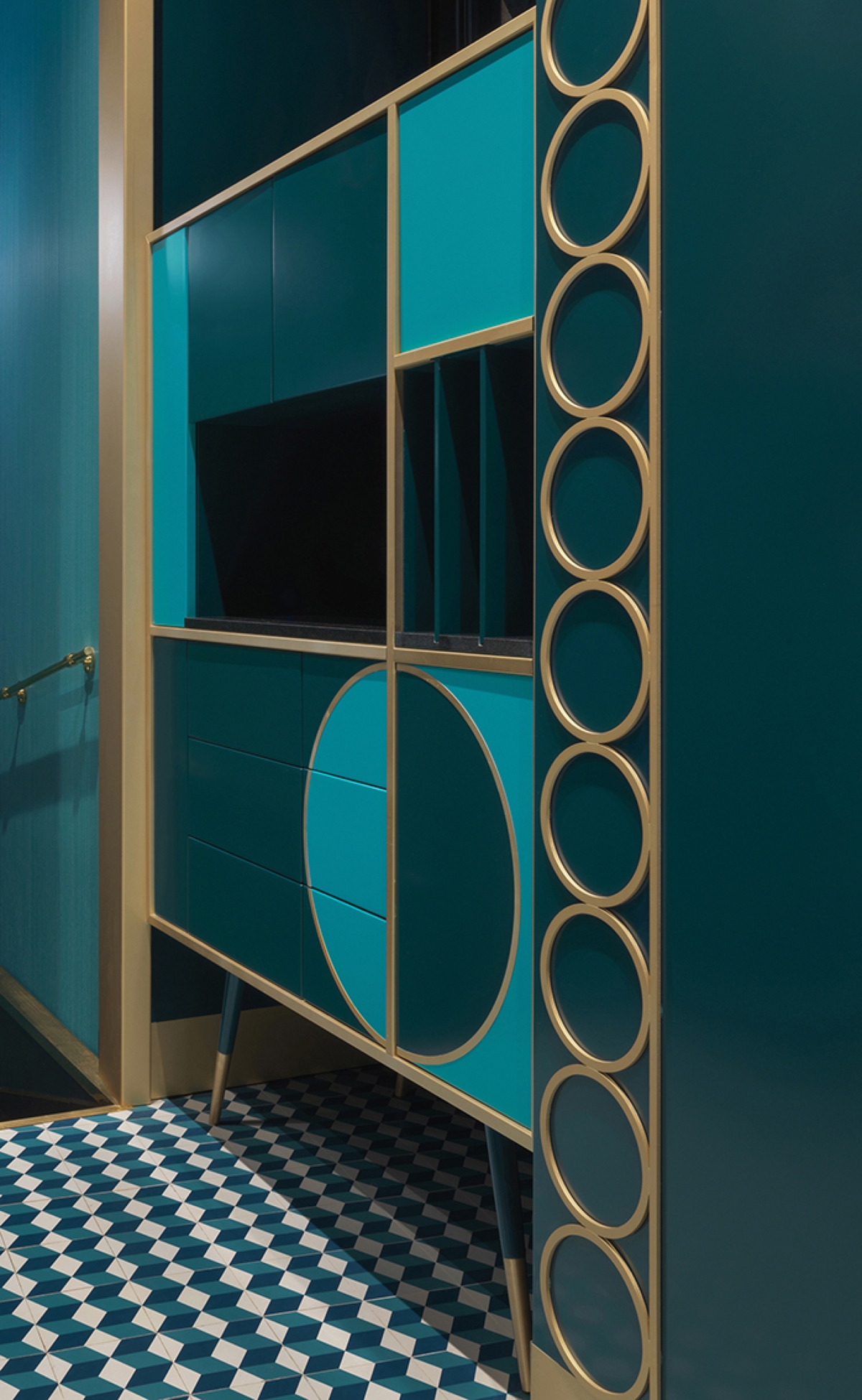 Il cerchio costituisce la matrice generatrice degli elementi dinamici, dalle linee morbide e sinuose, che caratterizzano gli interni, dai fregi sottili e arcuati che avvolgono lo spazio, ai profondi screen a losanga tridimensionale della boiserie laccata colore ottanio, fino alle curve della serie di supporti che sostengono l’elemento portabottiglie sospeso sul bancone.