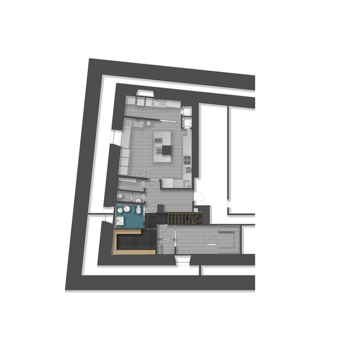 Anche l’uso del colore è ben modulato: ottanio, turchese, rosso dominano lo spazio e gli arredi, dalle sedie di velluto al divano continuo dalle forme avvolgenti, creando un insieme armonico di micro e macro elementi che compongono il progetto.