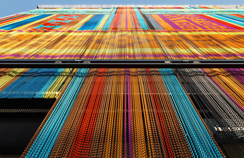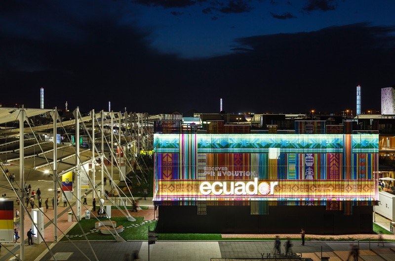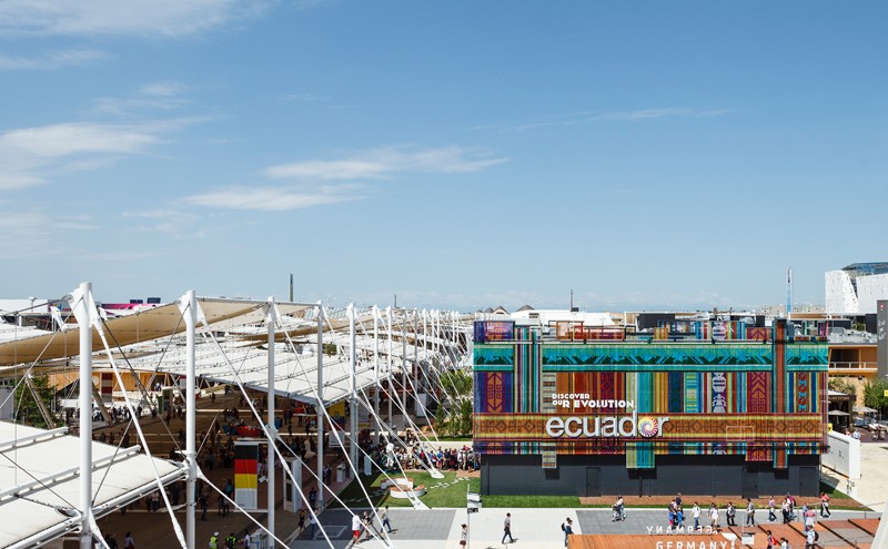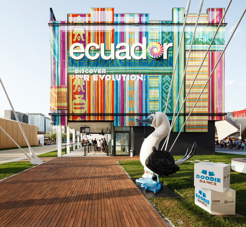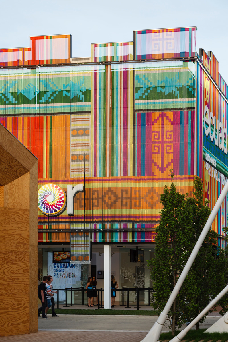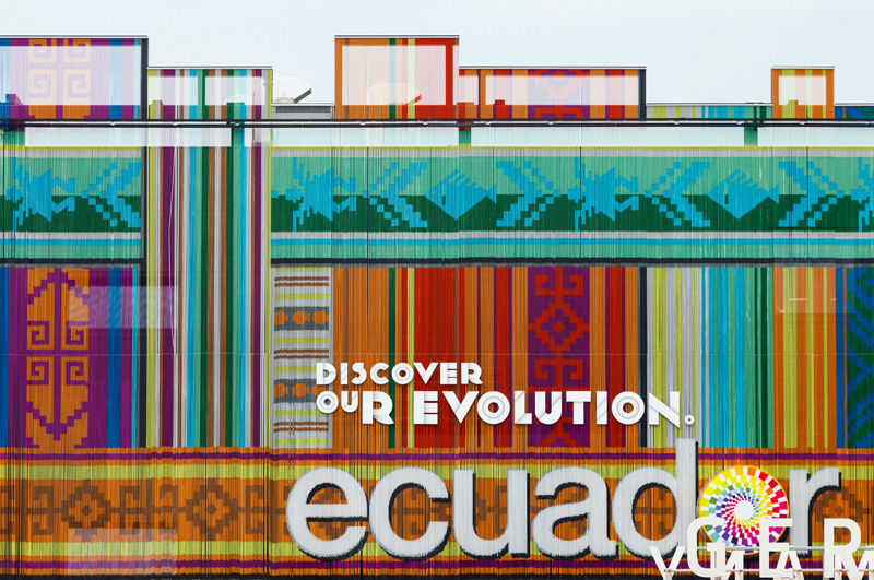 Lo studio di progettazione Zorrozua & Associates ha scelto giganti tende in alluminio anodizzato colorato che ricoprono l’esterno dell’edificio del padiglione dell’Ecuador al Milano Expo 2015.