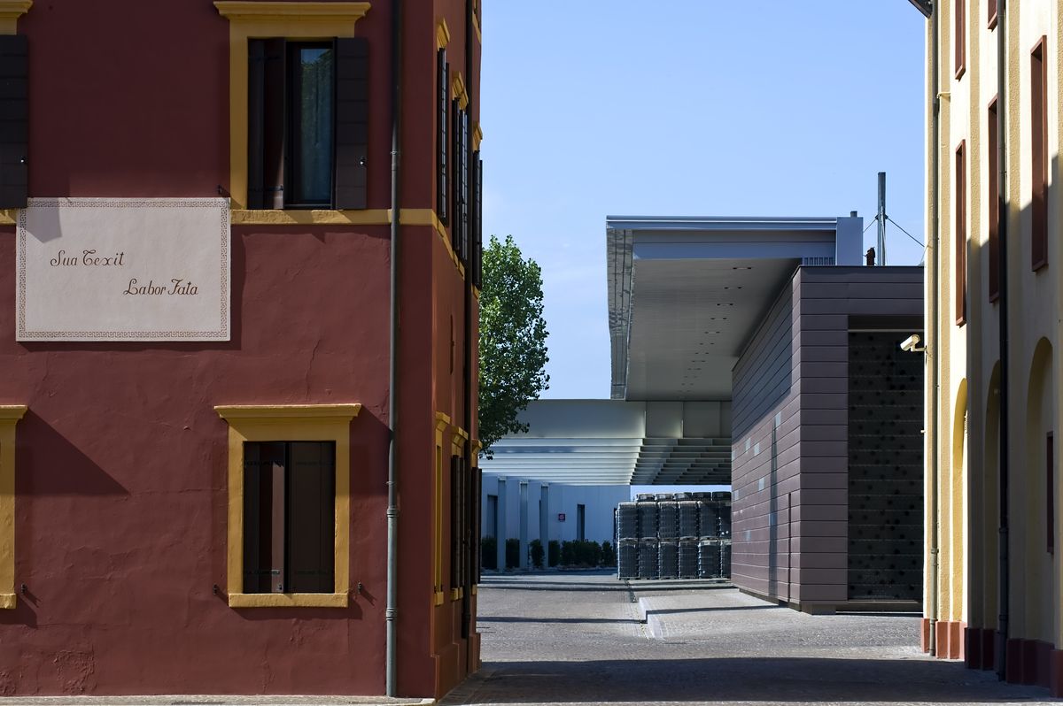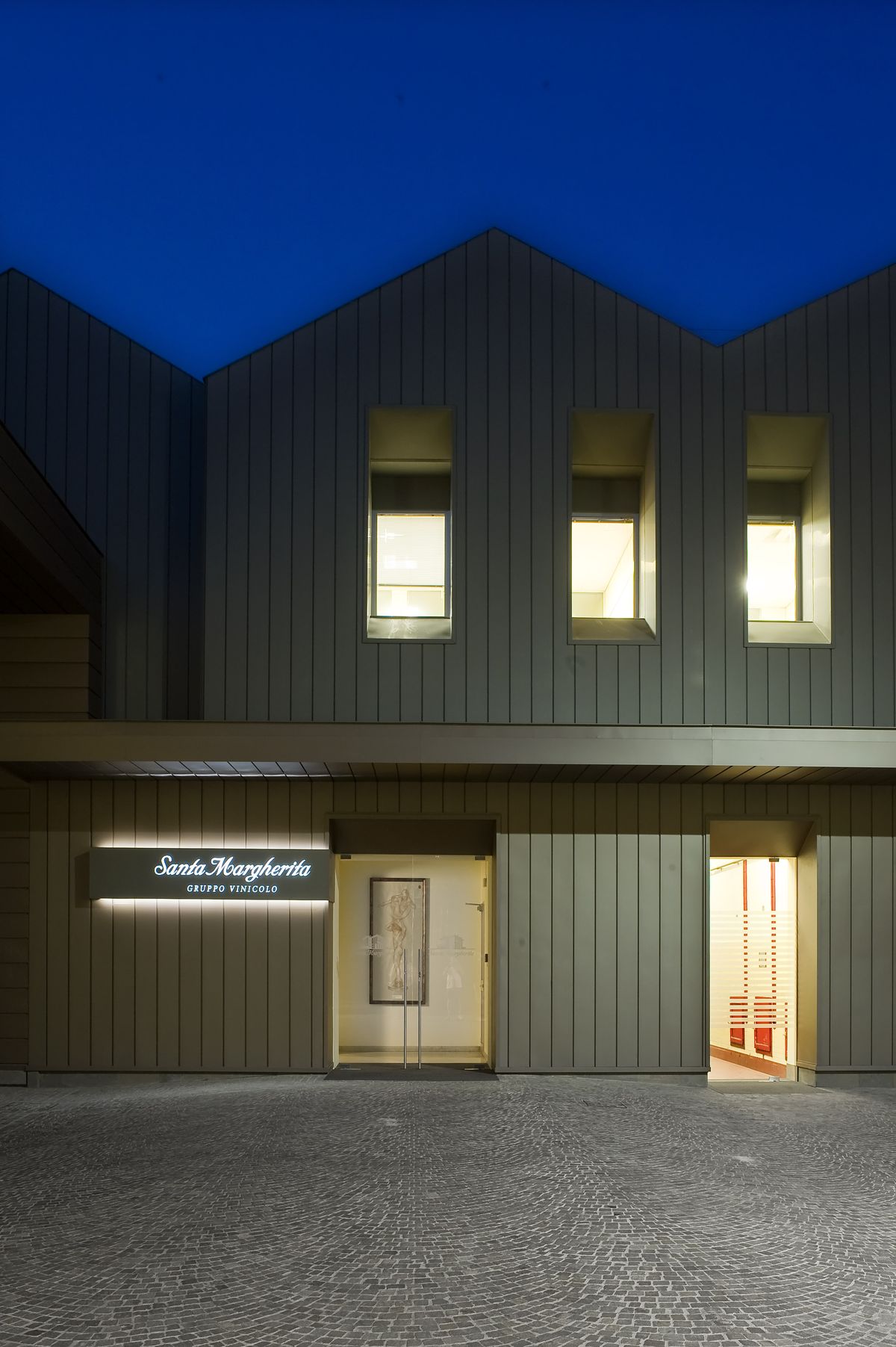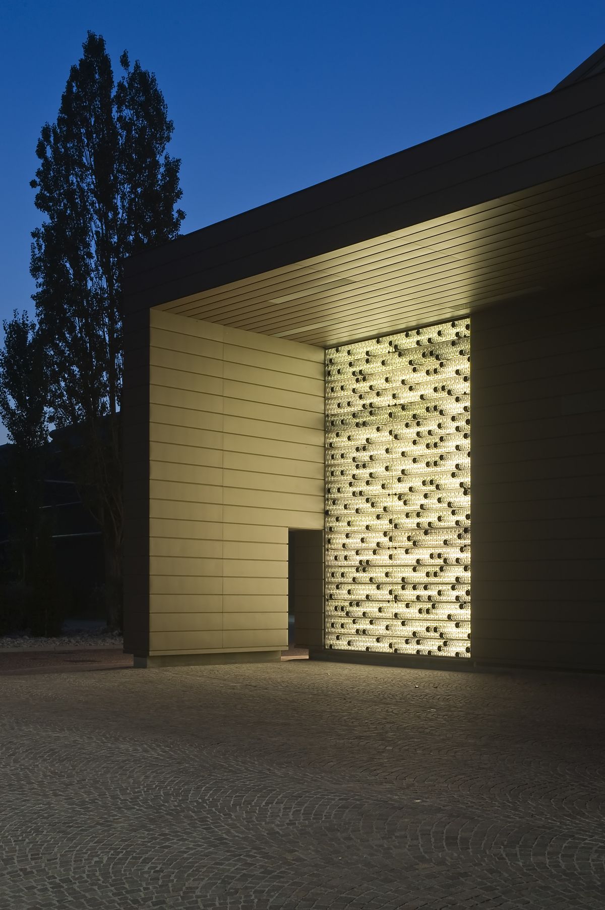 L’architettura, così pensata, ha raggiunto l’obiettivo di rendere più fluidi i movimenti, proteggere dalle intemperie cose e persone, ma anche quello di unire le diverse fasi e zone: stoccaggio, area di vinificazione e cantina. Ogni reparto si dichiara protagonista e tassello importante di una catena, a partire dalla nuova dimensione architettonica e visiva che si coglie nel colpo d’occhio generale. Richiamata, nella sua importanza, da una parete di vetro retroilluminata. Realizzata con duemila bottiglie, risolve una zona d’ombra e sintetizza l’impronta imprenditoriale della Cantina Santa Margherita. Di giorno attira l’attenzione di chi è diretto negli uffici e di notte emana un rassicurante effetto scenografico, in continuità con l’insegna aziendale luminosa posta a poca distanza.