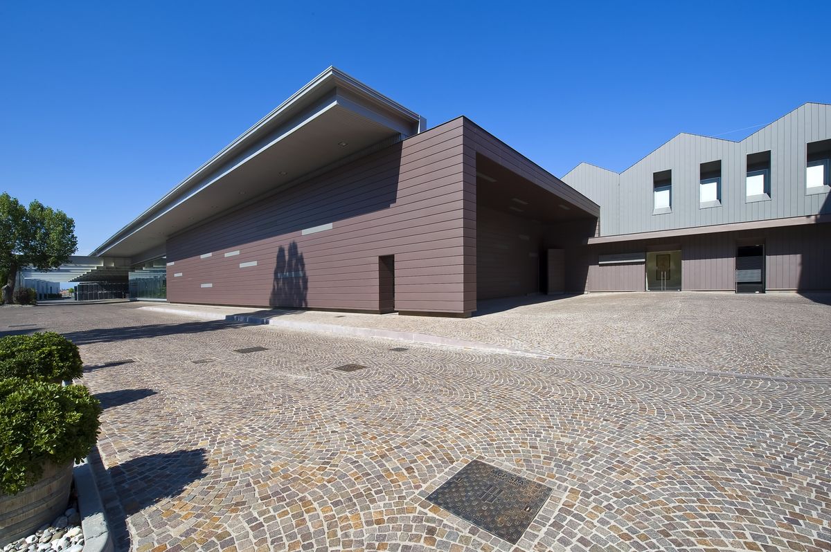 La geometria solida, nata per collegare e integrare i diversi blocchi produttivi esistenti, si rivela attraverso i materiali e i colori, che nella loro autenticità ricalcano le scelte di qualità dell’azienda. A iniziare dalle doghe di zinco-titanio. Corrono verticali, nella parte bassa della facciata fino ad altezza uomo, e sono caratterizzate dal pigmento rosso terra, a richiamare il colore del vino. Nella parte più alta, creando un affascinante gioco ottico, incontrano quelle di pigmento grigio, che invece fuggono in verticale verso il cielo.