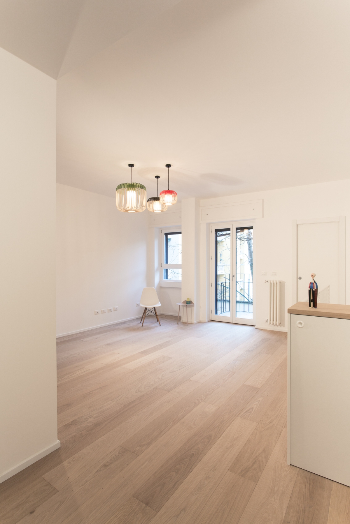 Una vecchia portineria e un appartamento al primo piano di un edificio degli anni Trenta convertiti da Plus Ultra studio in un duplex con giardino. La casa, di ispirazione scandinava, si presenta come un insieme di volumi puri in cui dominano il bianco e il legno di rovere in contrasto con alcuni elementi dal carattere più grafico, tra cui la scala in ferro e il pavimento di cucina e bagno.