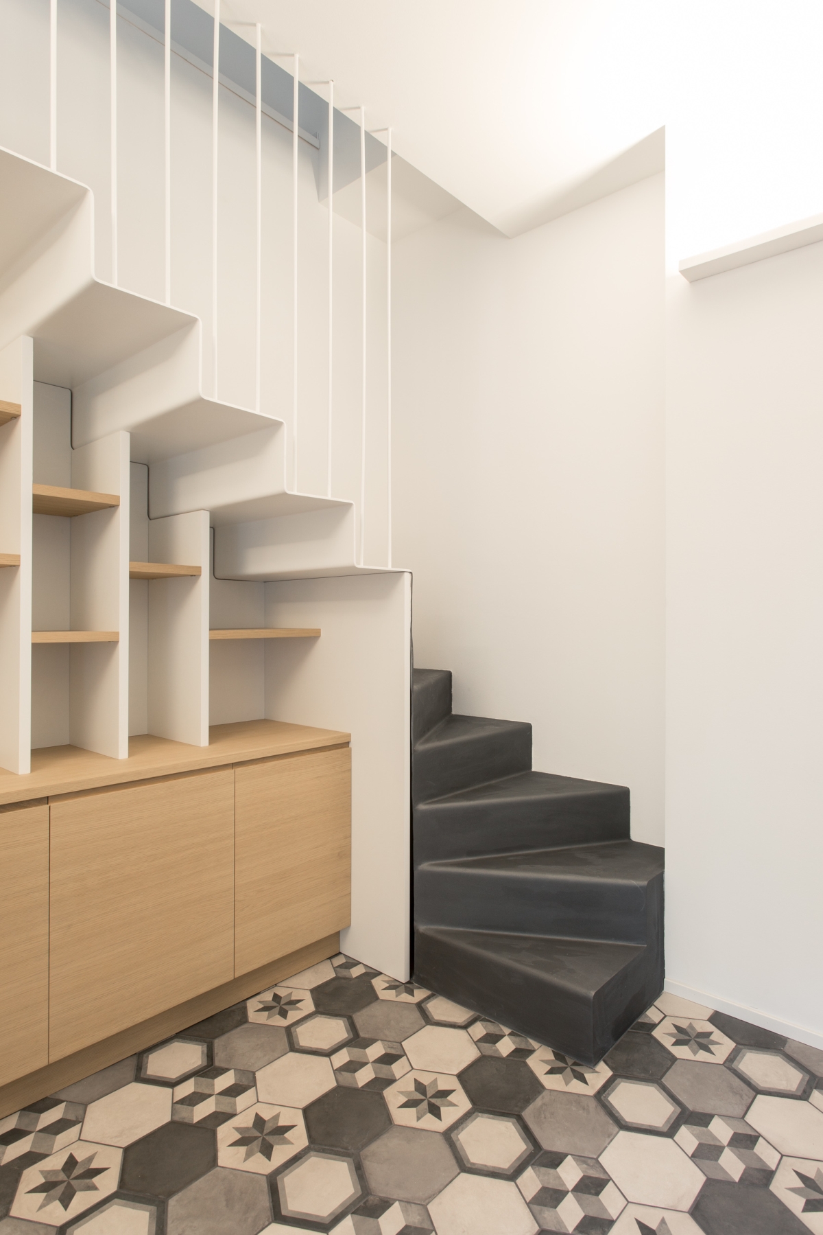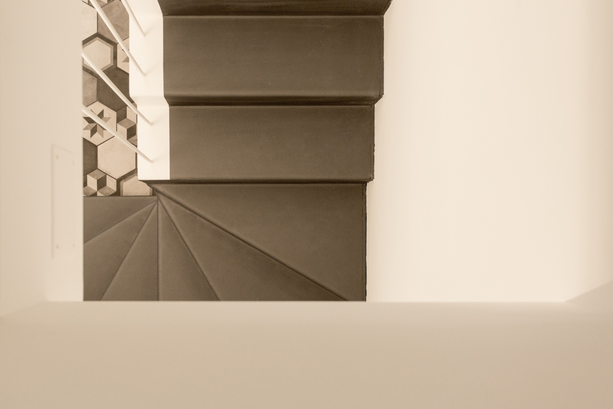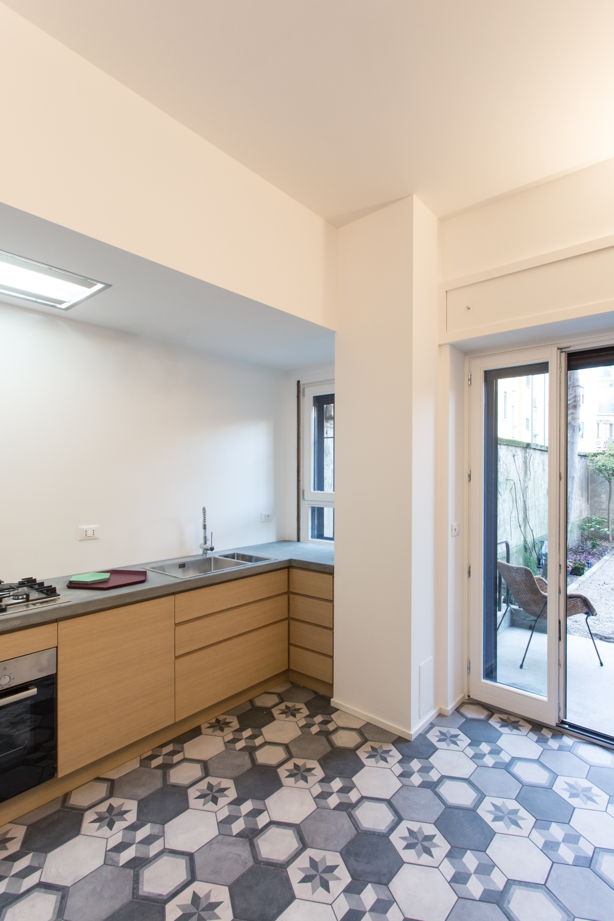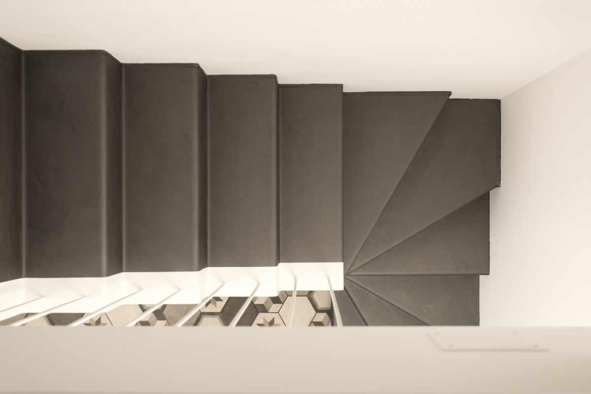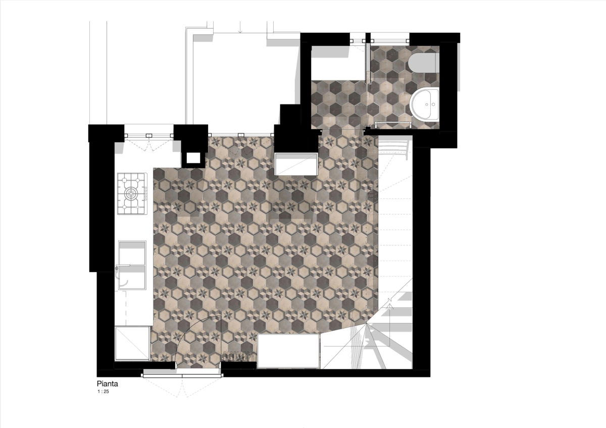 l due piani sono collegati da una scala in metallo, caratterizzata da una finitura grezza su alzate e pedate e da un parapetto in lamiera forata al primo piano e tendini in ferro al piano terra smaltati di bianco. Gli arredi della cucina sono disegnati su misura: il mobile sottoscala segue il passo dei gradini con un disegno random degli elementi orizzontali; la cucina presenta un piano in cemento, che riprende la pavimentazione in cementine esagonali Marca Corona, e ante in rovere in accordo con il pavimento in parquet del primo piano.