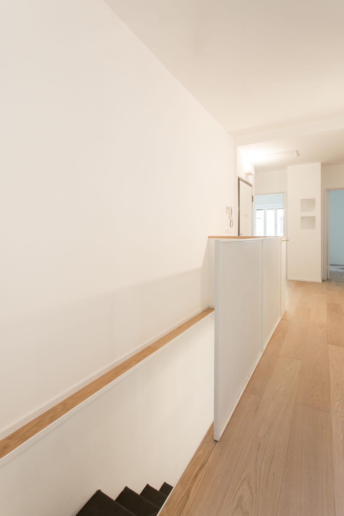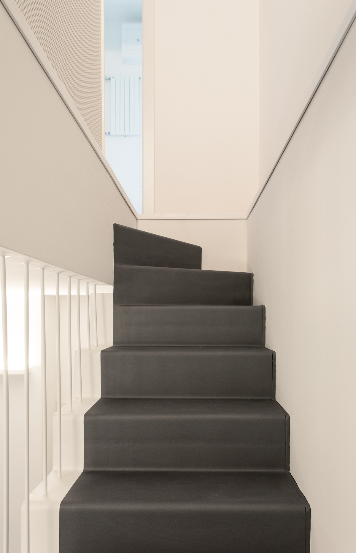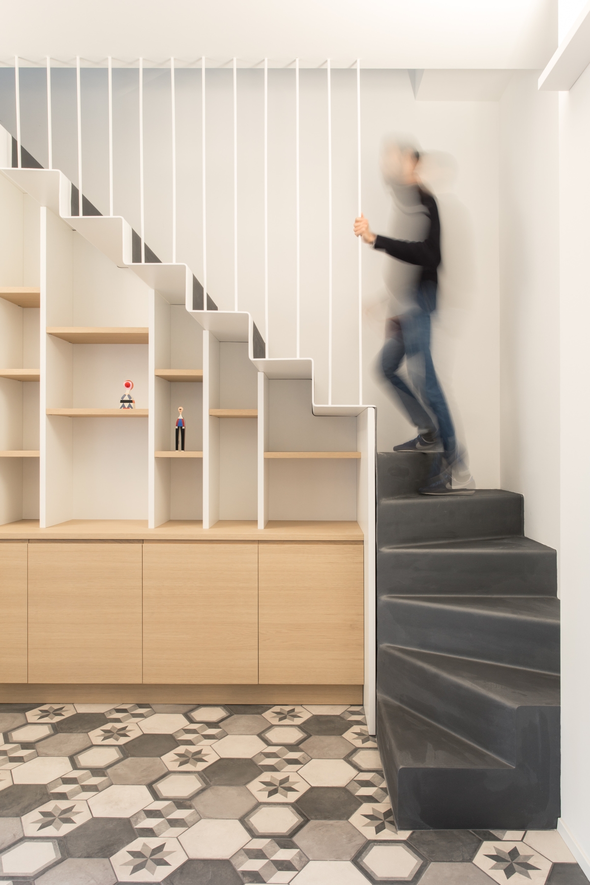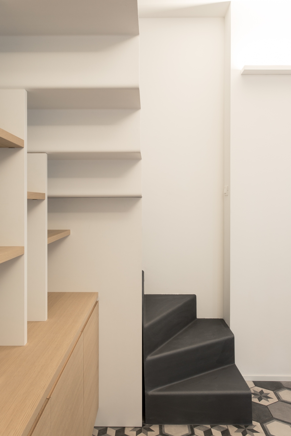 l due piani sono collegati da una scala in metallo, caratterizzata da una finitura grezza su alzate e pedate e da un parapetto in lamiera forata al primo piano e tendini in ferro al piano terra smaltati di bianco. Gli arredi della cucina sono disegnati su misura: il mobile sottoscala segue il passo dei gradini con un disegno random degli elementi orizzontali; la cucina presenta un piano in cemento, che riprende la pavimentazione in cementine esagonali Marca Corona, e ante in rovere in accordo con il pavimento in parquet del primo piano.