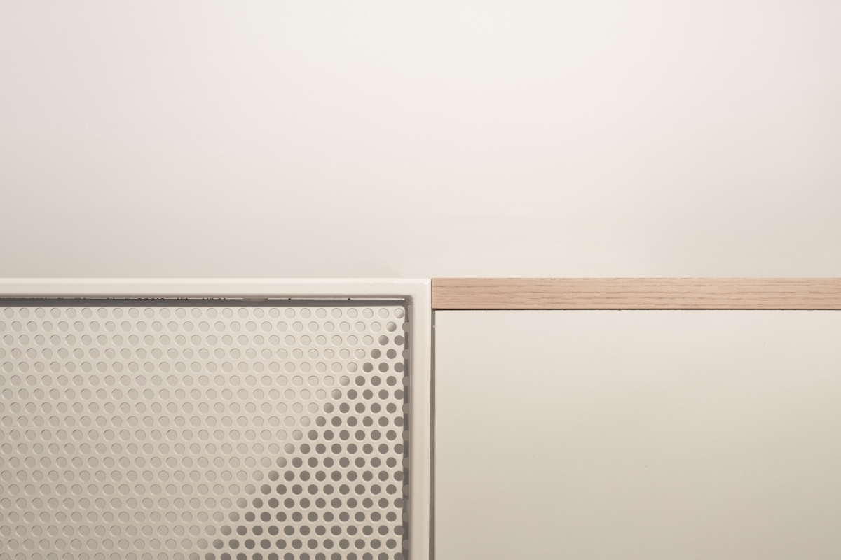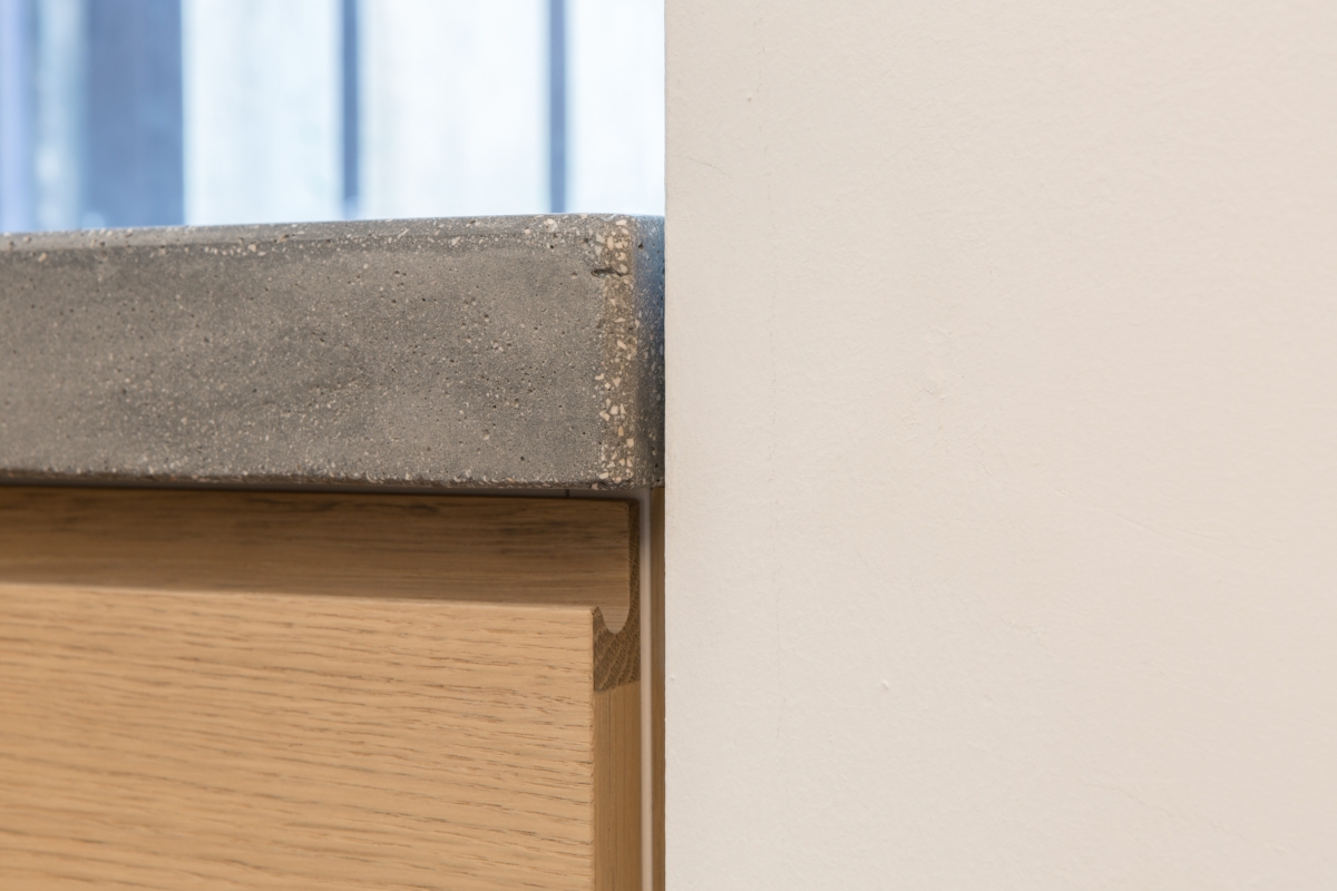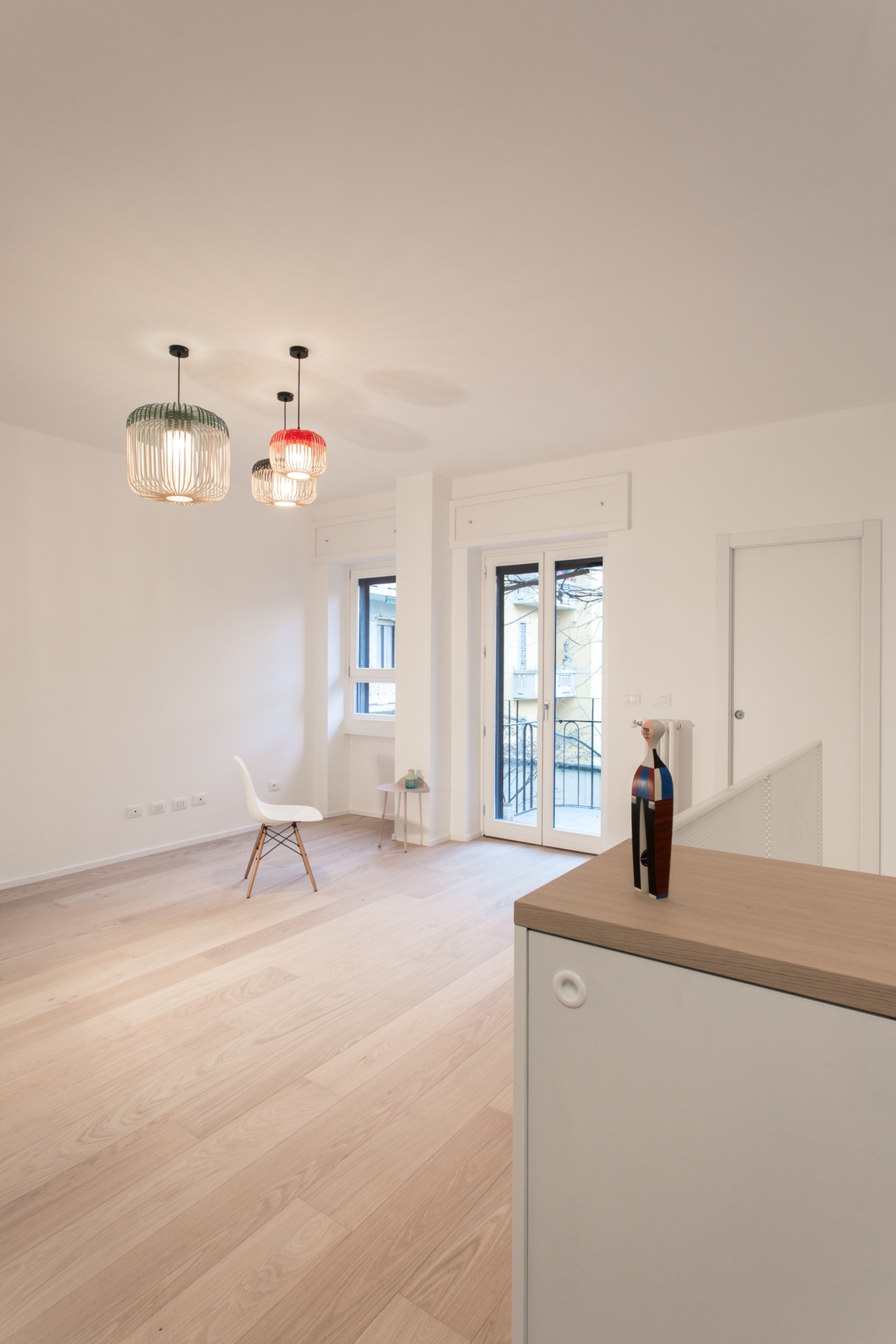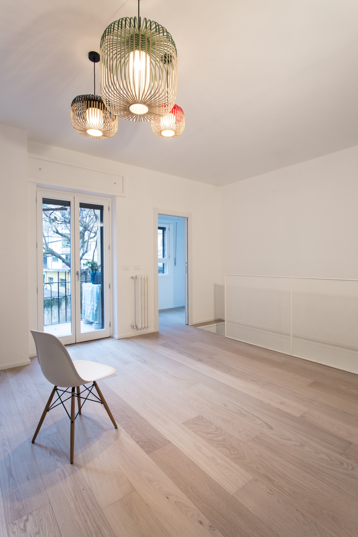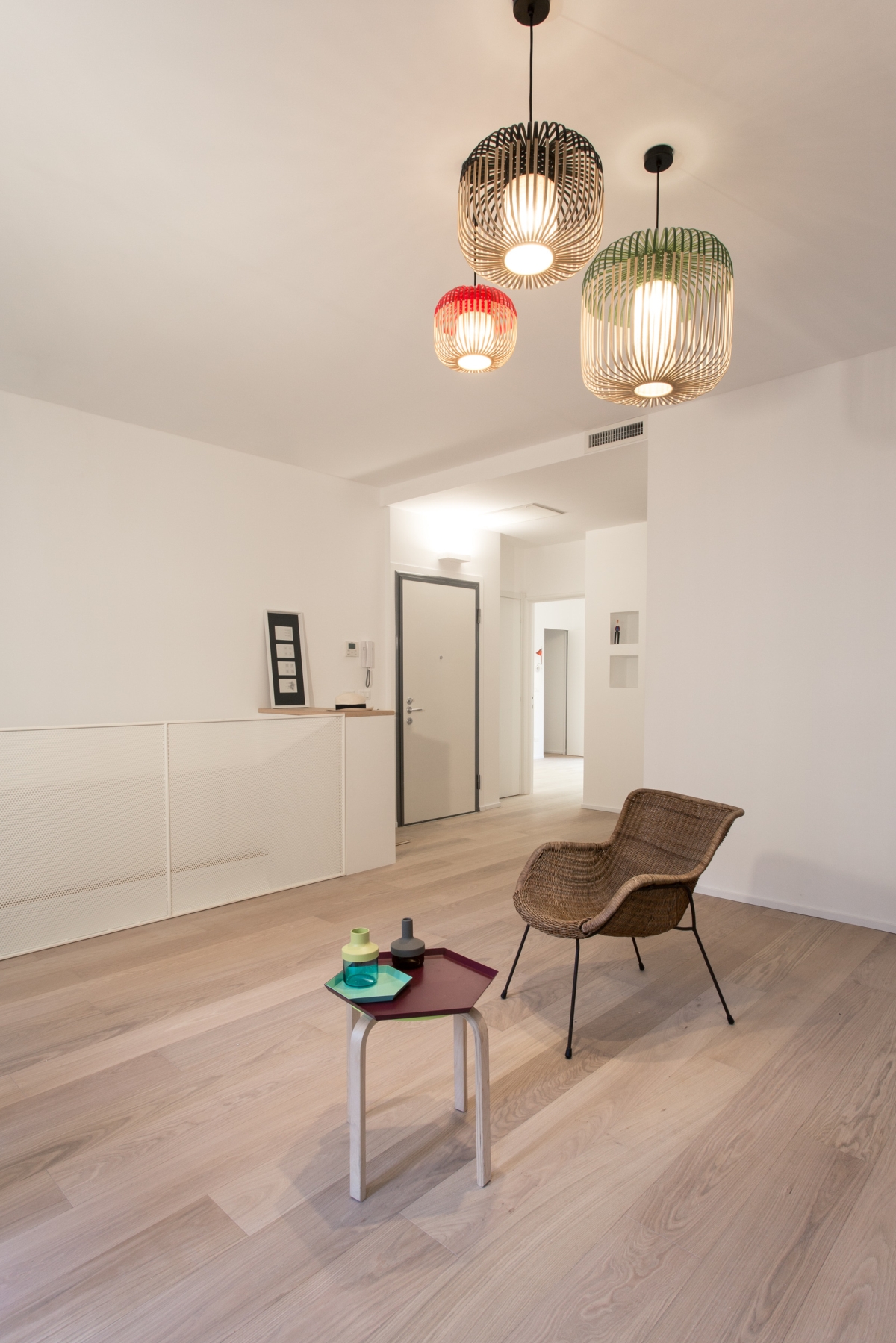 l due piani sono collegati da una scala in metallo, caratterizzata da una finitura grezza su alzate e pedate e da un parapetto in lamiera forata al primo piano e tendini in ferro al piano terra smaltati di bianco. Gli arredi della cucina sono disegnati su misura: il mobile sottoscala segue il passo dei gradini con un disegno random degli elementi orizzontali; la cucina presenta un piano in cemento, che riprende la pavimentazione in cementine esagonali Marca Corona, e ante in rovere in accordo con il pavimento in parquet del primo piano.