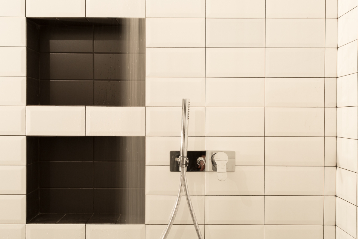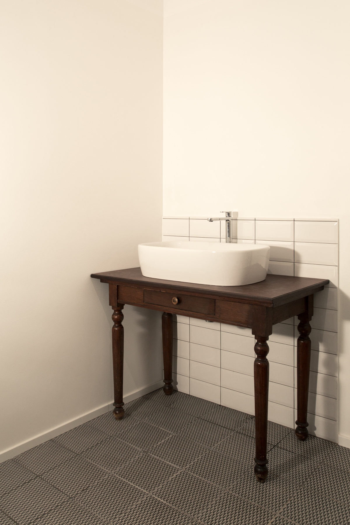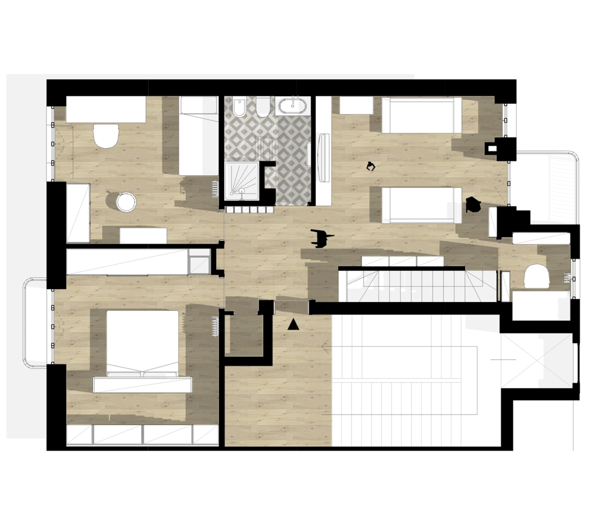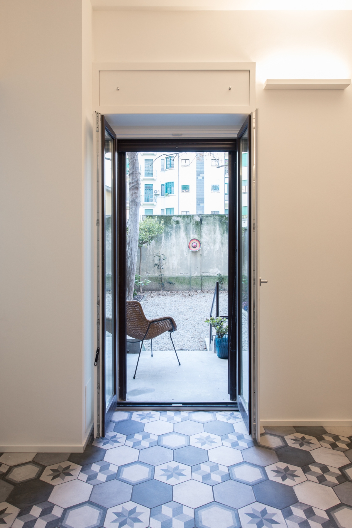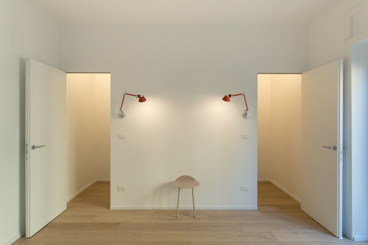 Al primo piano, la zona notte affaccia su strada ed è separata dal soggiorno dalla zona d’ingresso e dal blocco del bagno. Quest’ultimo è caratterizzato da un disegno geometrico di piastrelle bianche e grigie e pavimento in Azulej trama di Mutina.