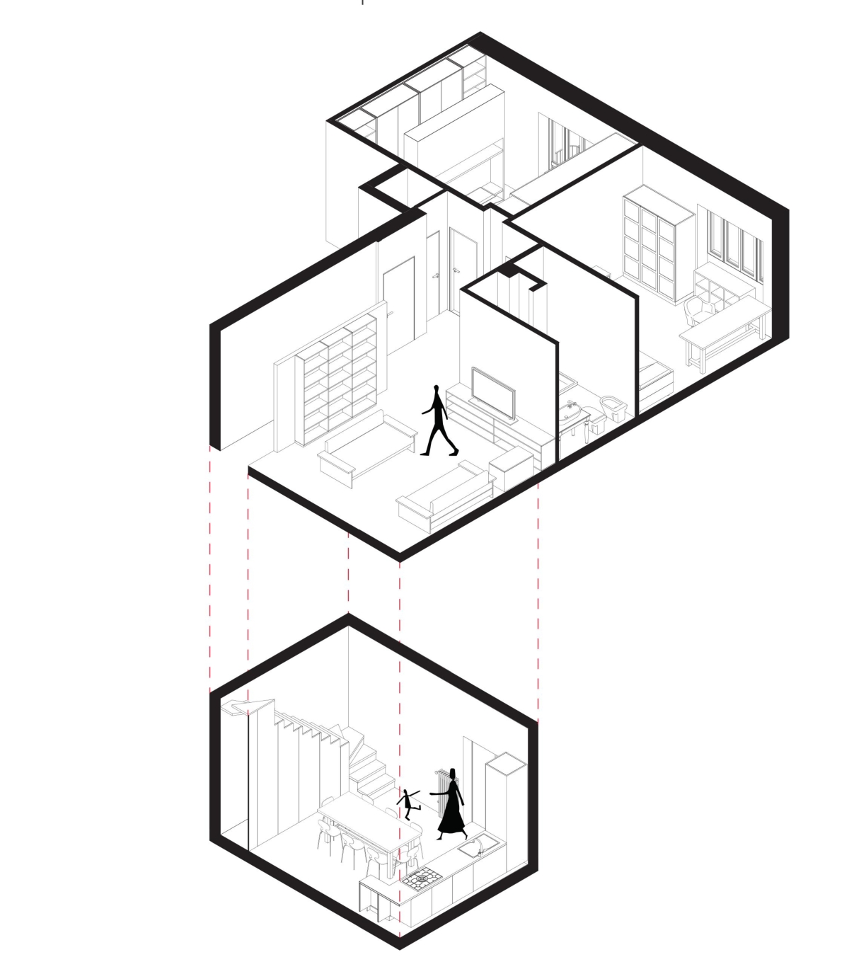 La zona giorno, articolata su due livelli, affaccia verso il giardino: al piano terra la demolizione dei tramezzi esistenti ha consentito di realizzare un’ampia cucina con accesso diretto al giardino: al primo piano sono invece collocati il soggiorno e lo studiolo di uno dei committenti, graphic designer.