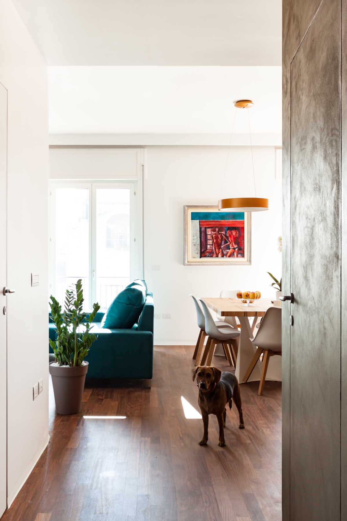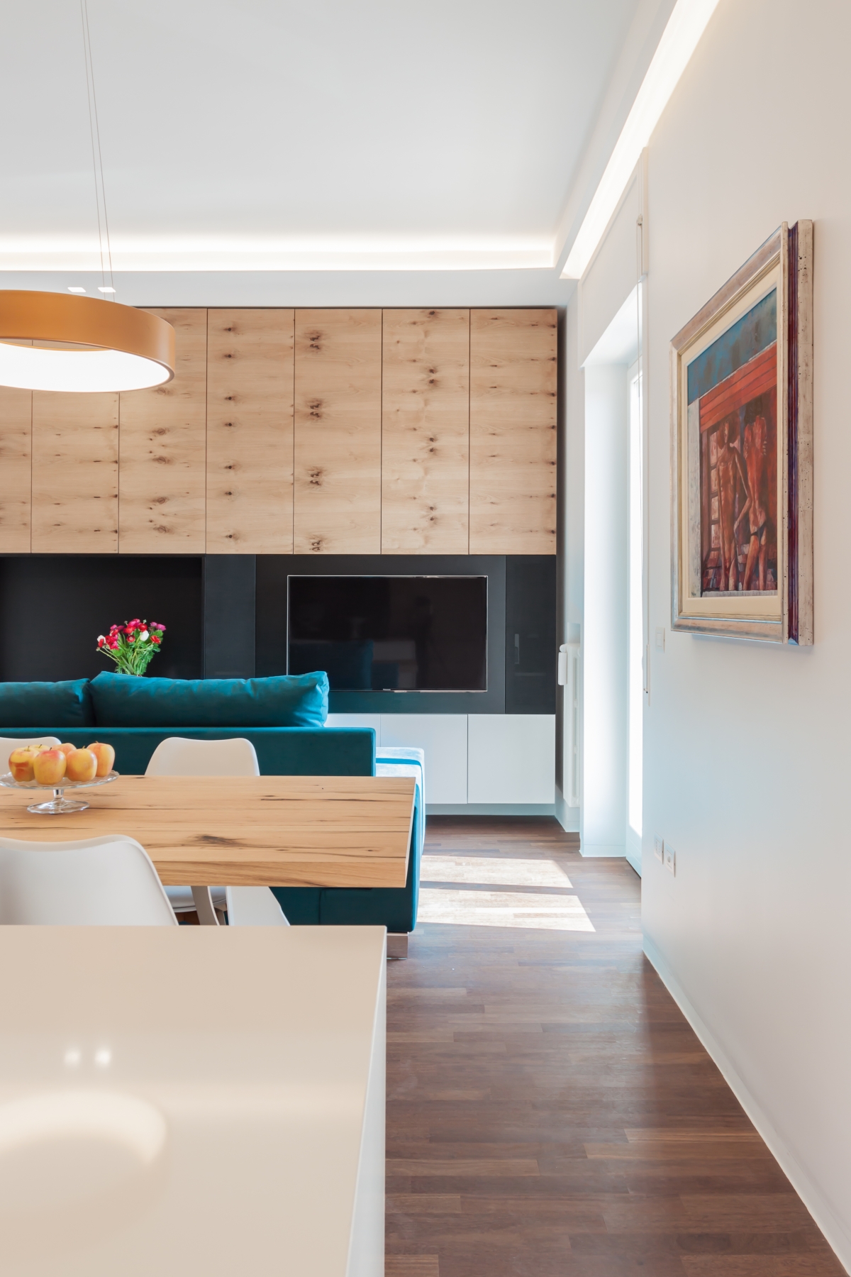 L’intervento di ristrutturazione ha avuto come focus quello di creare una netta distinzione tra zona notte e zona giorno. Le aperture sono infatti state nascoste da un muro che si apre tramite una porta quasi invisibile su un disimpegno che porta al bagno padronale, alla cabina armadio e alla camera da letto. In questo modo, chi entra, si trova davanti a un “passaggio obbligato” tutto color bronzo, che porta visivamente e in maniera immediata all’ampia zona giorno, studiata come un open space e costituita da una cucina a tutta altezza in rovere naturale e Stone Italiana nella variante Superwhite, resa dinamica da un divano color ottanio che rompe visivamente la simmetria di colori.