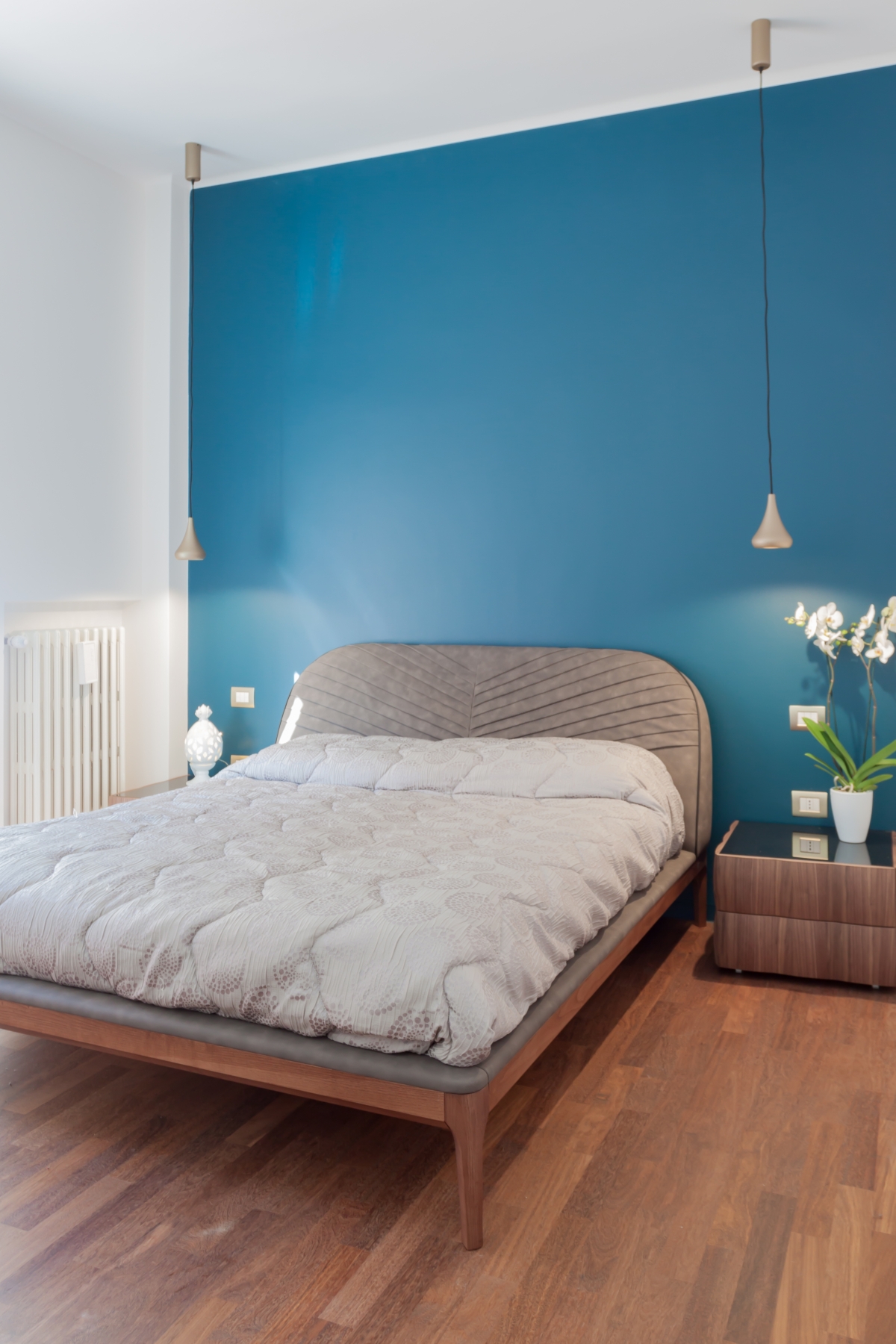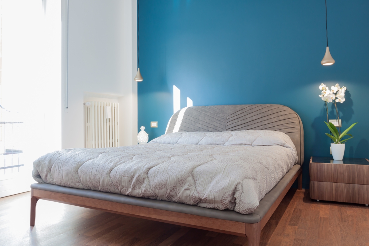 La stessa raffinata palette di colori viene replicata nella zona notte. Nella camera da letto infatti, troviamo il colore ottanio applicato alla parete principale, contrapposta alla morbidezza visiva e materica di un letto in suede testa di moro. Cassettiera e comodini in noce riportano in superficie un distinto vetro nero. Il bronzo dona luce attraverso le sospensioni.