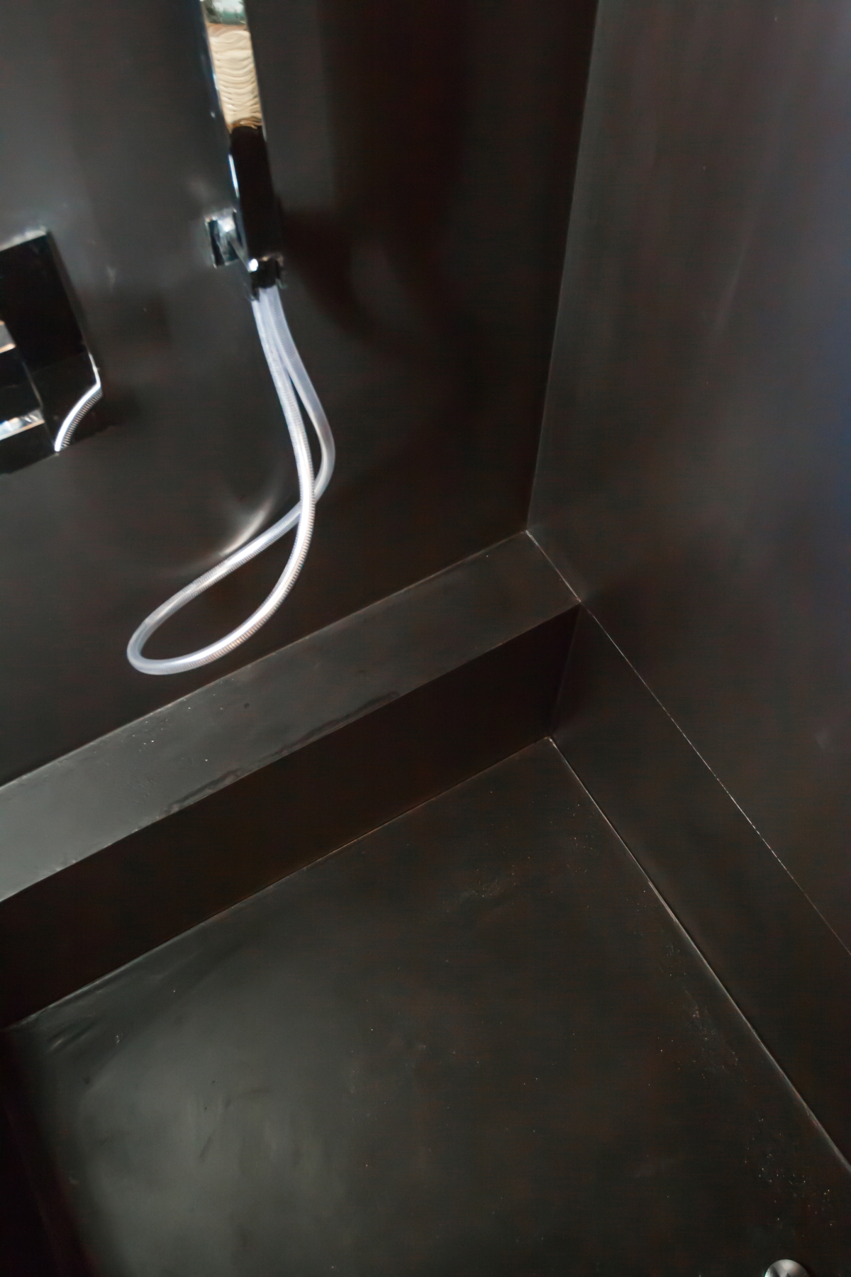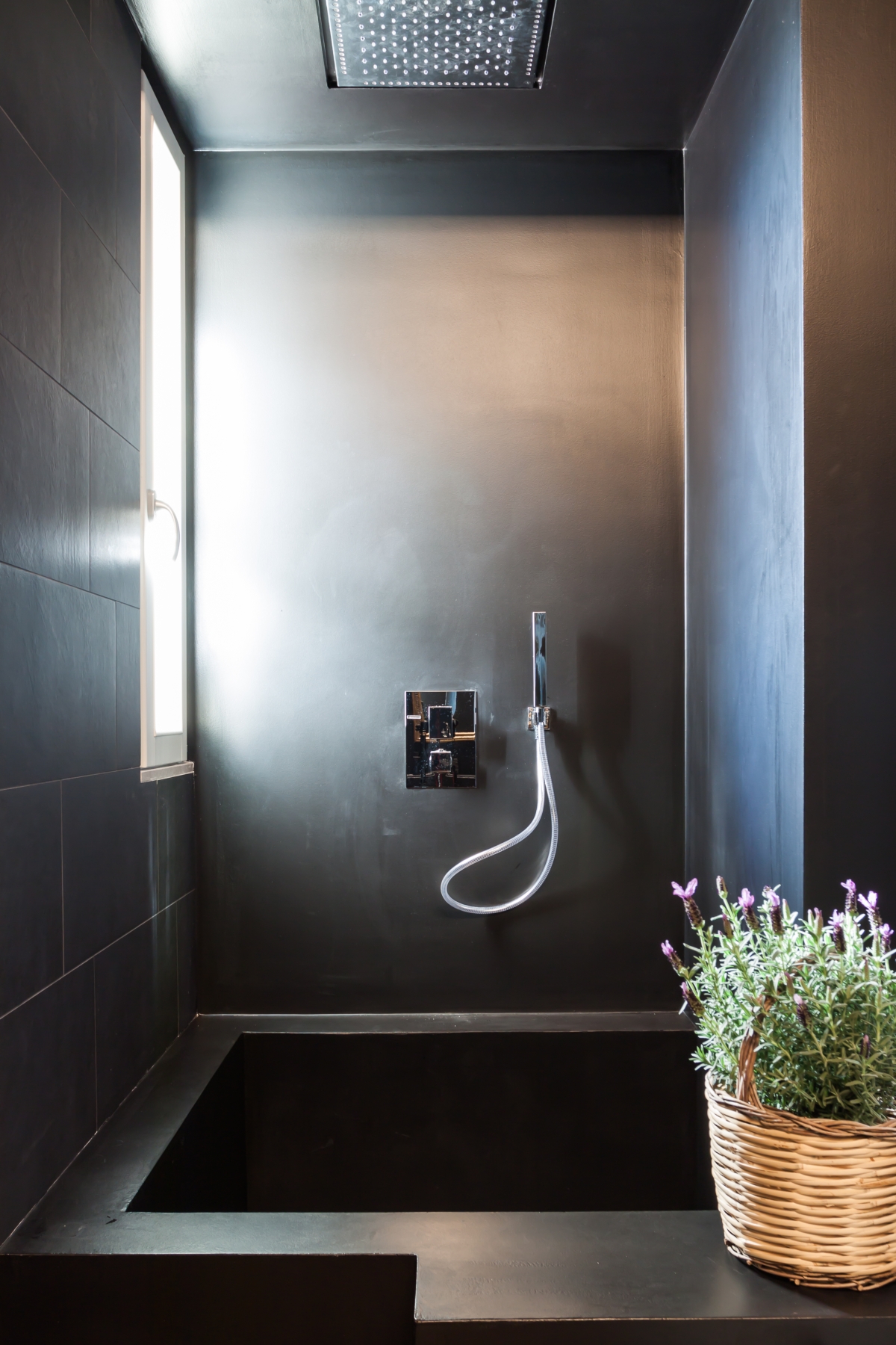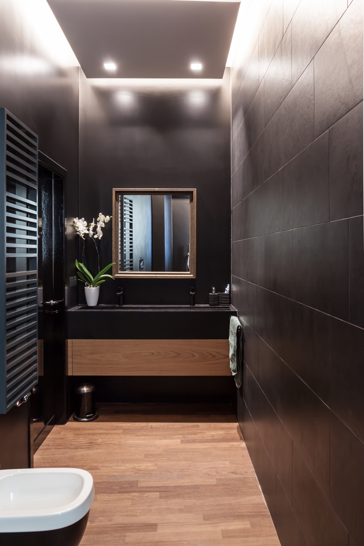 Il nero torna protagonista assoluto del bagno padronale: i toni scuri del rivestimento in grès e della resina nera, abbinati ai sanitari “vestiti” con gli stessi colori, regalano a questo ambiente una particolare unicità. Altrettanto esclusiva la scelta di realizzare in opera una grande vasca-doccia con soffione a pioggia e cromoterapia integrato a soffitto ed un lavabo con le stesse peculiarità, in cui il nero si alterna al legno. Rubinetteria e termoarredi rigorosamente neri completano il look da gran soirée.