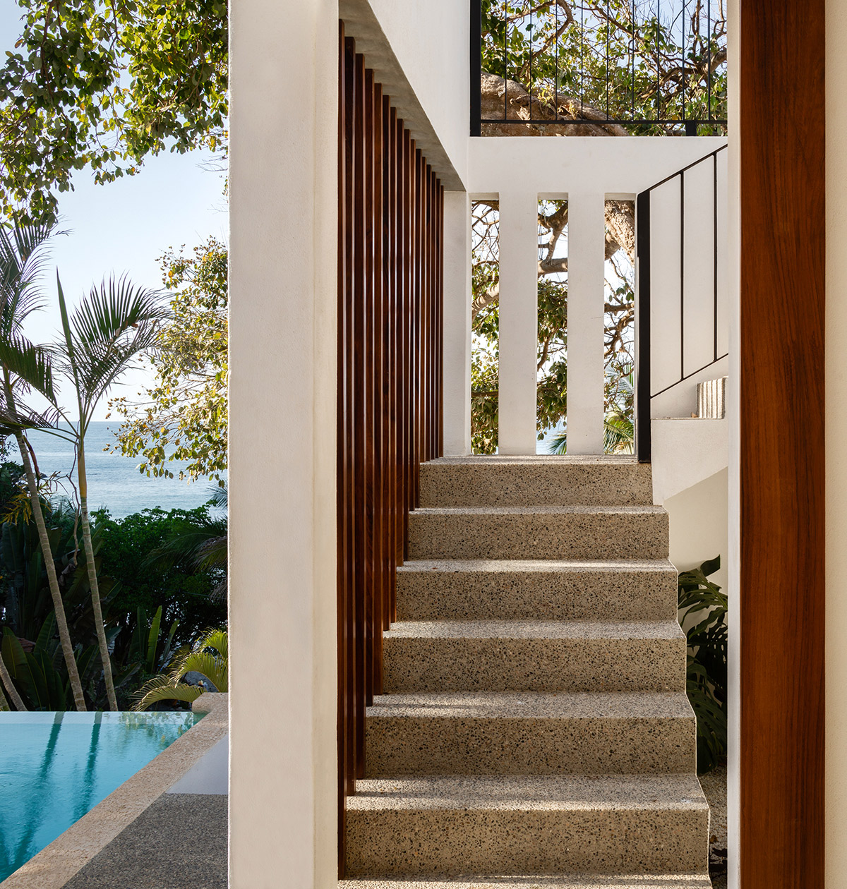 Integrando con cura l’architettura con il tranquillo paesaggio tropicale, CASA LT è stata progettata intorno ai palmeti esistenti, i mandorli, i platani e le felci, che si uniscono alla topografia del sito in giocando un ruolo chiave nel garantire una visione del lungomare da tutti i suoi spazi, sia interni che esterni.