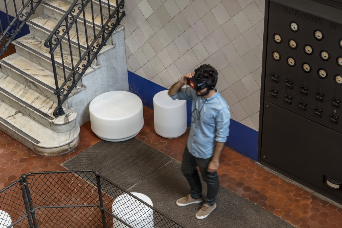Il nucleo pulsante dell’antico impianto: è qui che “si sente e si vede” l’acqua di Milano scorrere. Nel vecchio locale pompe idriche, attraverso visori 3D, il visitatore è protagonista dell’originale operatività della centrale. Tre banner verticali riprendono i pattern degli stati dell’acqua, accompagnano il visitatore ed esaltano l’altezza e i dettagli dello spazio. L’architettura esistenze è valorizzata e resa funzionale da complementi d’arredo su misura, mentre un’immensa proiezione sulla parete centrale evoca immaginari subacquei. Dal ballatoio ci si sposta all’interno del salone per fruire della ricchezza dei suoi contenuti: storici, fotografici, cartacei e anche digitali.