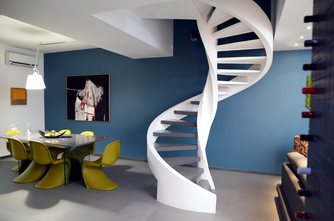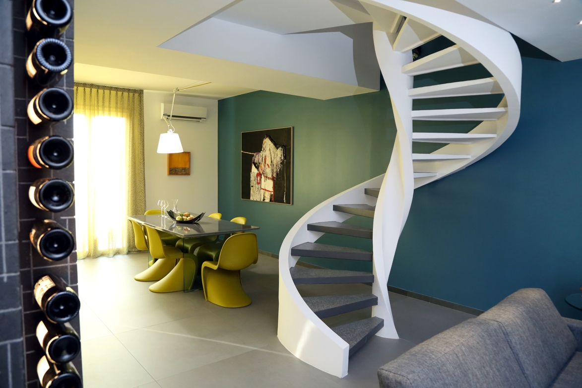 L’elemento principe è la scala di collegamento tra i due piani, tinteggiata bianca in contrasto con la parete di fondo nel colore verde ottanio, è autoportante, posta di fronte l’ingresso, divide virtualmente l’ambiente living dalla zona pranzo.