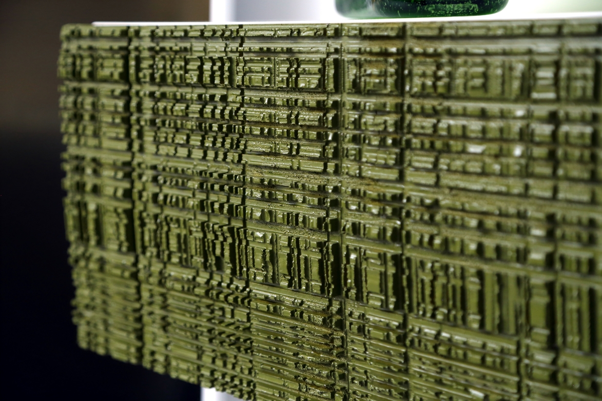 Dettaglio dei contenitori per il living, ottenuti da tavole di scarto laccate in verde per riprendere la parete opposta in moss tile.