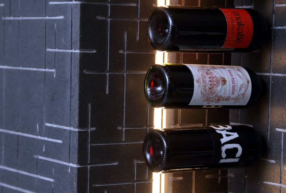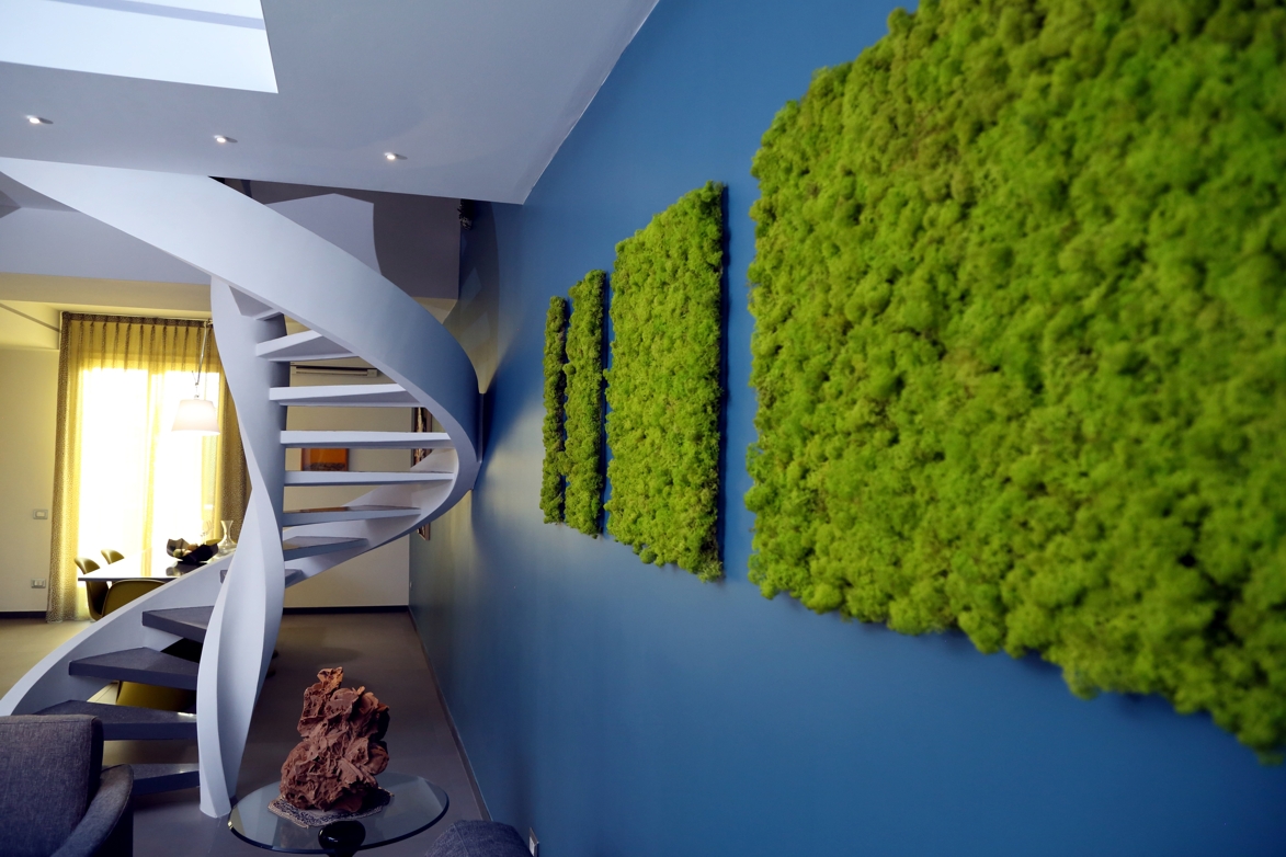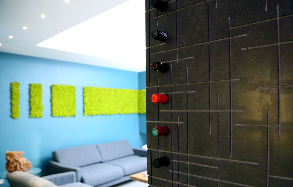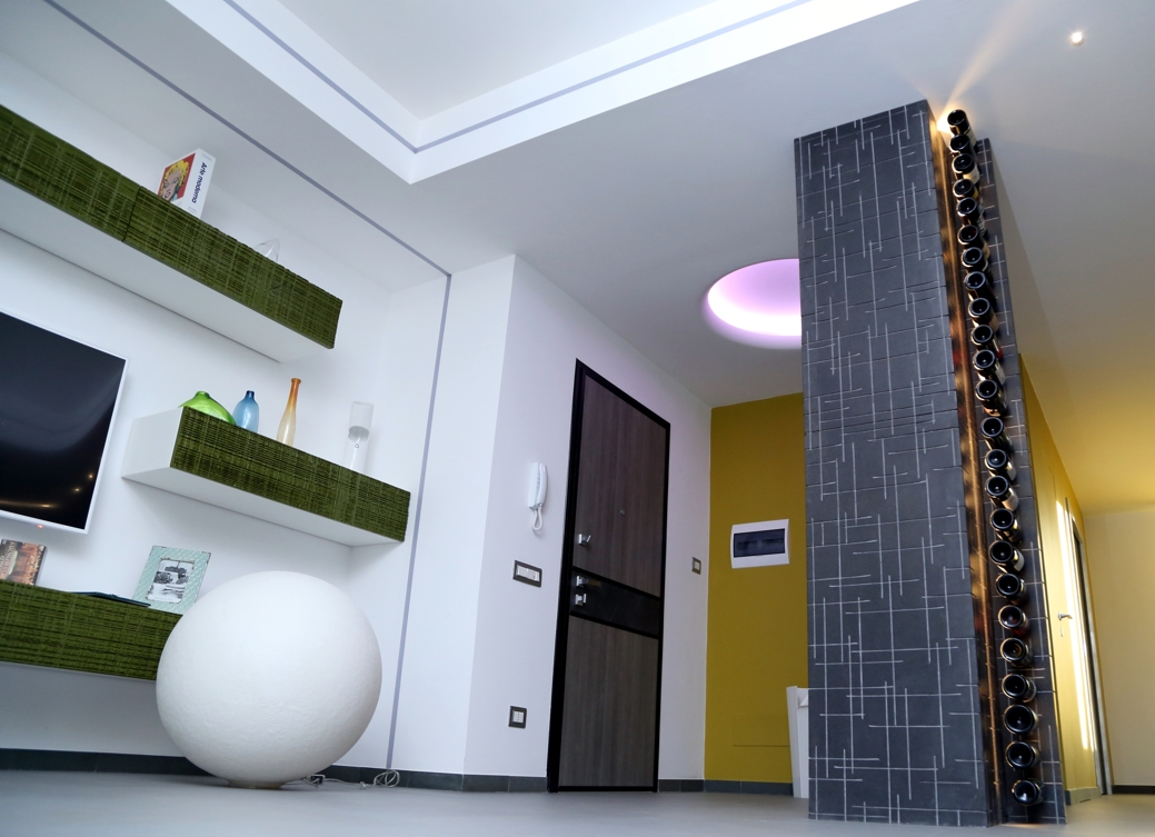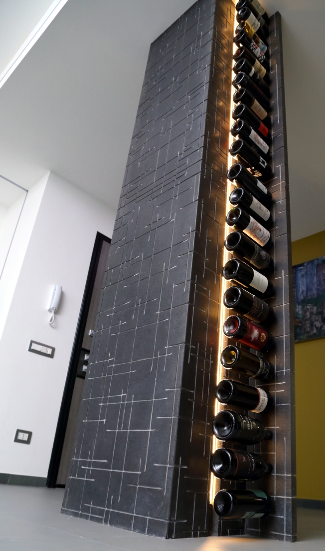Particolari del living sono dei contenitori ottenuti da tavole di scarto laccate in verde per riprendere la parete opposta in moss tile, il sistema di illuminazione filo muro, il bio camino e la colonna portabottiglie in pietra lavica del Vesuvio, lavorata su disegno del progettista.