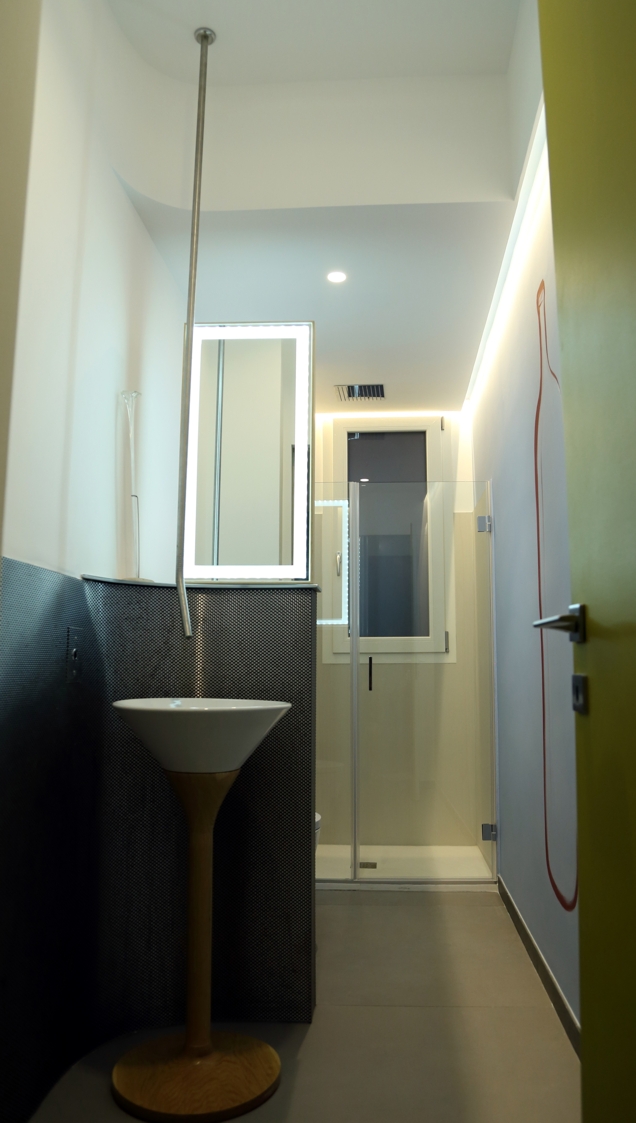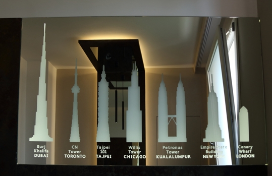 Particolarmente interessante in bagno lo specchio sabbiato e retroilluminato che raffigura i più alti grattacieli al mondo, un’idea che mira a sviluppare il brief con la committenza ed ampliare gli spazi.