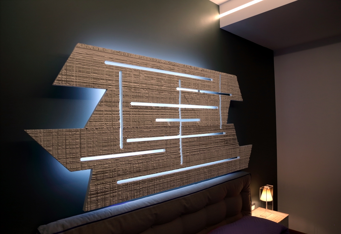 La testata del letto e i comodini sono realizzati con lo stesso legno di scarto utilizzato nel living ma con diverso design e laccati bianchi.