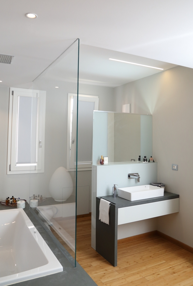 Al piano superiore la master room ha un concept open, la vasca da bagno/doccia e il lavello sono a vista mentre i sanitari sono opportunamente nascosti dietro una parete di vetro laccato e specchio, dettagli importanti per dare maggiore luminosità all’ambiente.