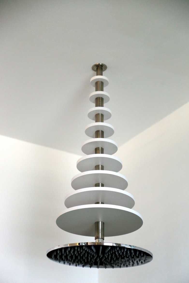 Il bagno, con porta filo muro che esaltata la maniglia Link disegnata dall’arch. Arnone per Officine Mandelli 1953, ha un altro particolare progettato, il lavabo freestanding in legno di rovere e ceramica irrorato da un tubo in acciaio collocato a soffitto con comando infrarosso. La parete che avvolge il bagno è in acciaio lavorato a rilievo di Steelcolor, mentre lo specchio retroilluminato e gli accessori bagno sono realizzati su disegno del progettista e della committenza.