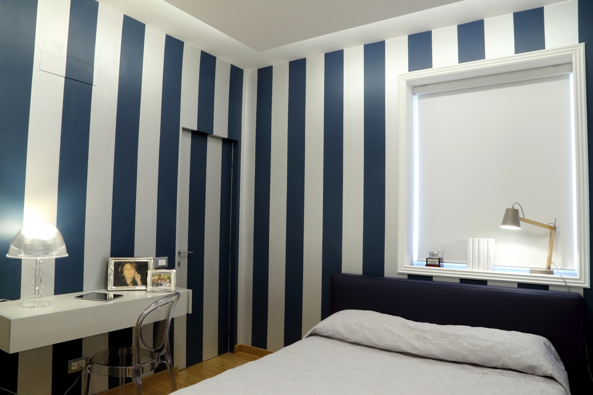 La seconda stanza da letto ha una tinteggiatura a strisce larghe nei colori argento e blue che danno eleganza e versatilità allo spazio.