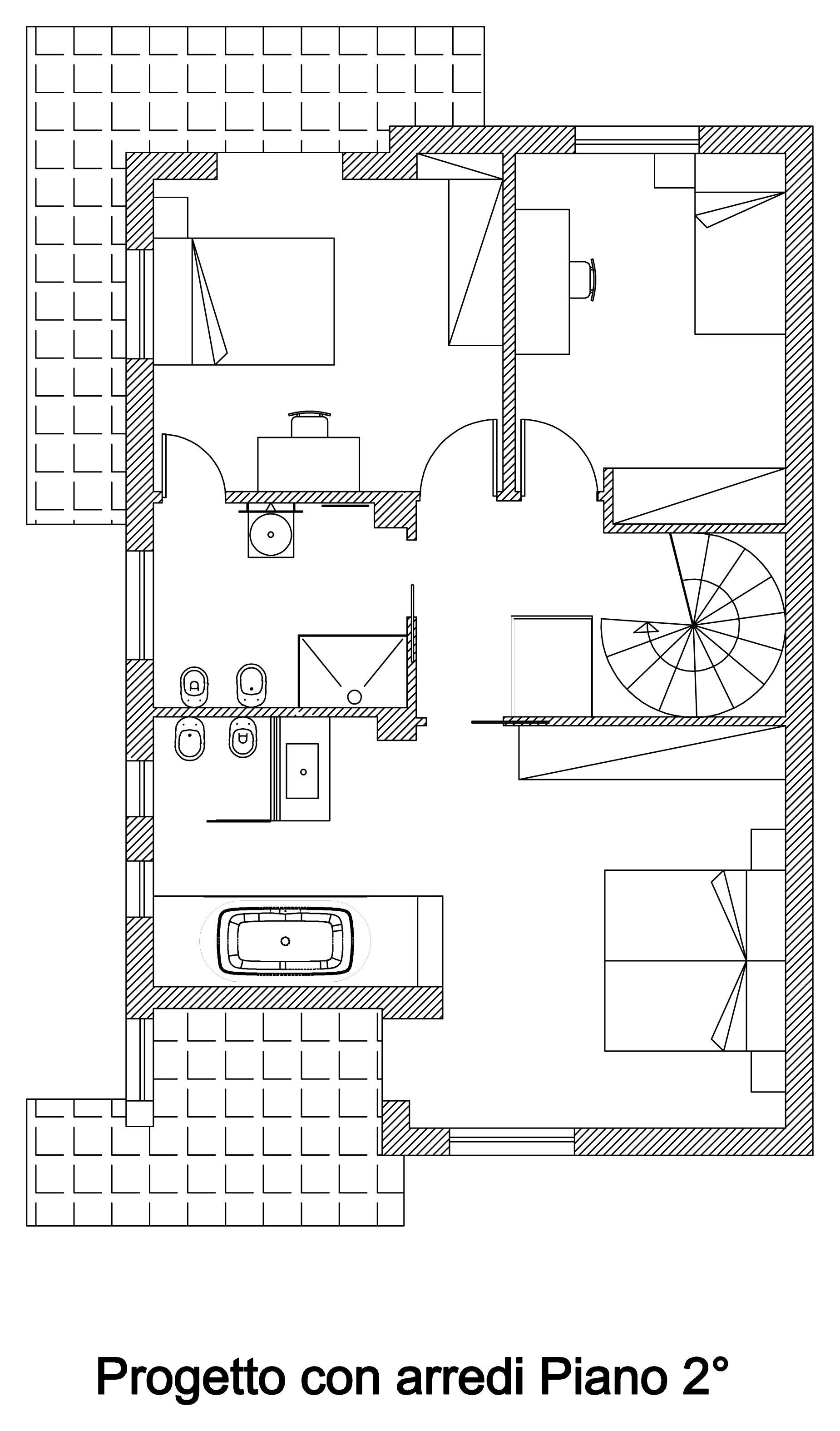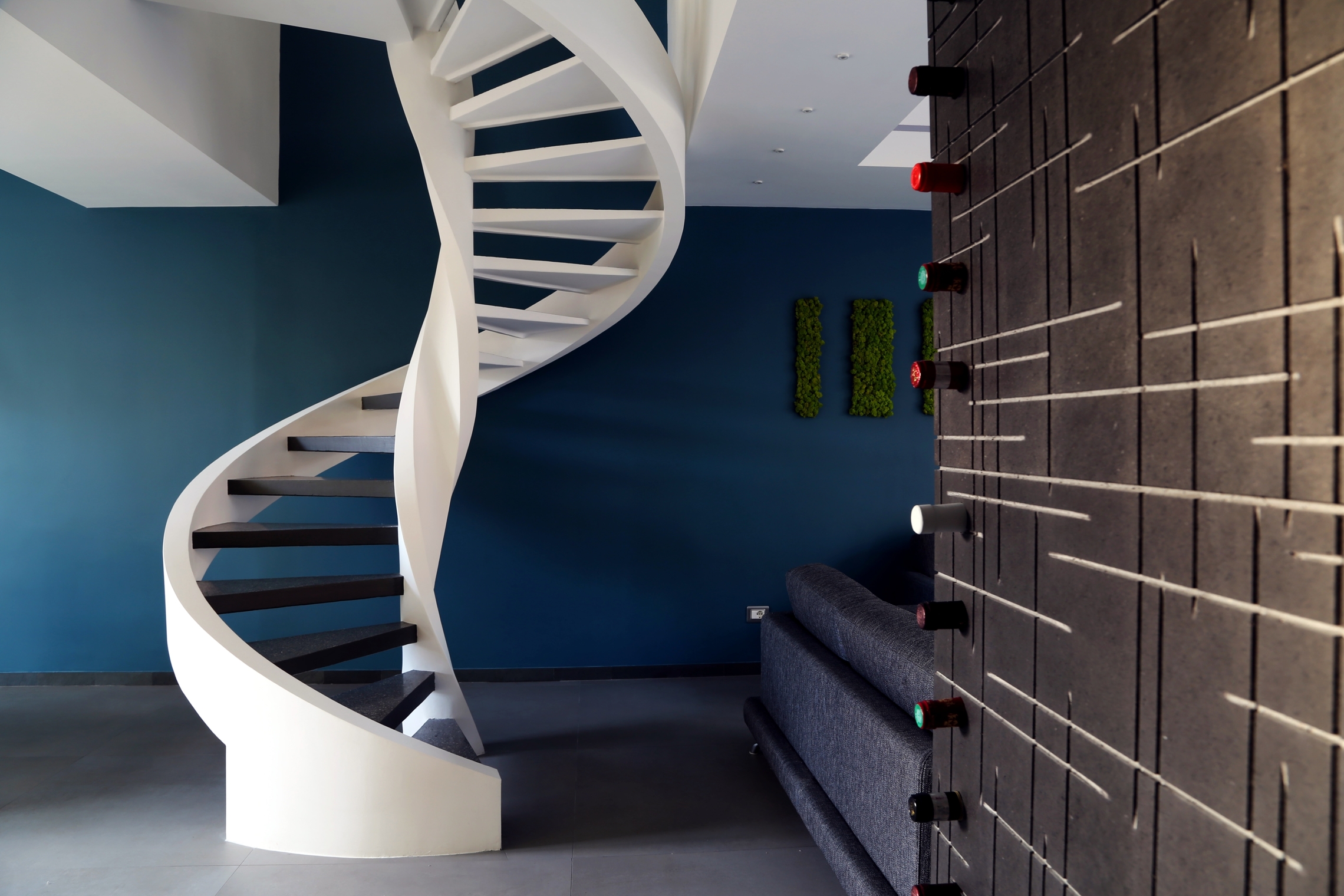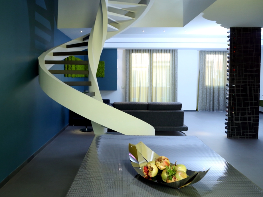 Nel complesso l’ambiente si connota per uno stile moderno, non esasperato con colori caldi e accoglienti ricco di dettagli progettati ad hoc, come parte del ballatoio in vetro che fa notare la scala elicoidale nella sua essenza e rispecchiando le esigenze della committenza.