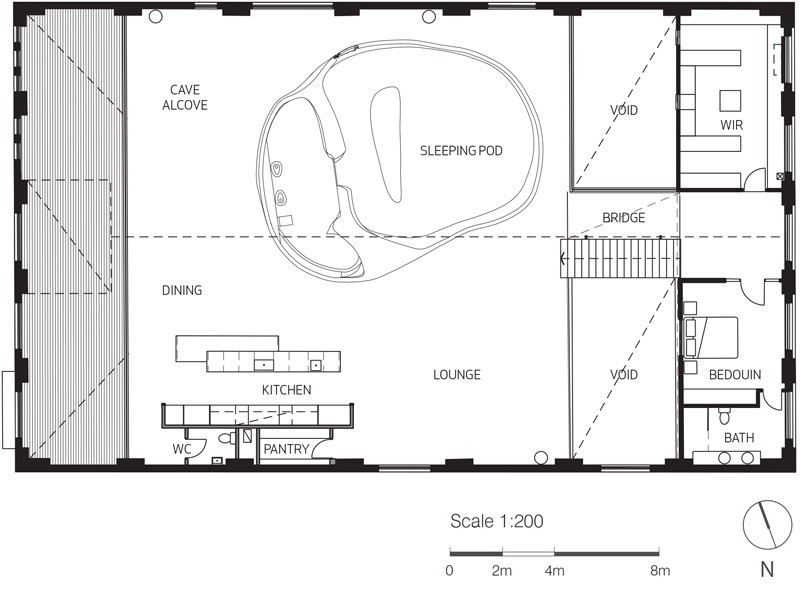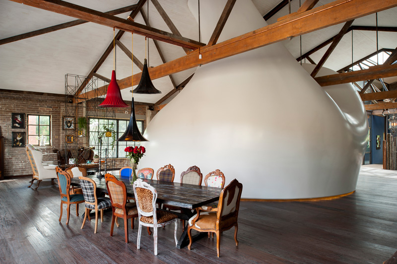 L’inserimento più interessante nel magazzino è il guscio per la camera da letto al primo piano. Questa è la suite privata del proprietario, che si inserisce come una scultura nello spazio abitativo principale, con i suoi volumi interni fluttuanti tra le capriate del tetto.