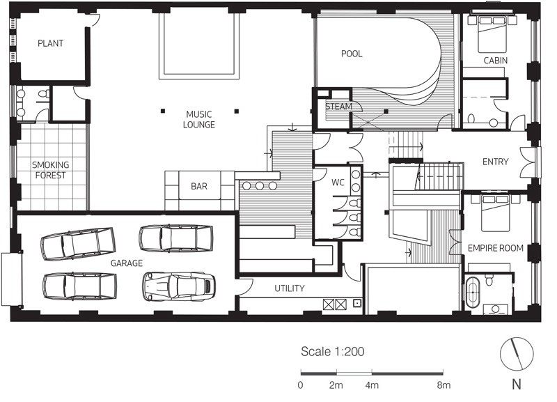 Le sezioni dell’edificio sono state radicalmente modificate per permettere l’ingresso della luce naturale e collegare spazialmente i due livelli, incorporando 4 camere da letto, una grande cucina di tipo professionale, sala musica, una piscina e una terrazza.