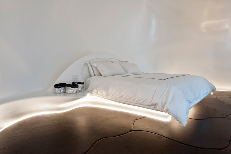 Il guscio contiene una camera da letto, con un grande letto integrato nel guscio, un armadio e un bagno. Le sue pareti sono tutti spruzzati di resina bianca, il pavimento è di piastrelle di grandi dimensioni in pelle e il pavimento del bagno è in legno di teak.