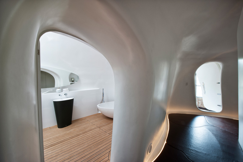 La forma estranea alla geometria ortogonale del vecchio magazzino crea nuovi spazi ma non diminuisce il senso di spazio nel magazzino. La struttura in fibra di vetro rinforzata è autoportante, poggia sul pavimento come un mobile anche se piuttosto grande e pesante.