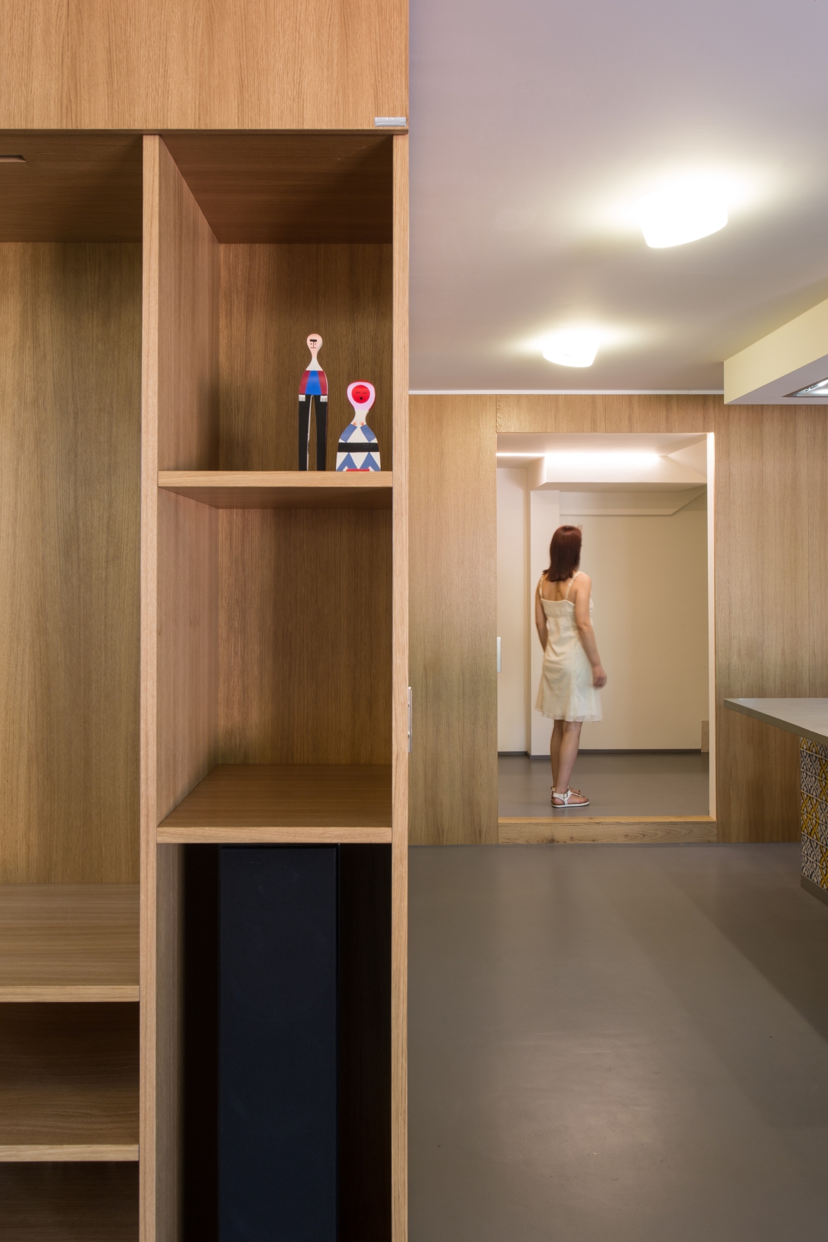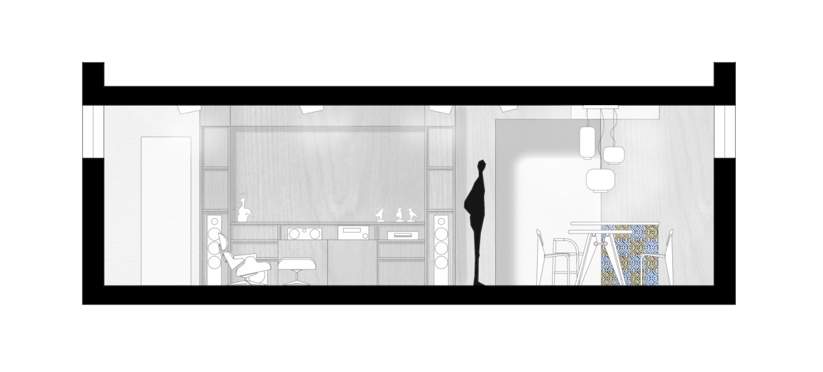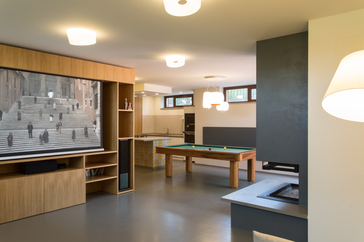 i vani accessori necessari: guardaroba, dispense e sul lato camino un armadiatura a giorno contenente il sistema home-theatre.