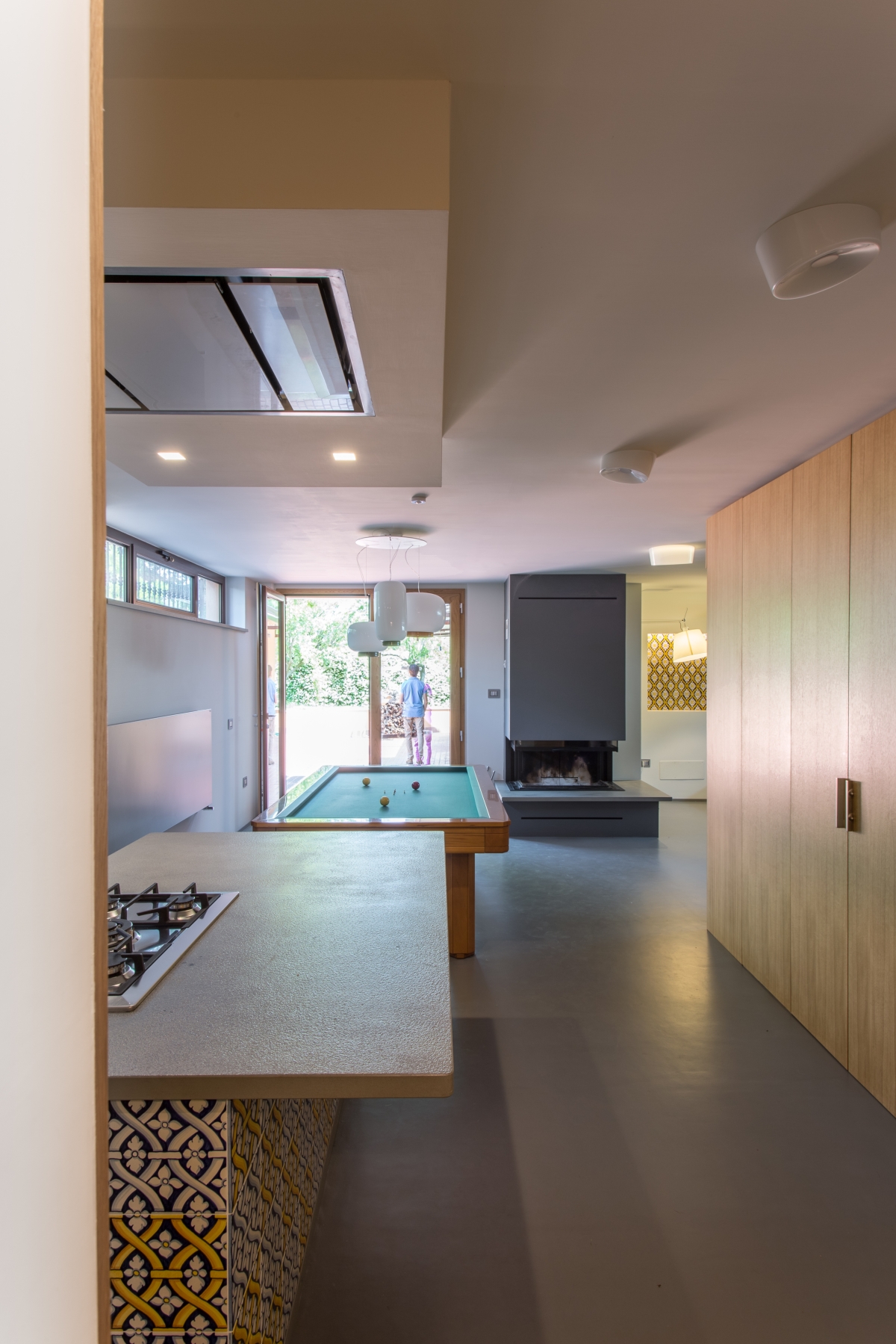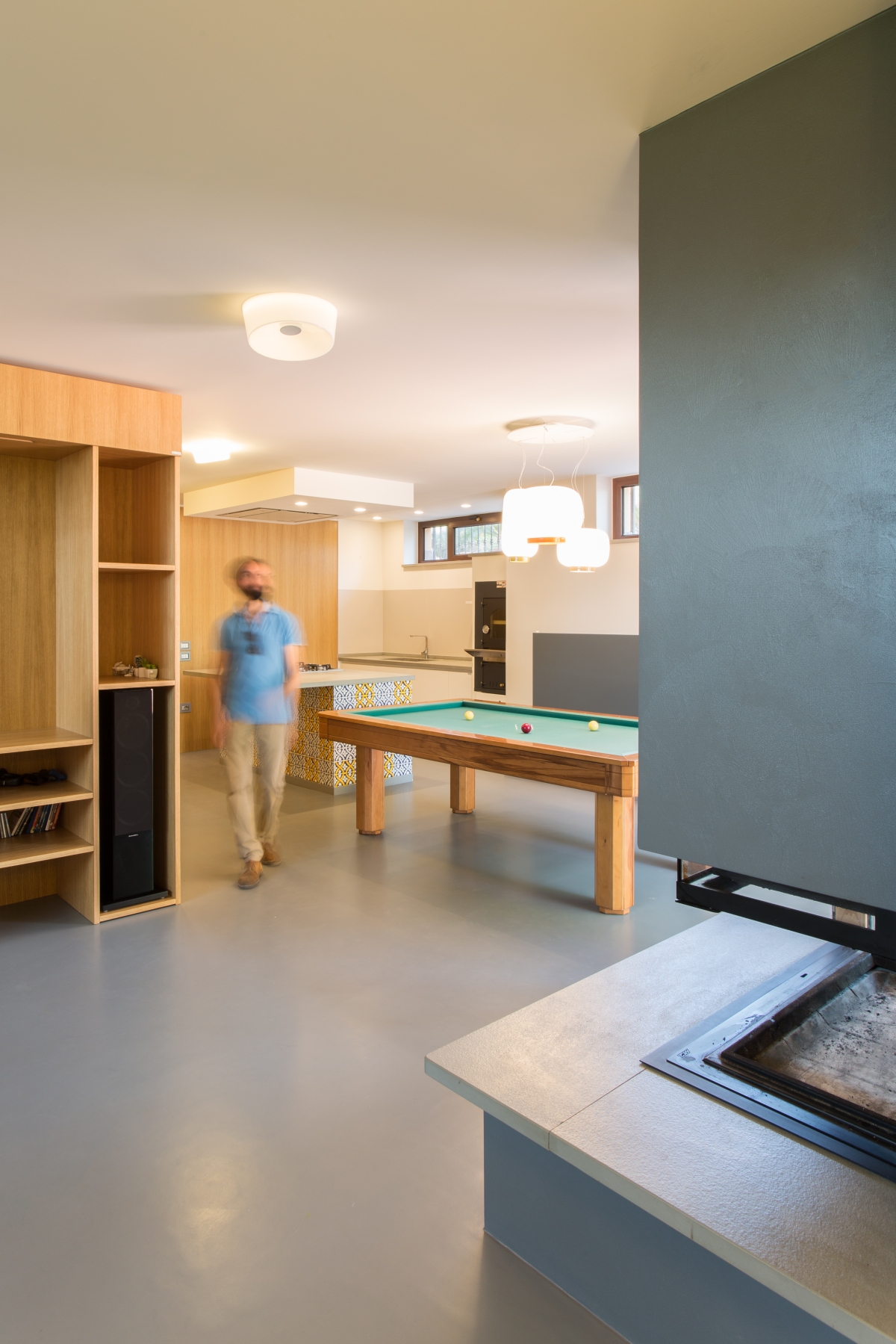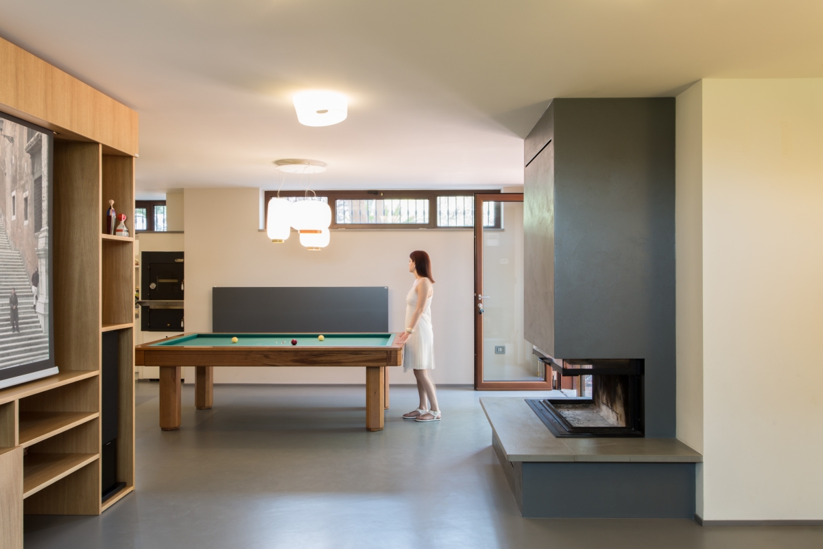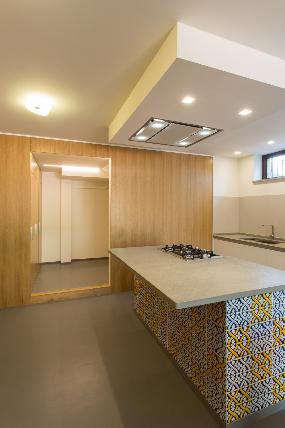 L’ambiente è caratterizzato da una pavimentazione continua in cemento-resina dai toni neutri, ripresi poi negli elementi in quarzite grigia del camino e della cucina. In assenza di elementi particolari, in questo caso il rapporto con l’esistente è diventato un rapporto con le tradizioni del territorio: i due punti focali del progetto, la cucina ad isola e lo spazio attorno al camino, sono stati caratterizzati da un rivestimento in ceramica realizzato a mano da un artigiano di Castelli, centro storico della produzione di maioliche in Abruzzo.