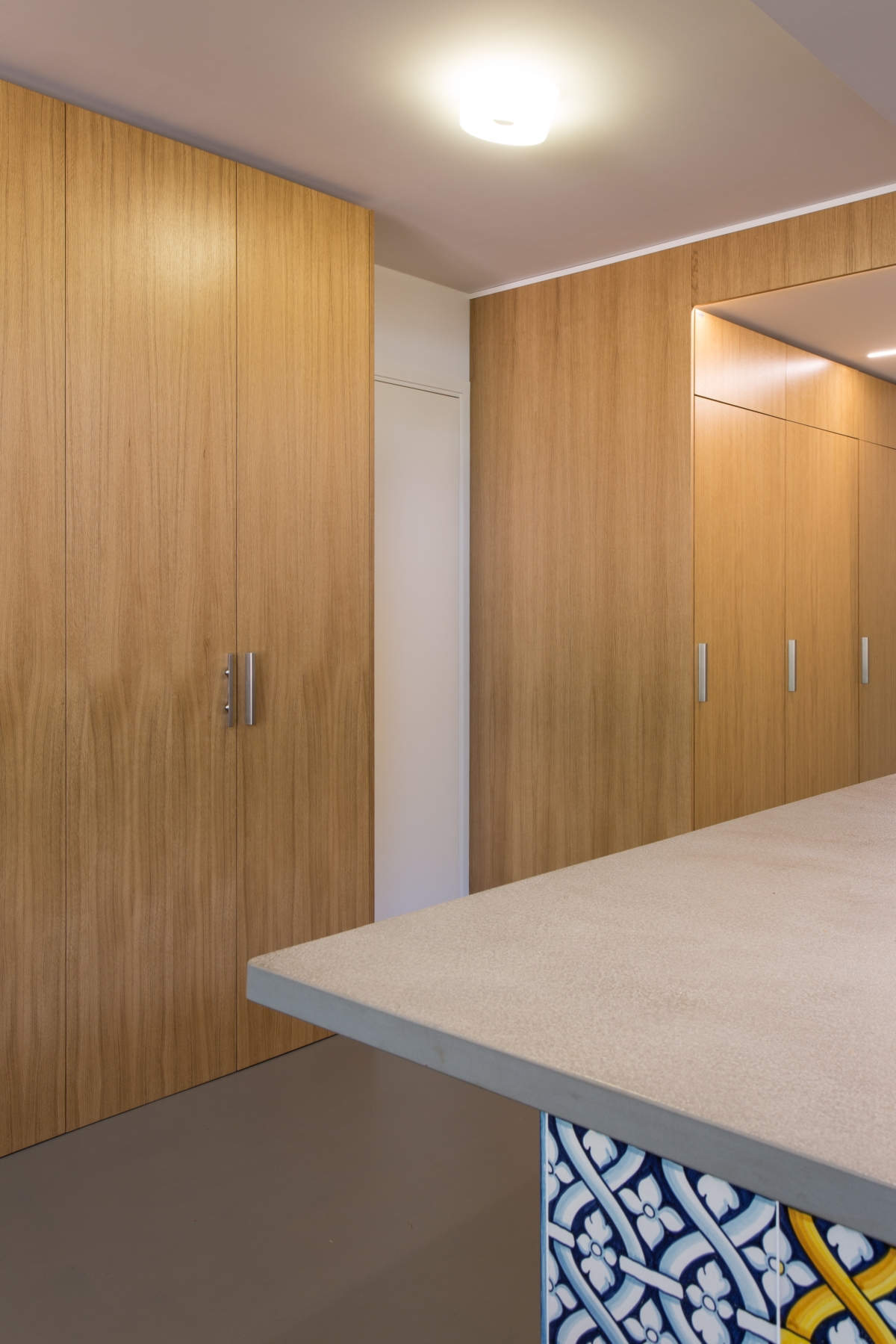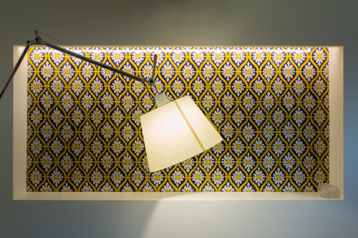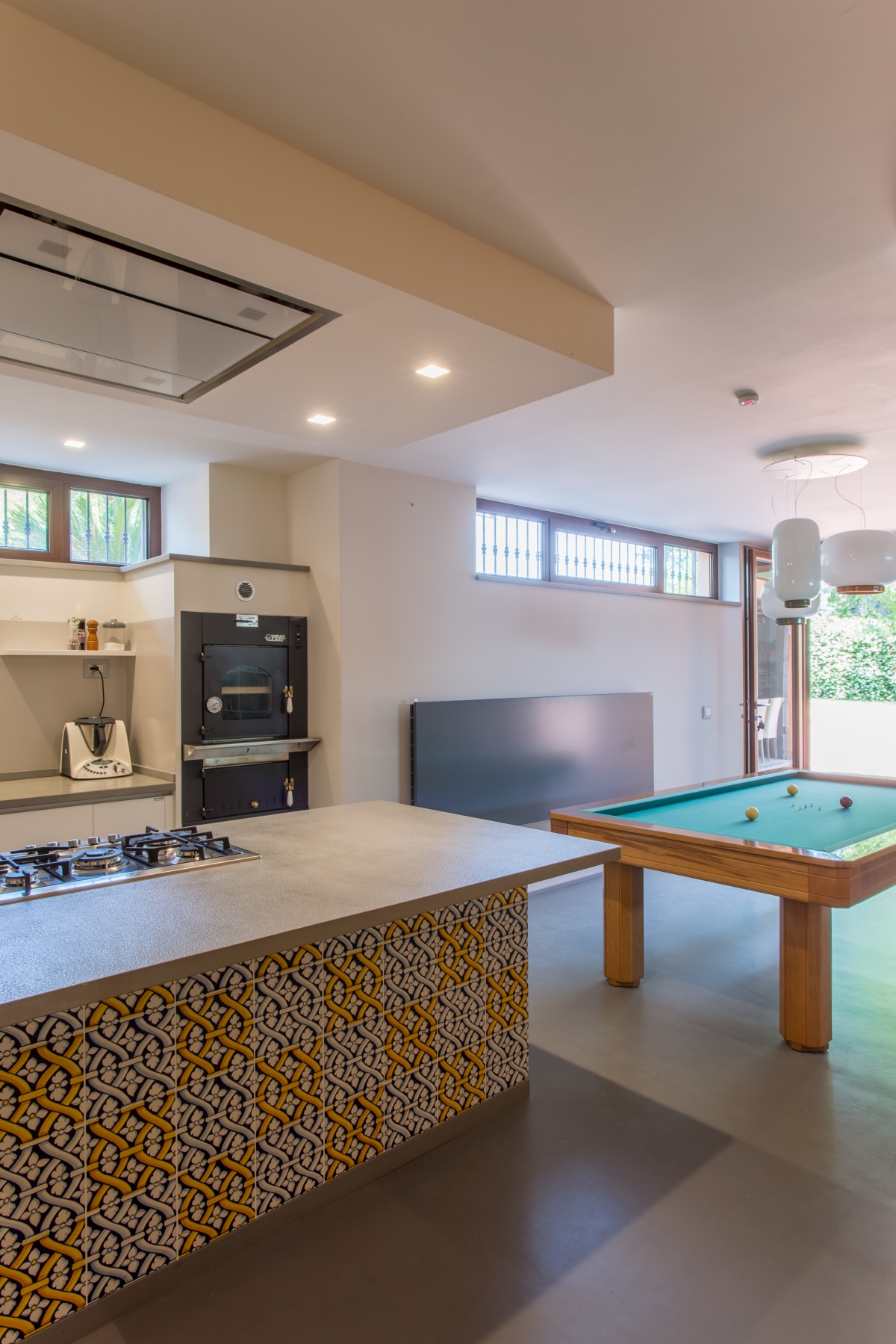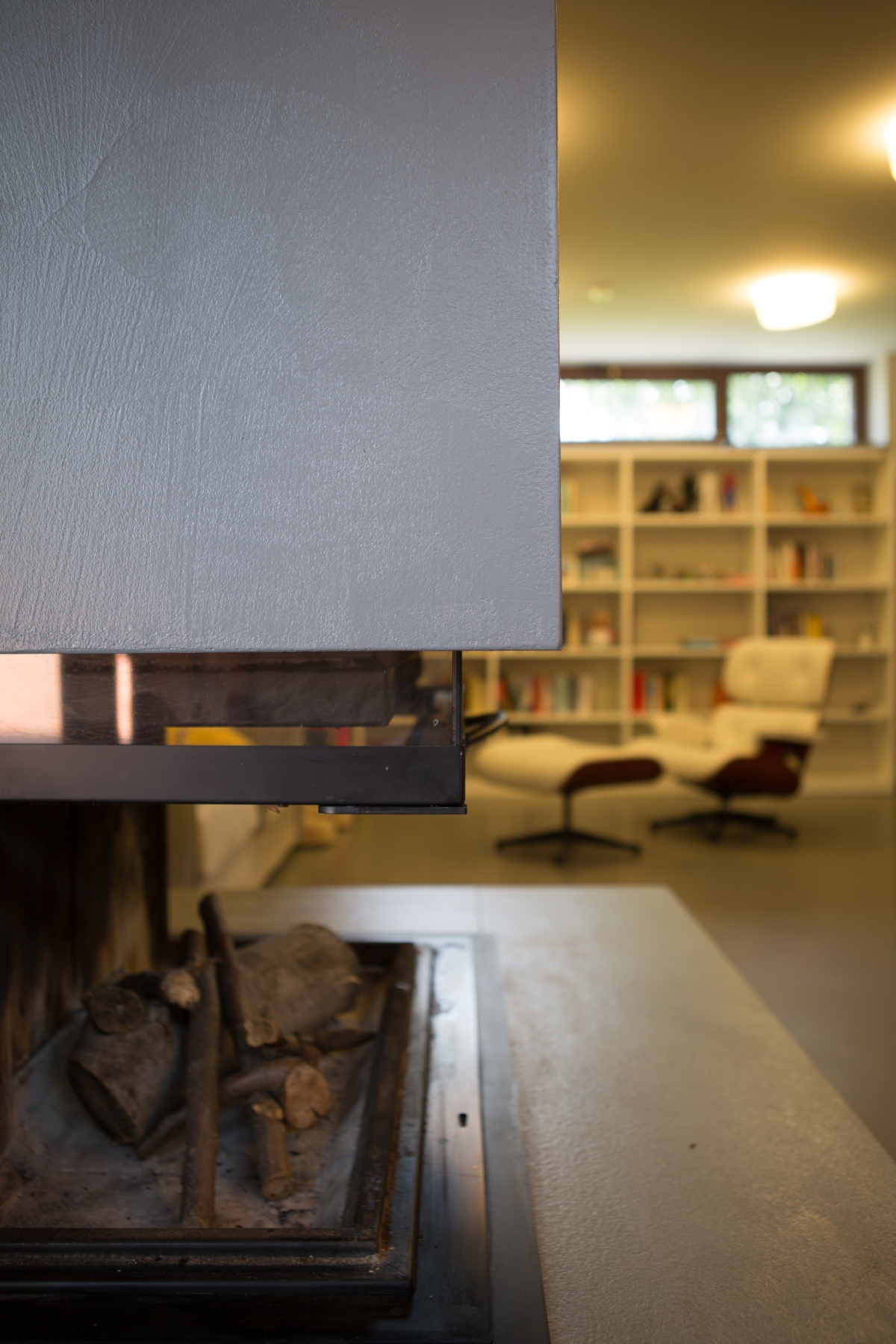 L’ambiente è caratterizzato da una pavimentazione continua in cemento-resina dai toni neutri, ripresi poi negli elementi in quarzite grigia del camino e della cucina. In assenza di elementi particolari, in questo caso il rapporto con l’esistente è diventato un rapporto con le tradizioni del territorio: i due punti focali del progetto, la cucina ad isola e lo spazio attorno al camino, sono stati caratterizzati da un rivestimento in ceramica realizzato a mano da un artigiano di Castelli, centro storico della produzione di maioliche in Abruzzo.