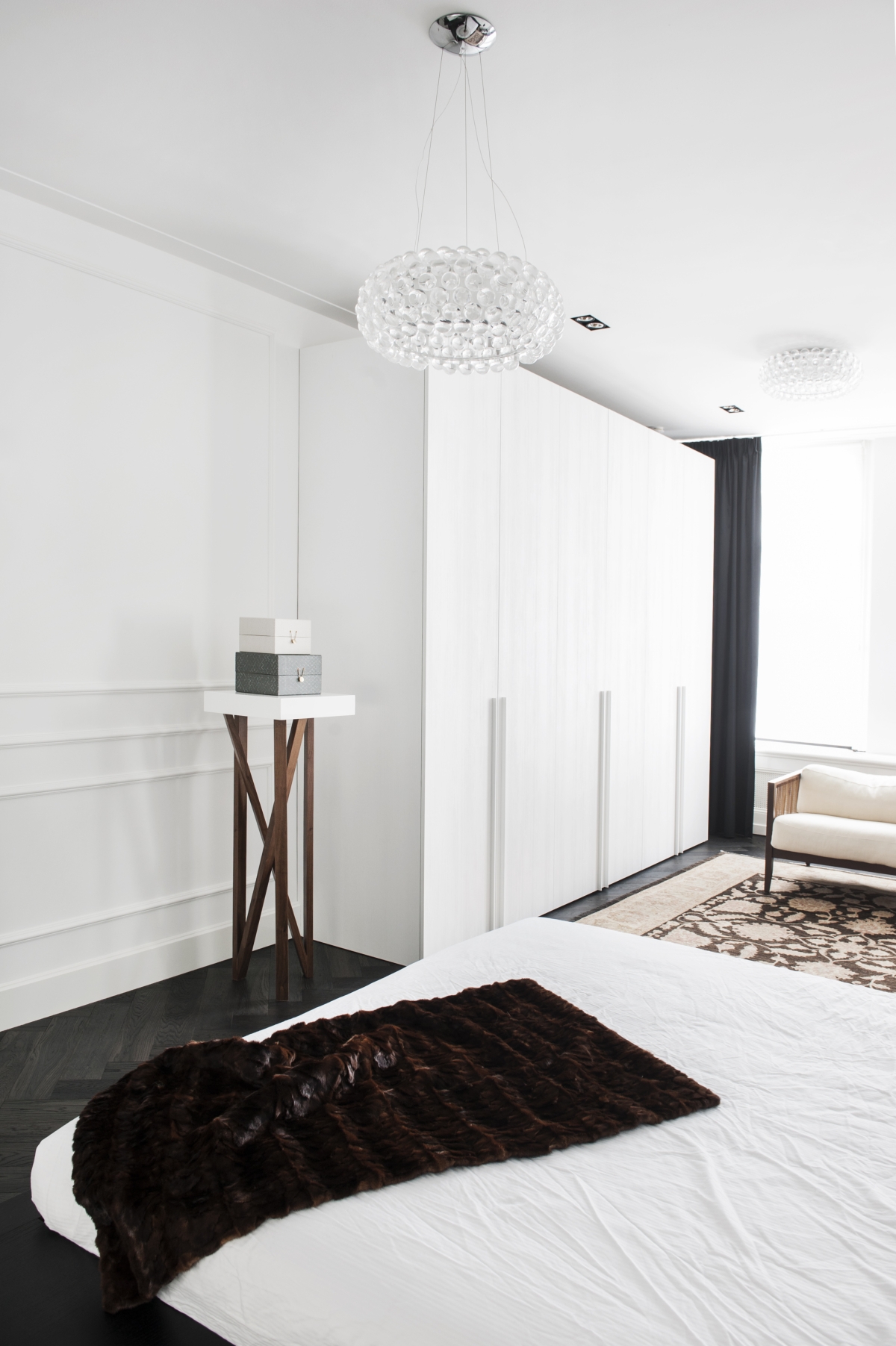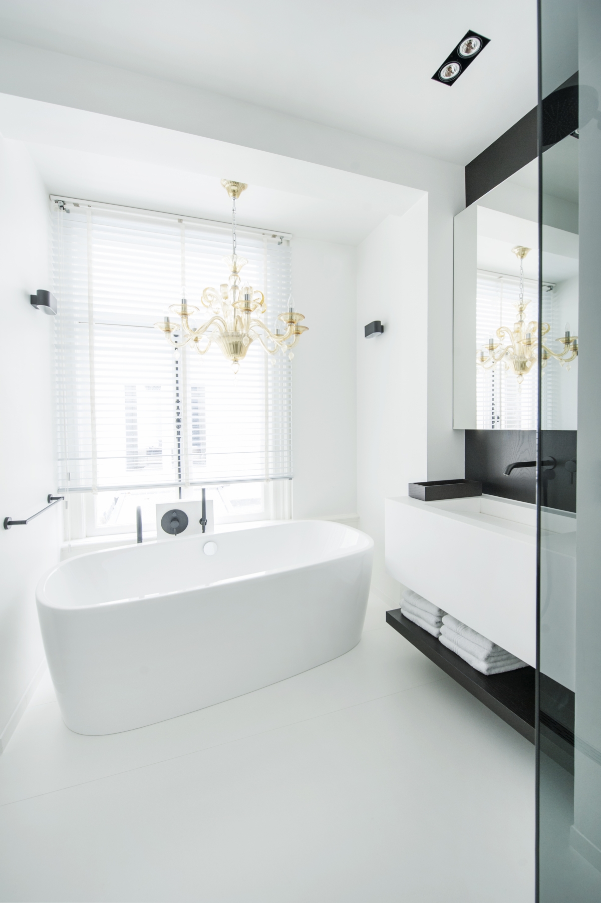 Completa il bagno il grande lampadario dorato che, assieme ai pochi elementi neri, interrompe il candore uniforme dello spazio, donandogli calore.