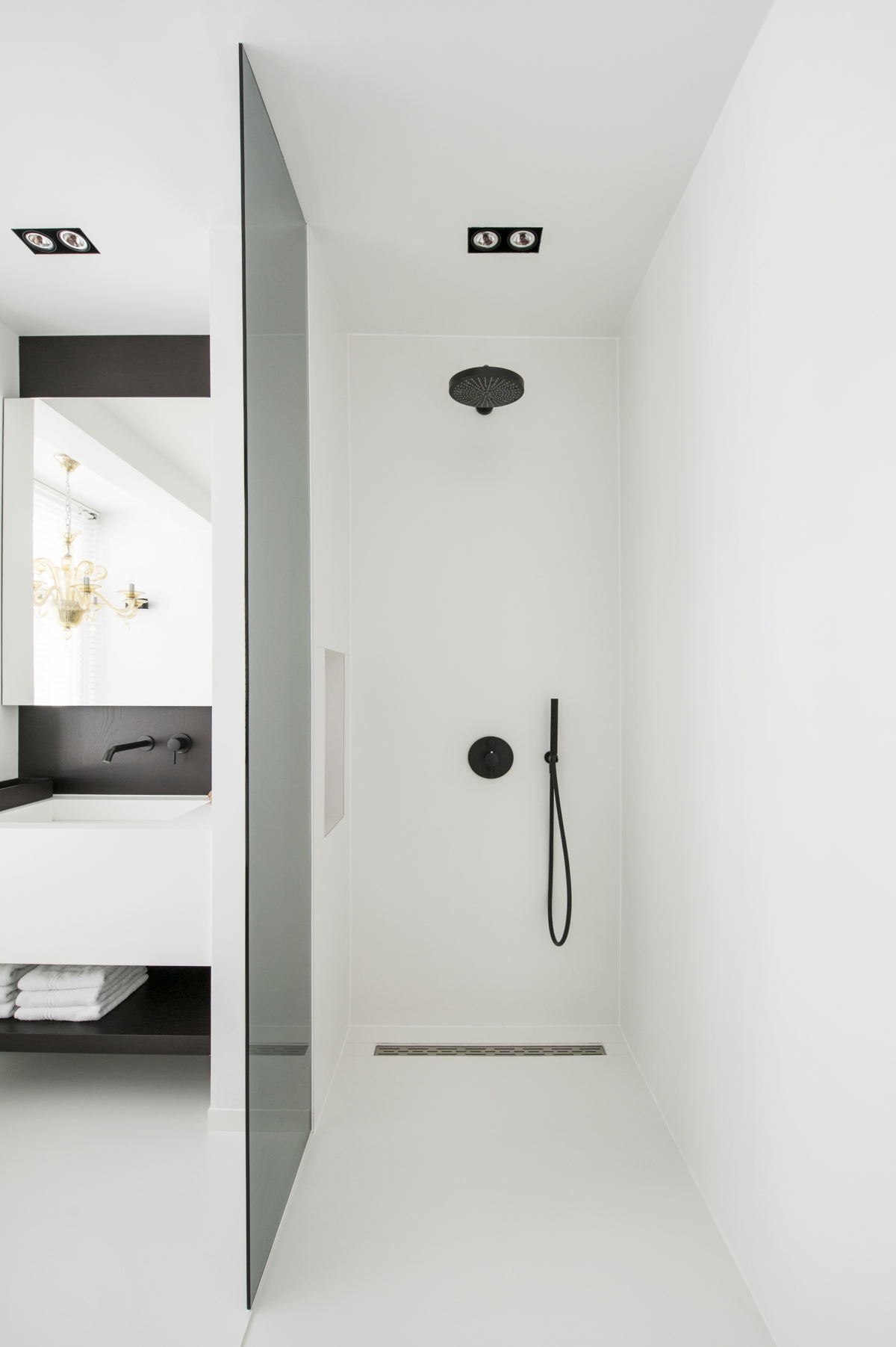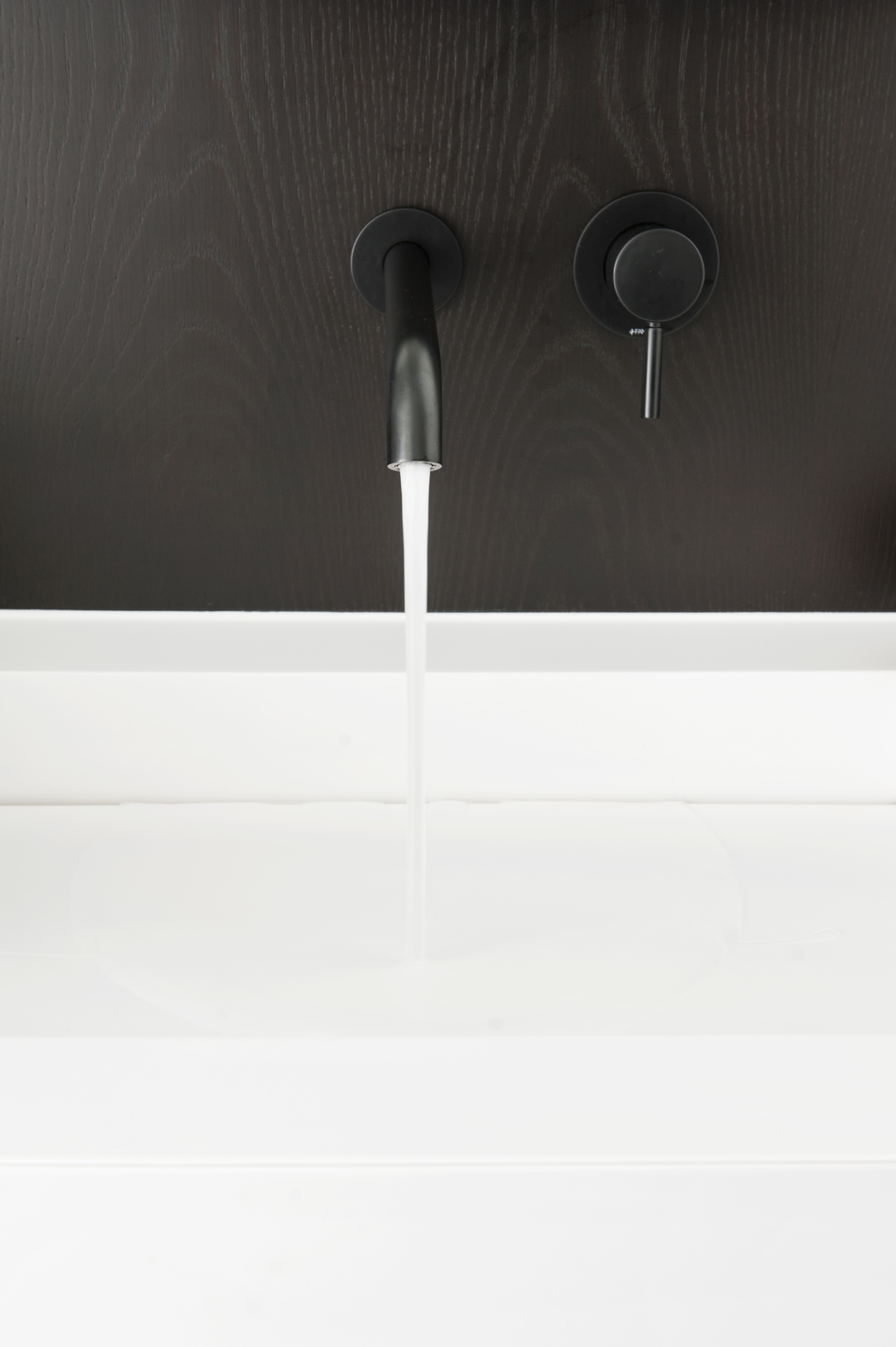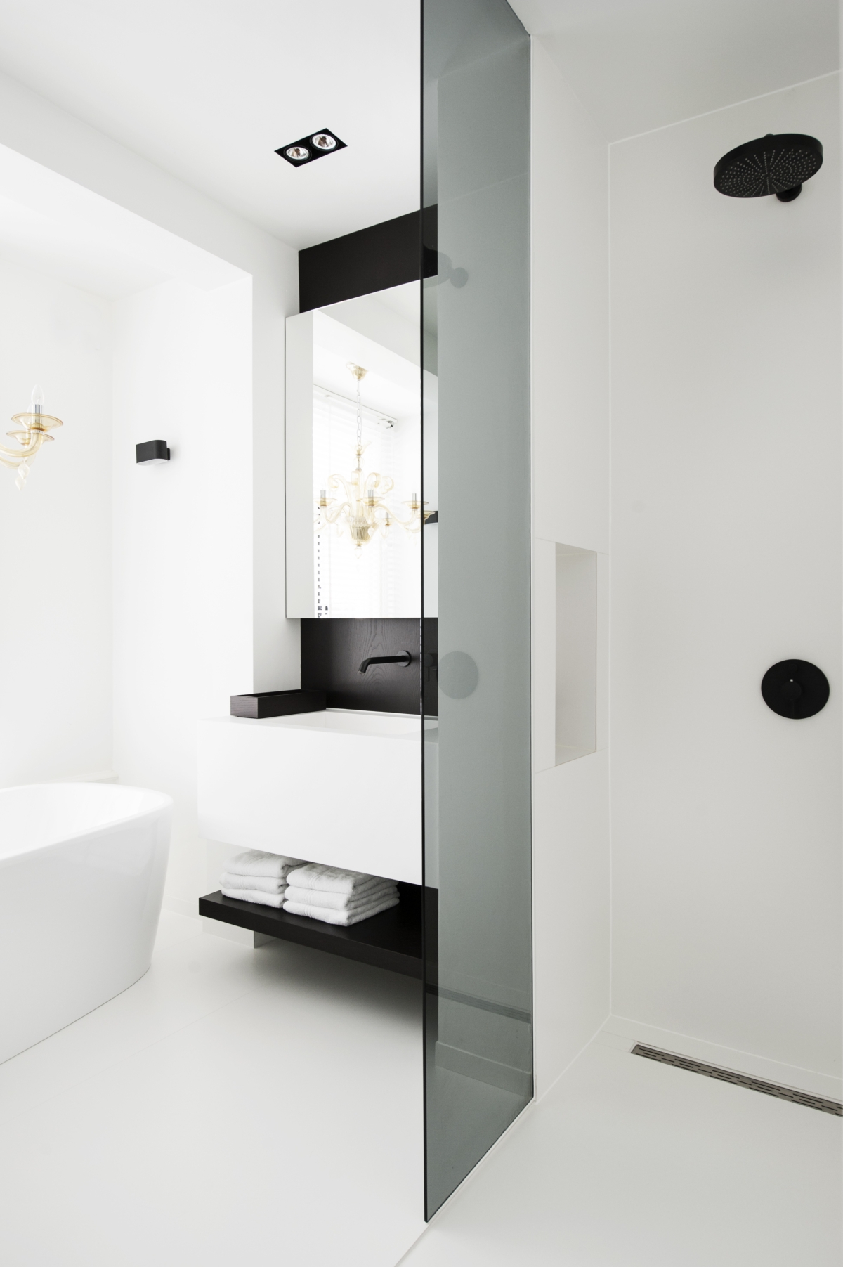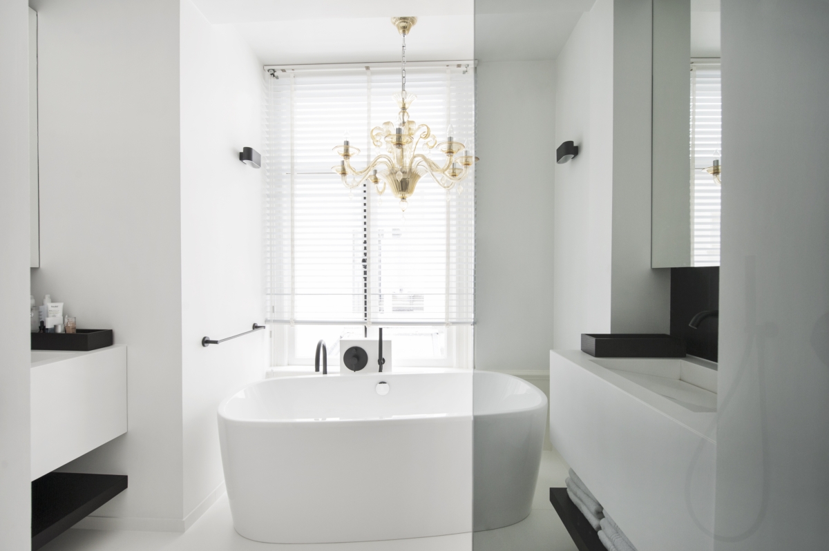 Sander van Eyck, qui, ha utilizzato HI-MACS® Alpine White per creare due lavabi identici, dalle linee essenziali, incassati all’interno di un piano che cela, in modo invisibile, un cassetto. I lavabi, posizionati uno di fronte all’altro, lasciano al centro della stanza un ampio spazio per la vasca da bagno. Il gioco di specchi, poi, dilata all’infinito la prospettiva, creando un effetto optical sorprendente.