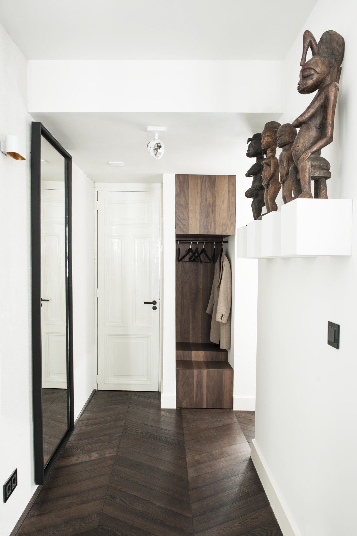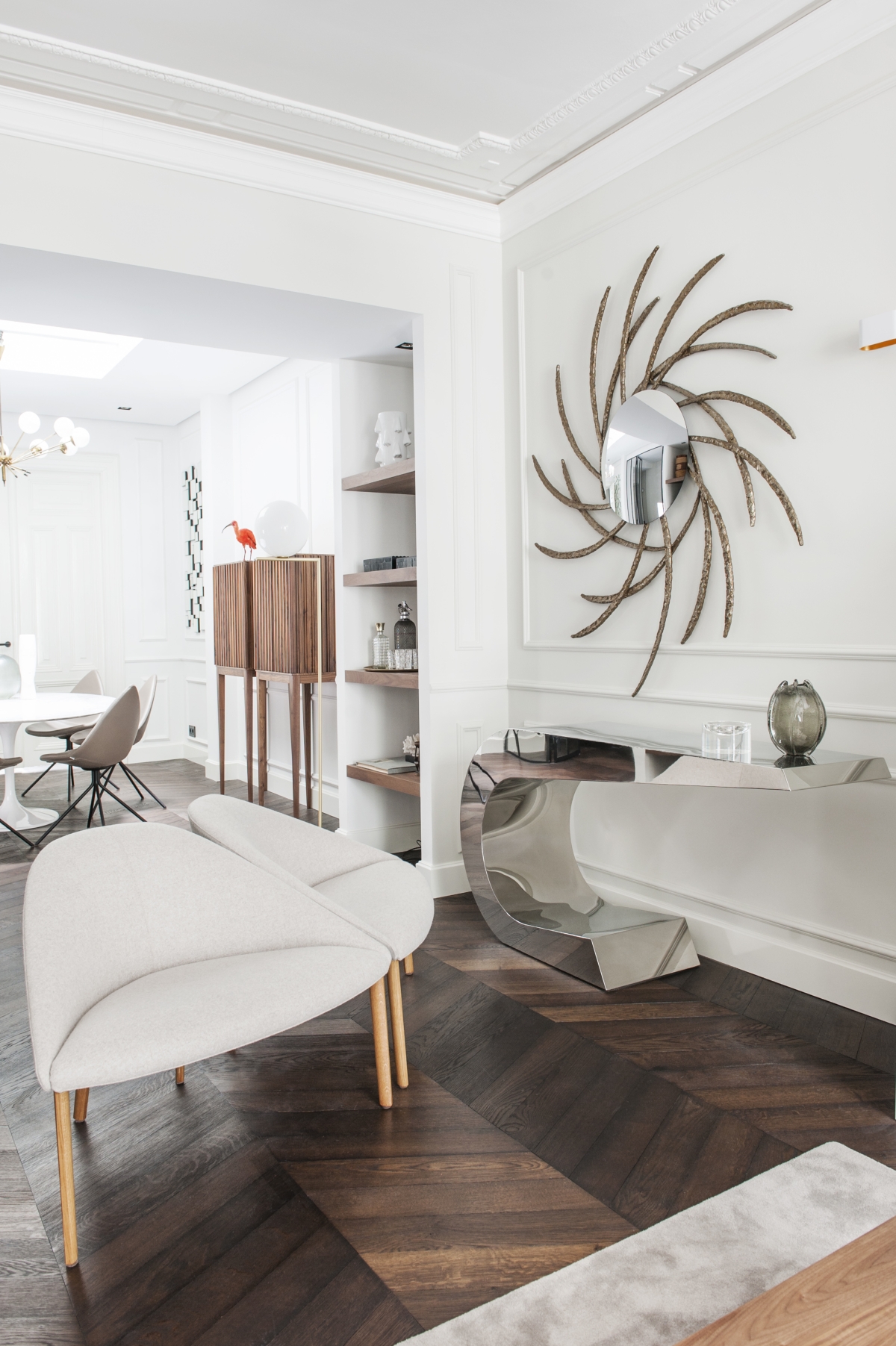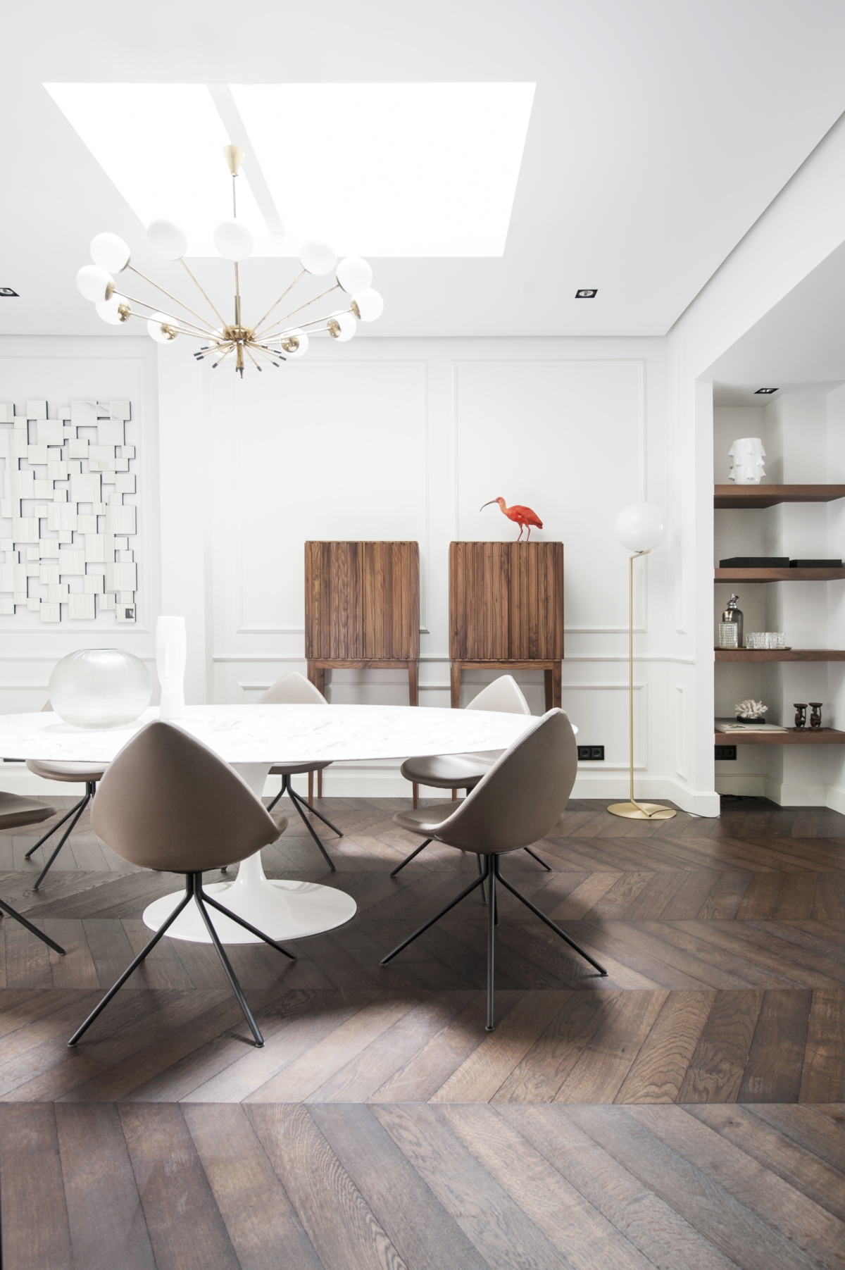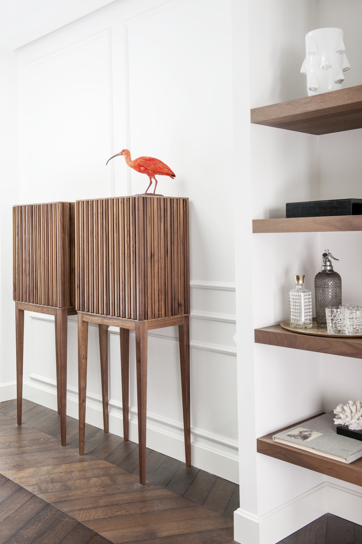 Ma è nei complementi che si scopre il vero spirito dell’abitazione: gli elementi decorativi sono infatti numerosi ricordi dei viaggi vissuti dai committenti e che, seppur del tutto differenti per provenienza geografica e storica, sono stati inseriti con sapienza all’interno del contesto contemporaneo. È così che ritroviamo nel bagno dei lampadari Versailles in stile barocco accanto ad alcune conchiglie di spiagge tropicali, o ancora lo specchio del soggiorno, che richiama la sua origine centrafricana, posizionato non distante da un ibis scarlatto, uccello del Sud America il cui piumaggio brillante attira inevitabilmente lo sguardo.