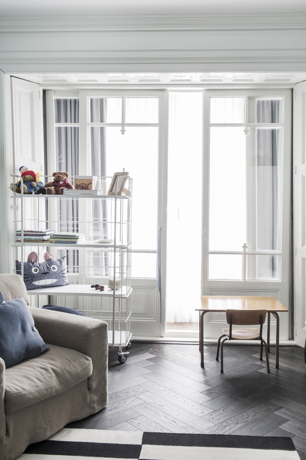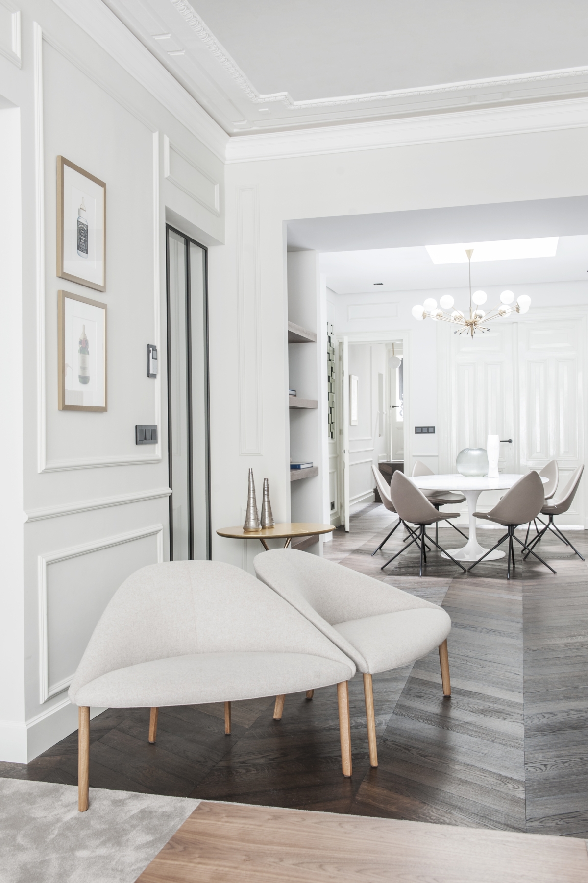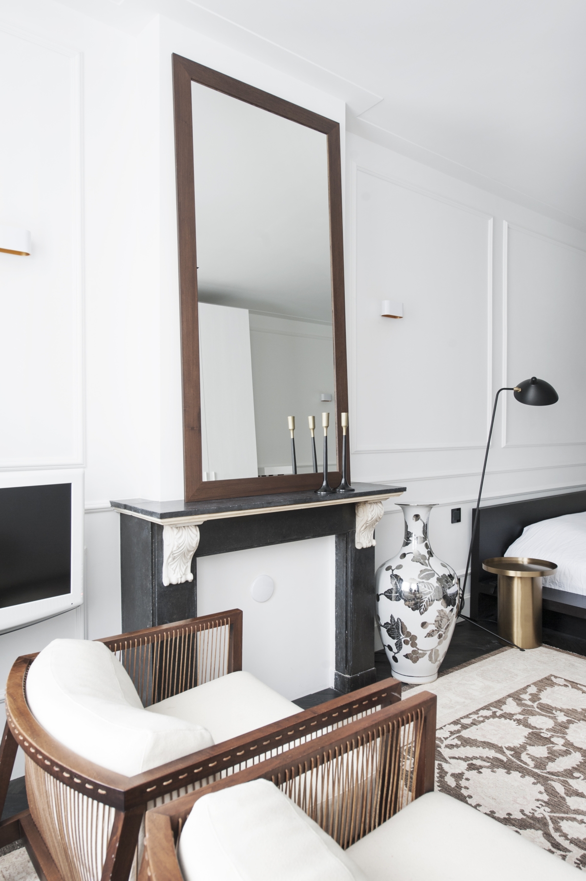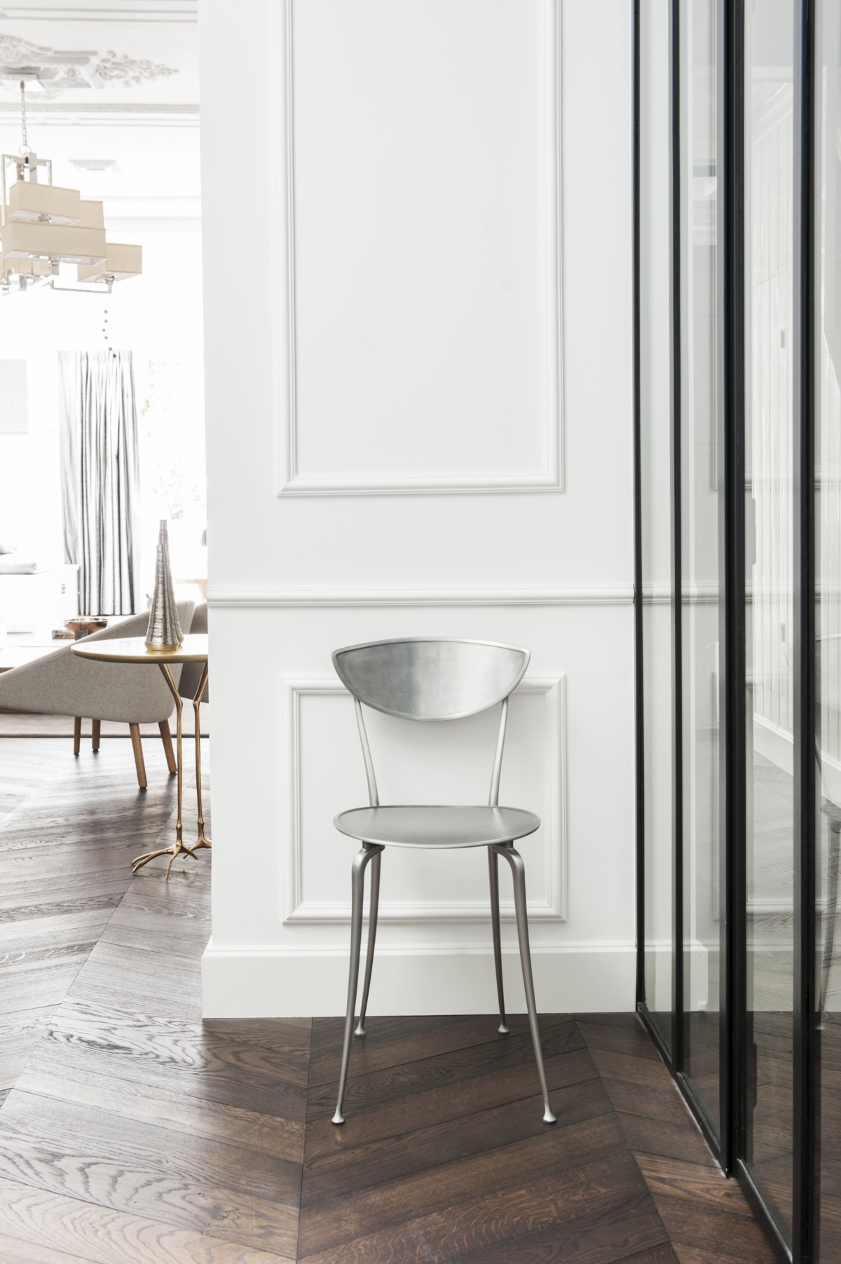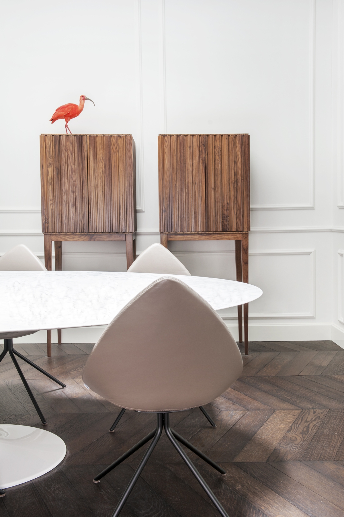 Ma è nei complementi che si scopre il vero spirito dell’abitazione: gli elementi decorativi sono infatti numerosi ricordi dei viaggi vissuti dai committenti e che, seppur del tutto differenti per provenienza geografica e storica, sono stati inseriti con sapienza all’interno del contesto contemporaneo. È così che ritroviamo nel bagno dei lampadari Versailles in stile barocco accanto ad alcune conchiglie di spiagge tropicali, o ancora lo specchio del soggiorno, che richiama la sua origine centrafricana, posizionato non distante da un ibis scarlatto, uccello del Sud America il cui piumaggio brillante attira inevitabilmente lo sguardo.