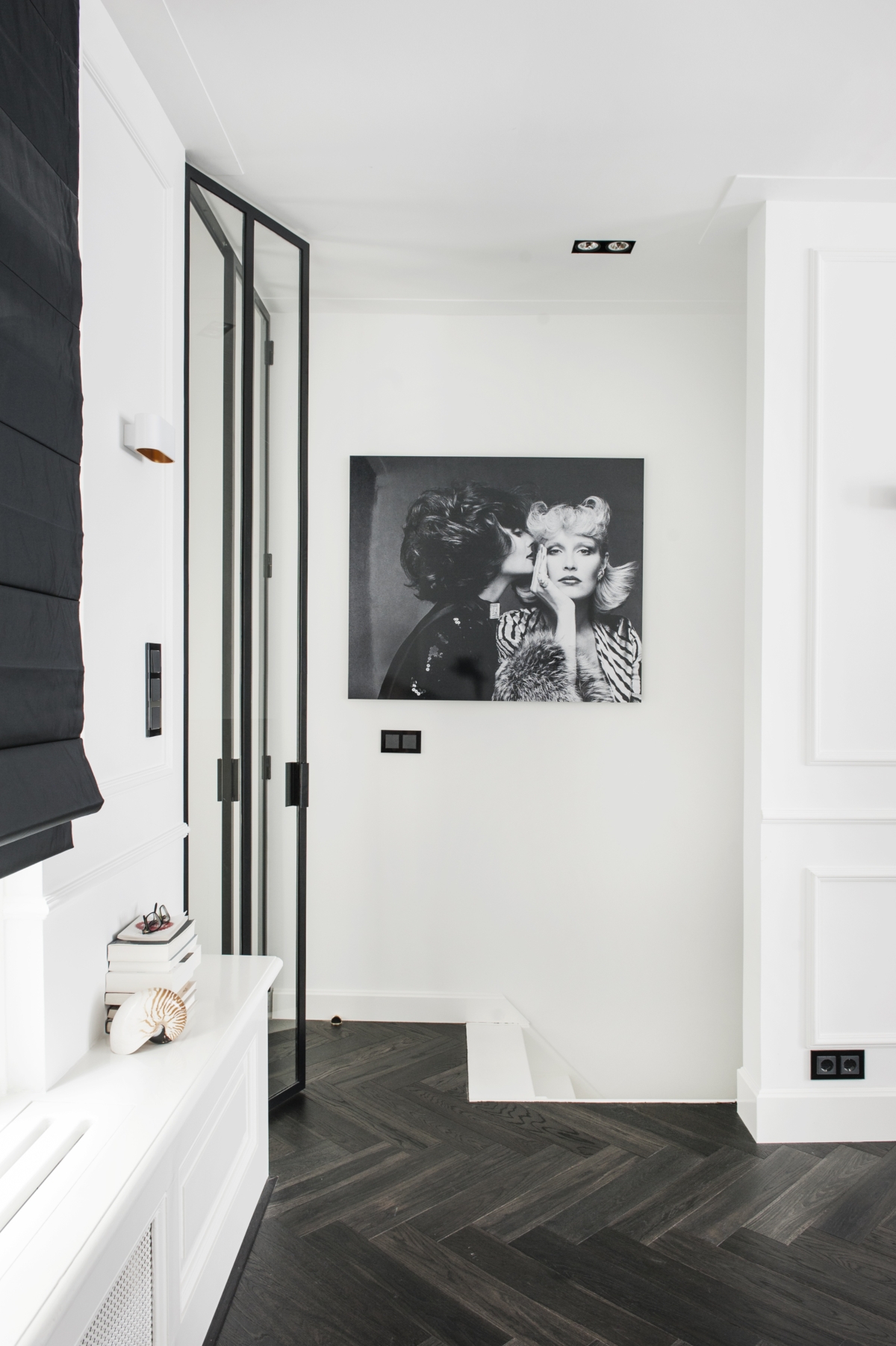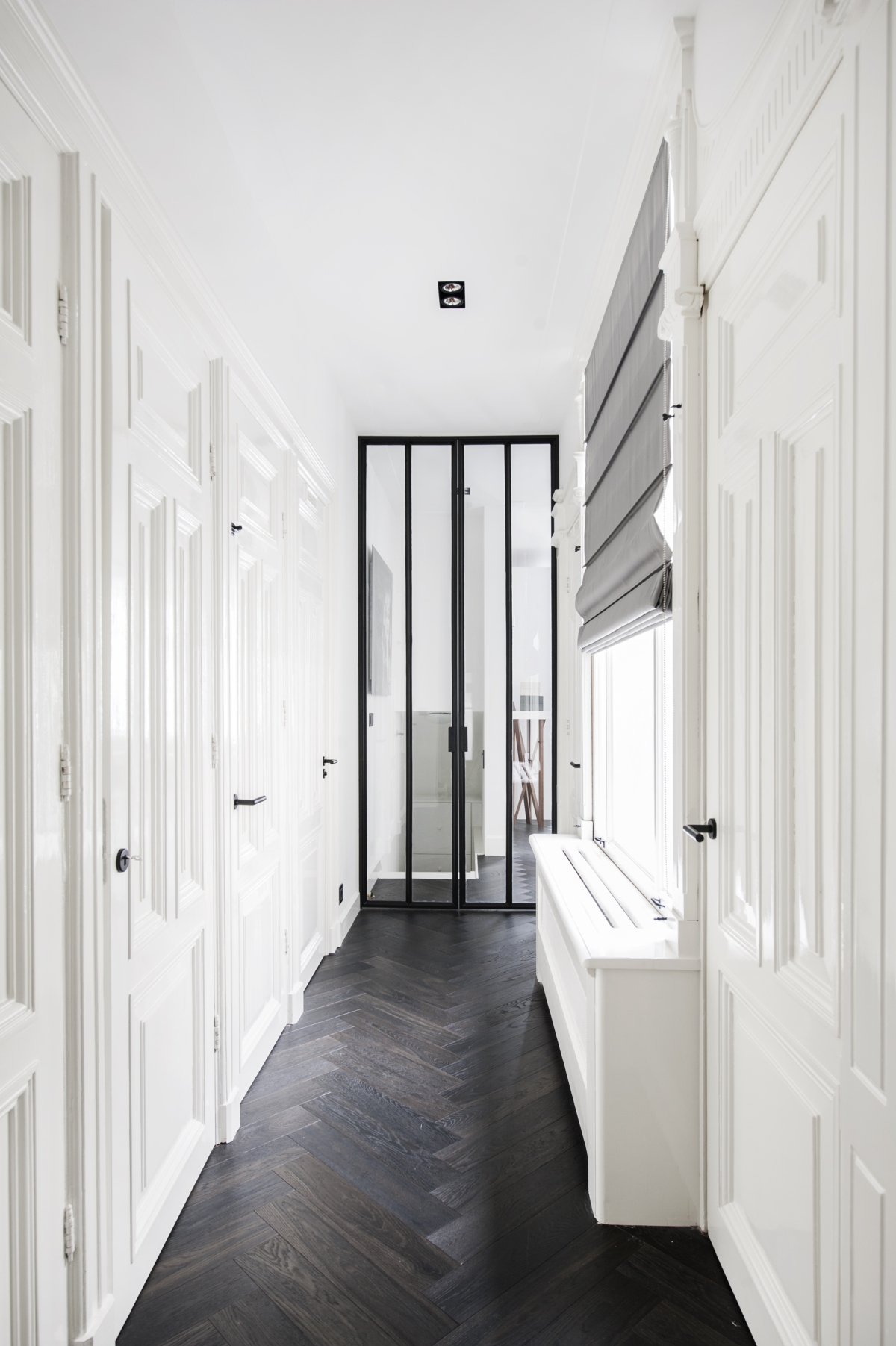 A padroneggiare lo spazio sono il bianco e la luce, che creano ambienti aperti pensati per enfatizzare, incorniciare gli arredi presenti. A rompere questa armonia, solo il prezioso pavimento a spina di pesce in legno scuro, che richiama l’anima antica della dimora.