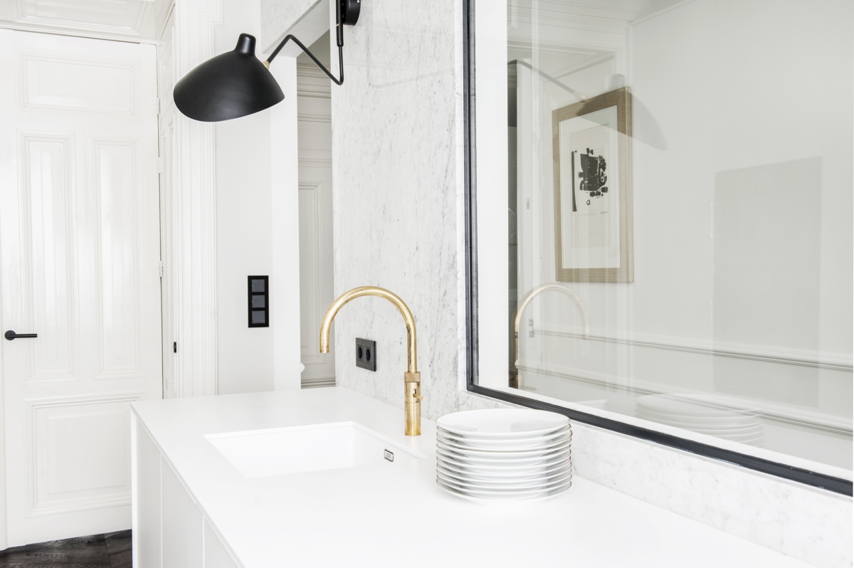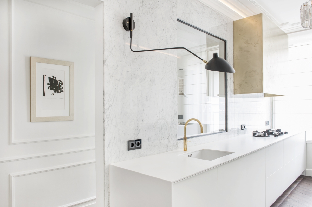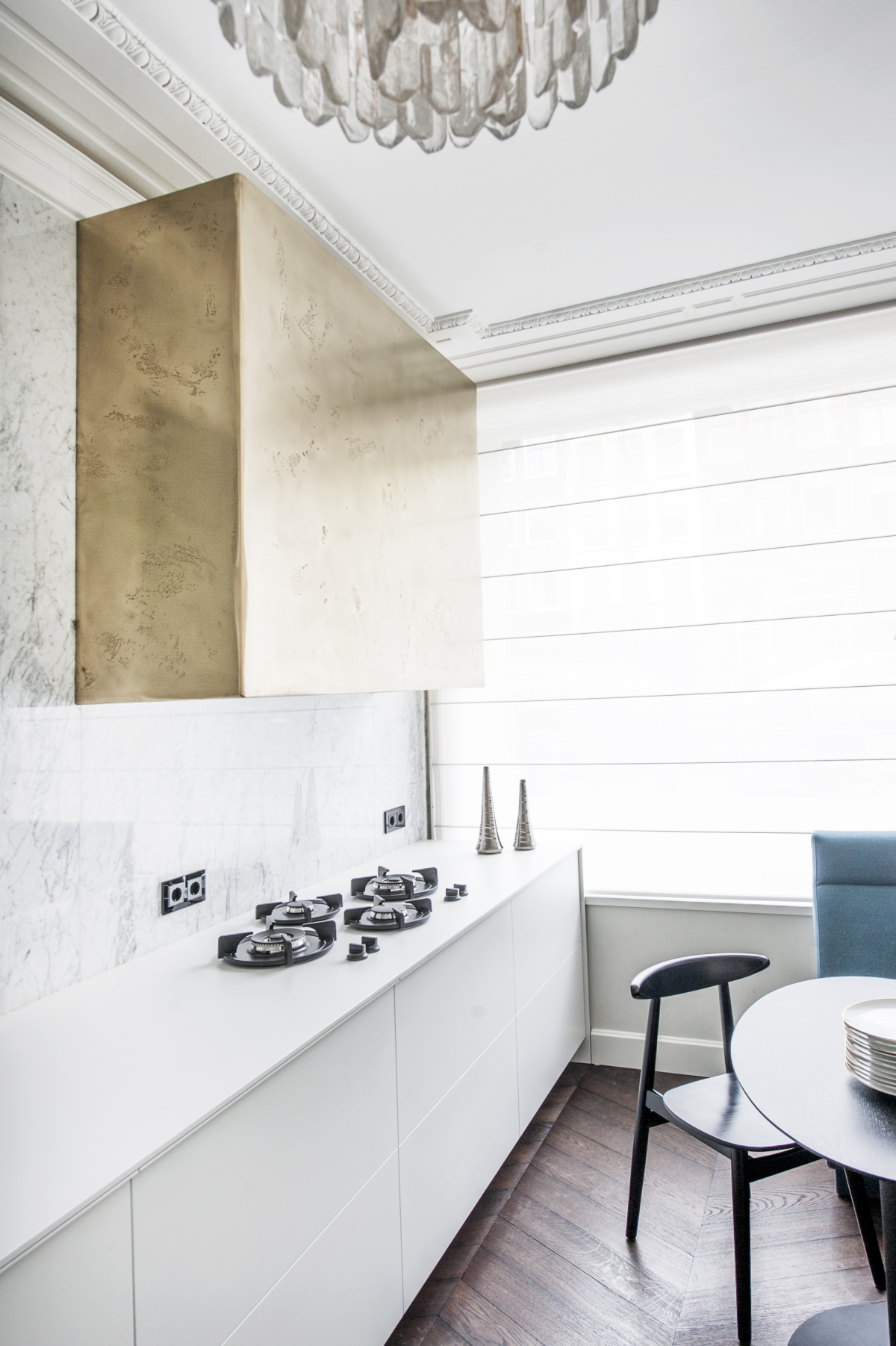 Una monumentale cappa in ottone massiccio lavorato a mano e una parete in marmo bianco di Carrara: l’immagine della cucina di questa abitazione verte tutta sui contrasti tra i materiali più pregiati, tra cui anche HI-MACS®, utilizzato per il blocco cucina, geometrico e completamente bianco. La superficie non porosa di HI-MACS®, perfettamente liscia e priva di giunzioni, garantisce massima pulizia e igiene. I fornelli sono incassati all’interno del piano, per una stupefacente continuità visiva.