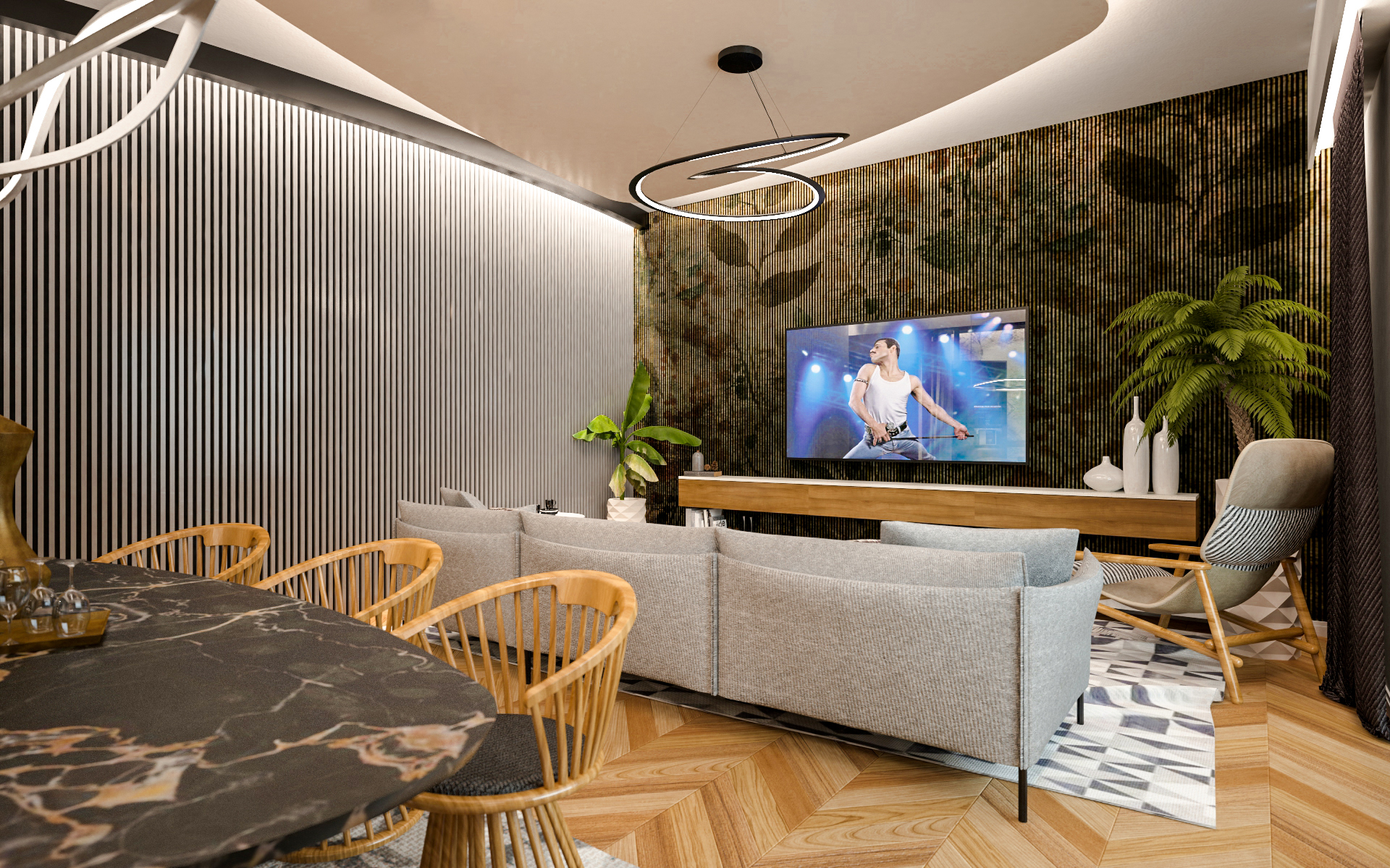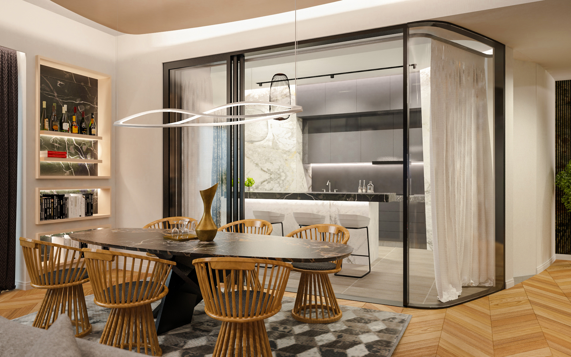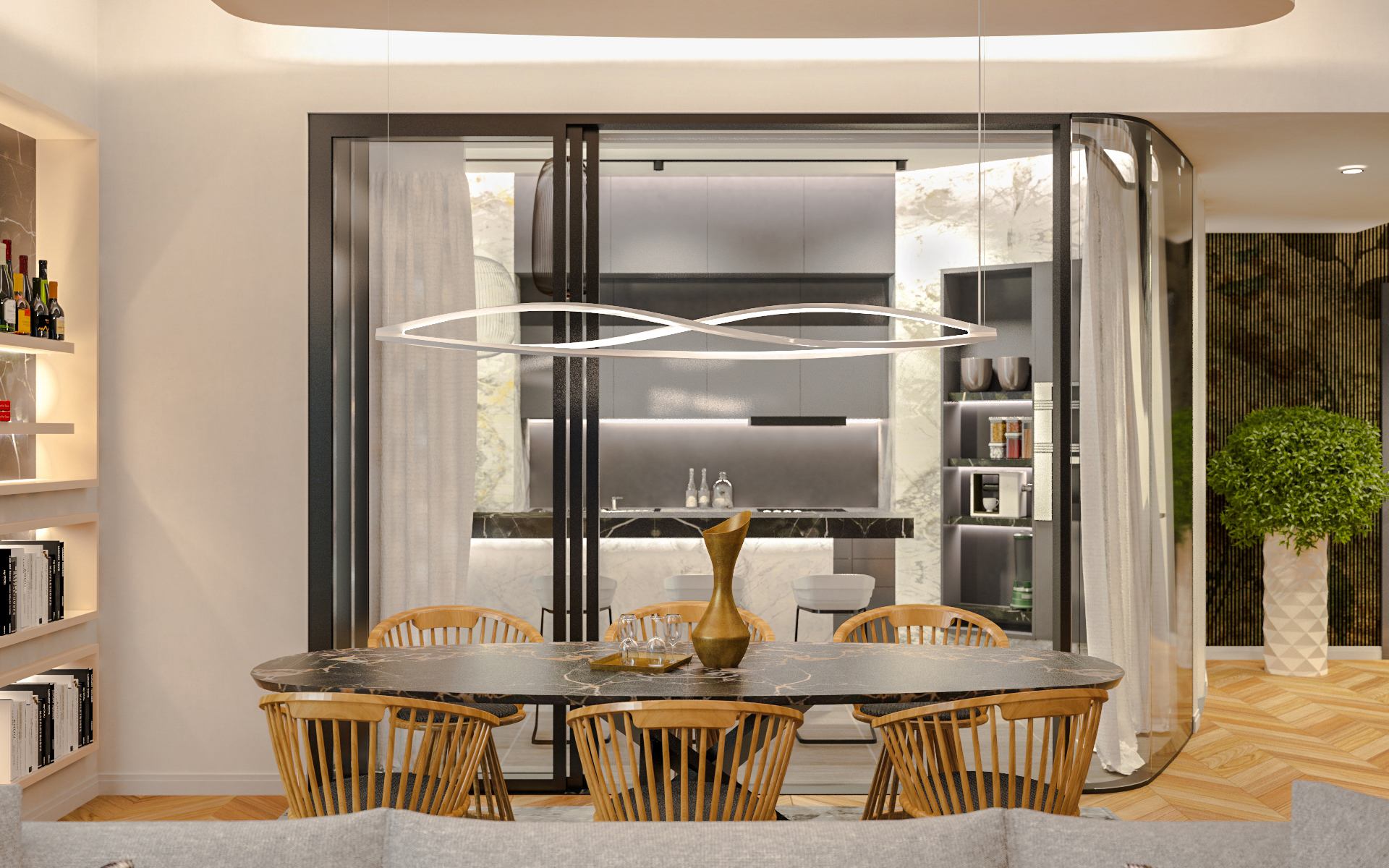 Le pareti diritte della sala da pranzo e della cucina hanno preso una forma curva in modo che la transizione tra l’atrio e il soggiorno sia più agevole. Per creare sottili gradazioni, la parete del soggiorno è a strisce verticali.