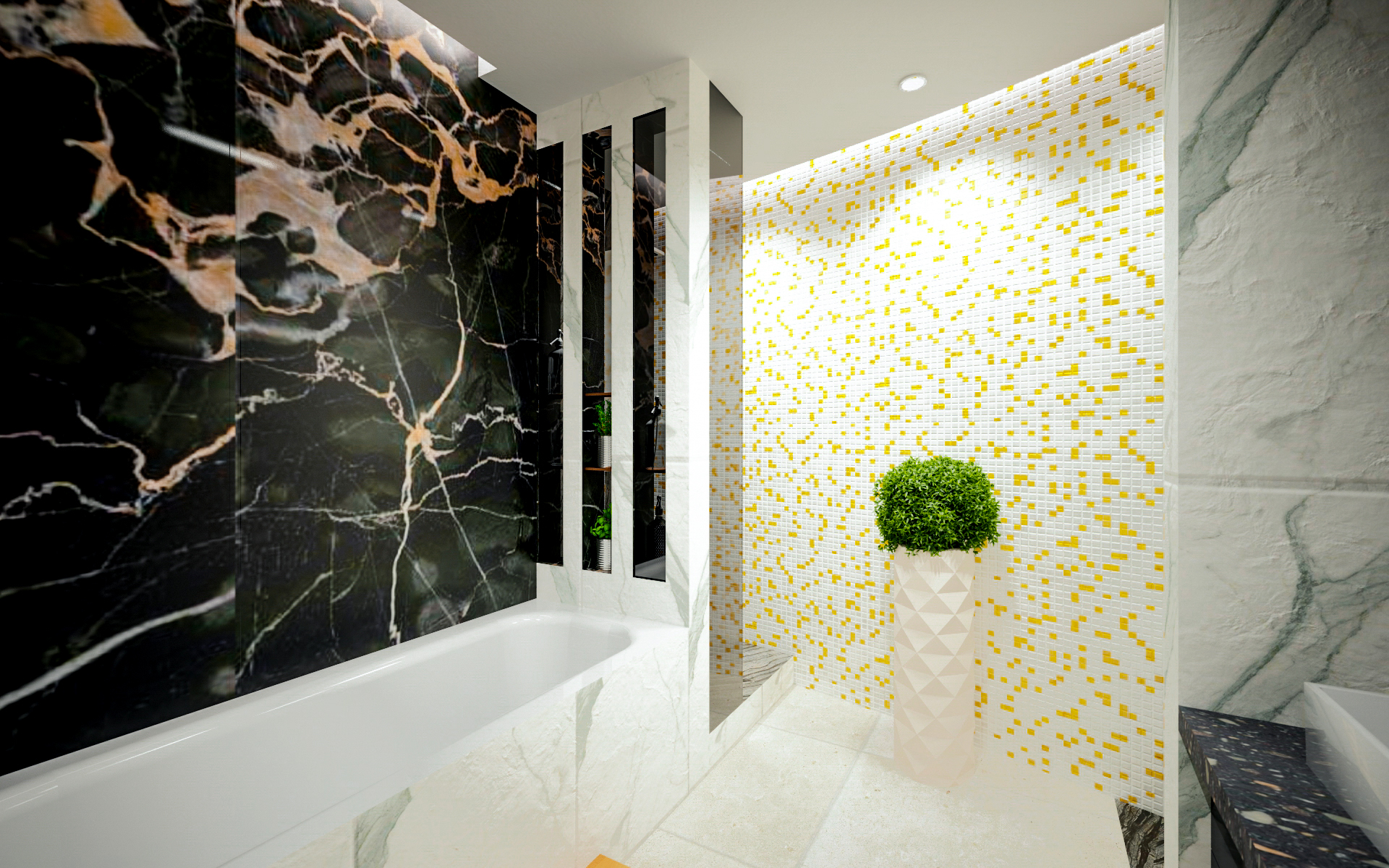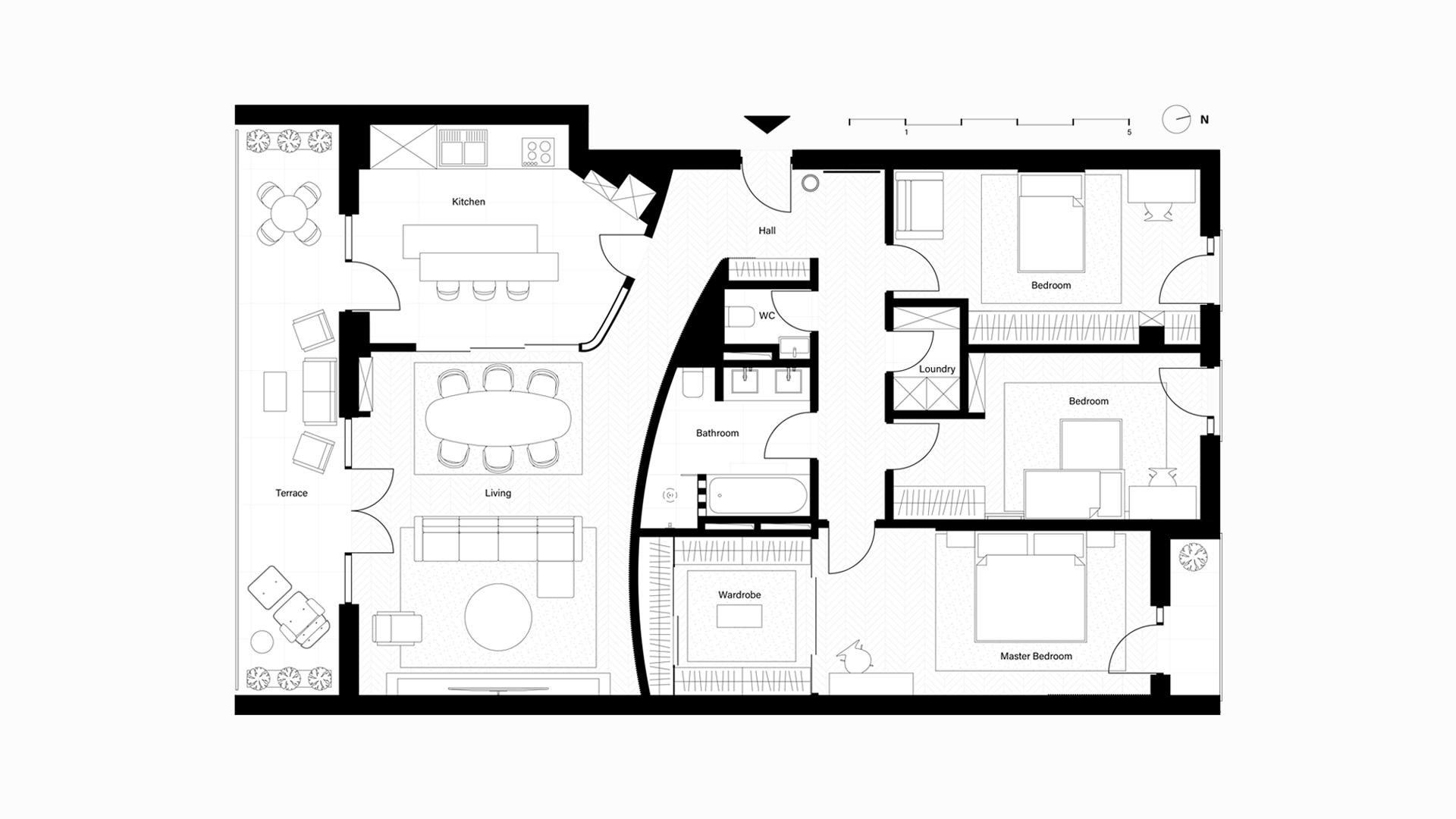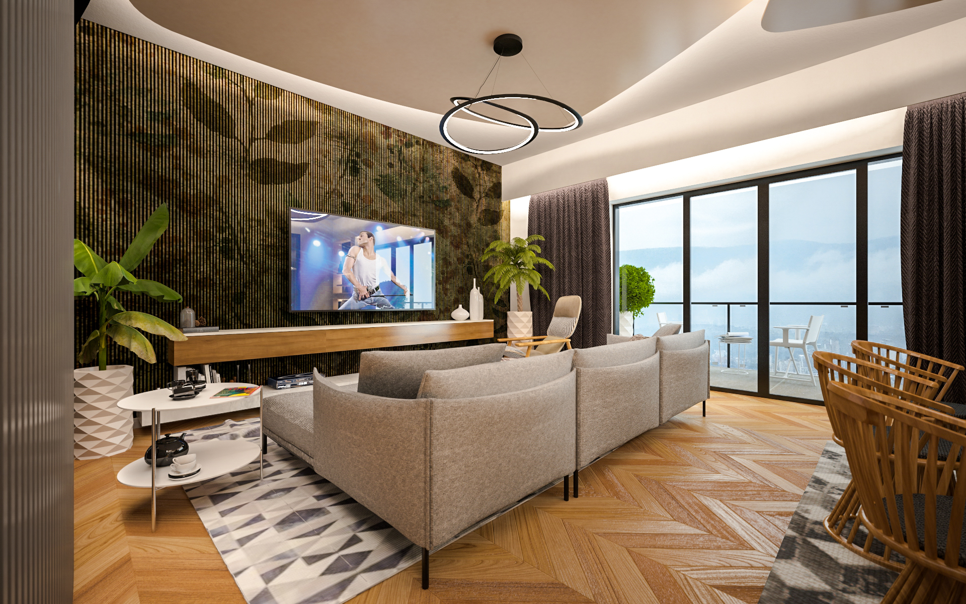 Le pareti diritte della sala da pranzo e della cucina hanno preso una forma curva in modo che la transizione tra l’atrio e il soggiorno sia più agevole. Per creare sottili gradazioni, la parete del soggiorno è a strisce verticali.