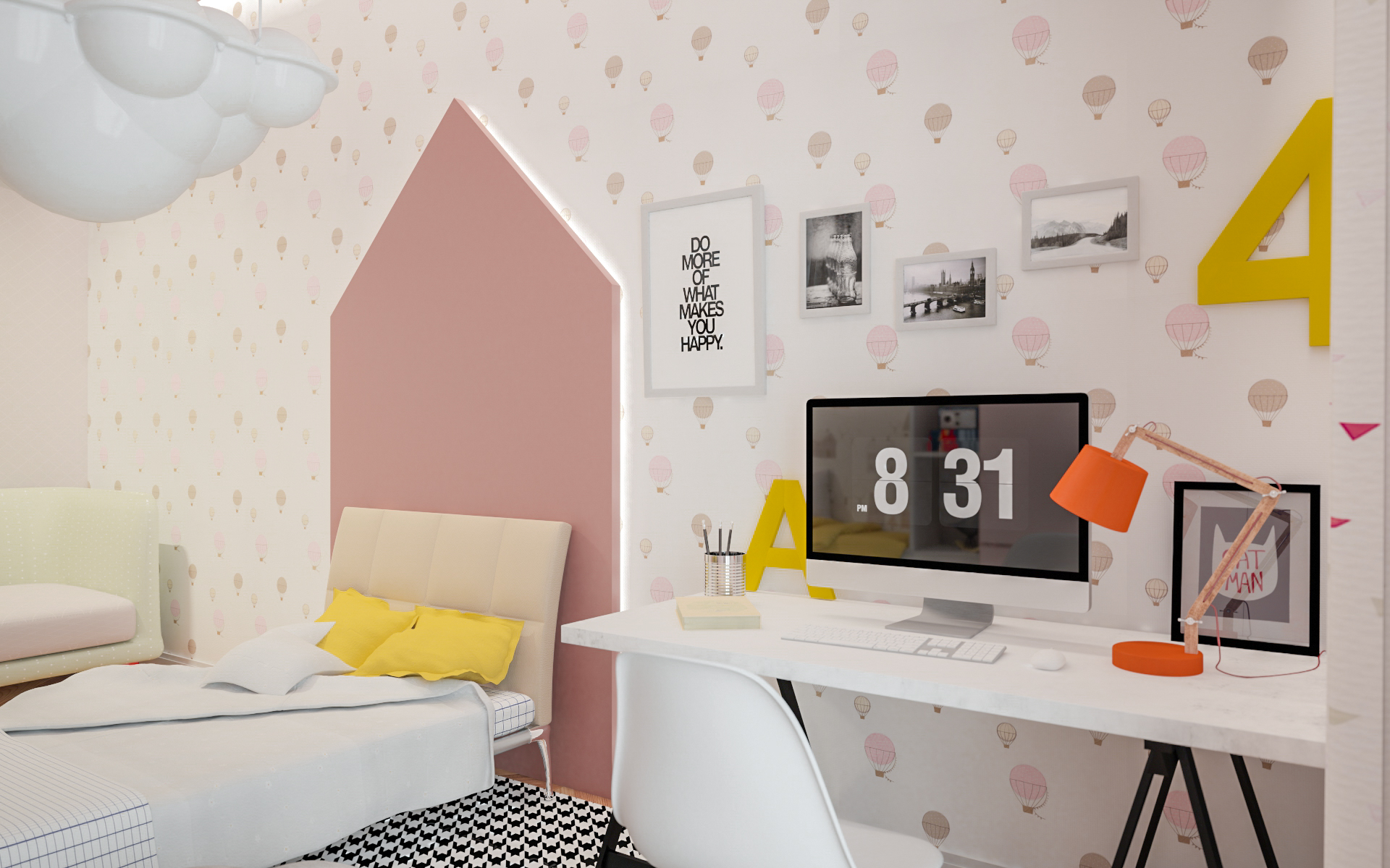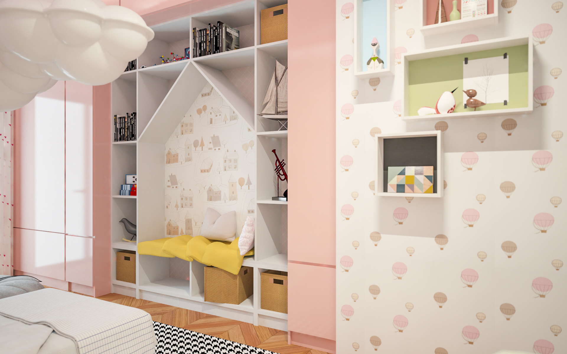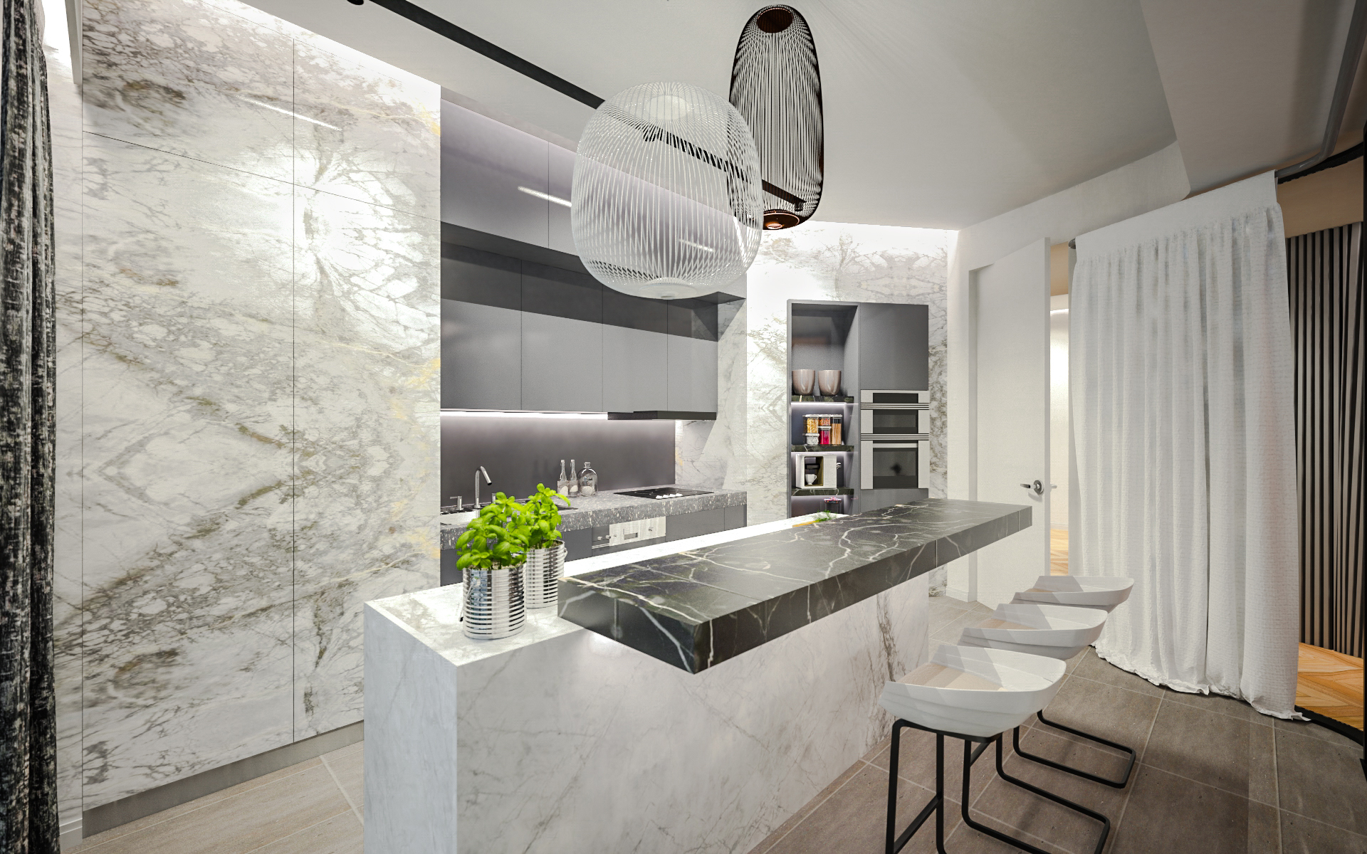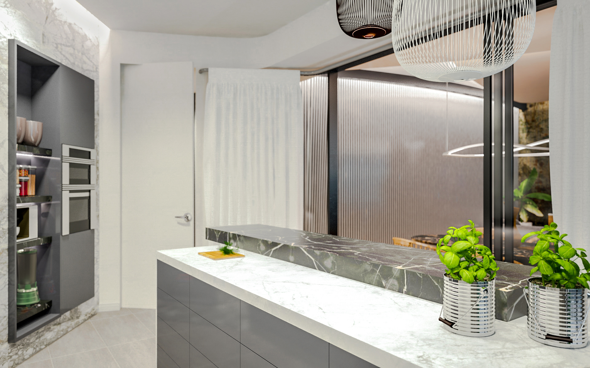 Un frigorifero è nascosto dietro le porte di marmo bianco, che imitano lo strato superiore dell’isola della cucina. Gli scaffali sopraelevati sono integrati nella cucina e nelle pareti della sala da pranzo. Le stanze dei bambini hanno colori delicati; mentre le luci a forma di sfera e nuvola sono delicatamente sospese ai soffitti.