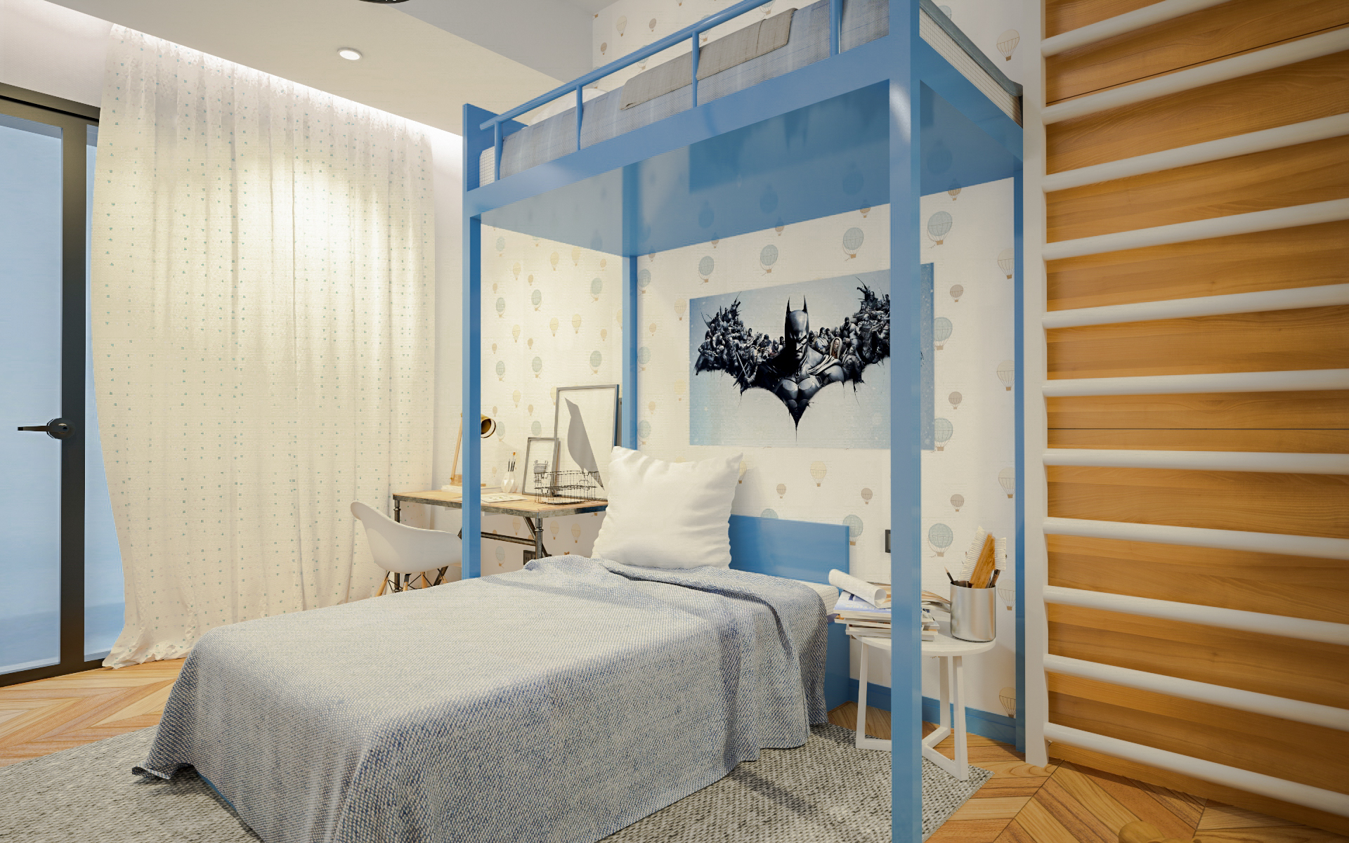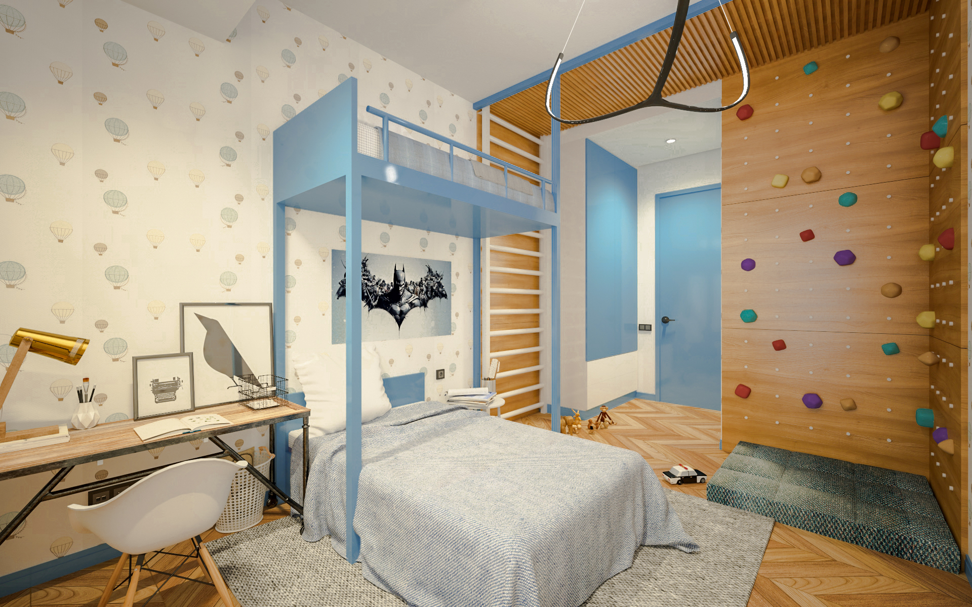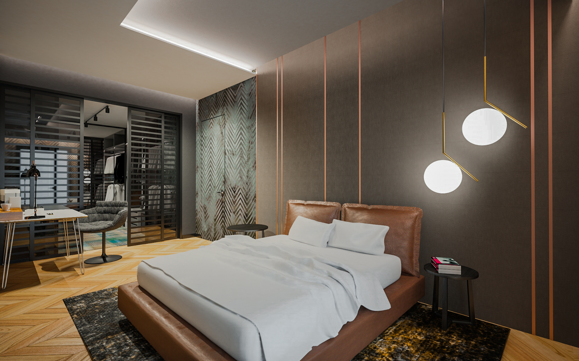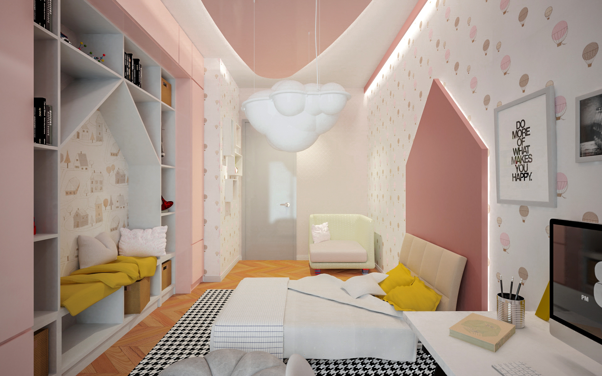 Un frigorifero è nascosto dietro le porte di marmo bianco, che imitano lo strato superiore dell’isola della cucina. Gli scaffali sopraelevati sono integrati nella cucina e nelle pareti della sala da pranzo. Le stanze dei bambini hanno colori delicati; mentre le luci a forma di sfera e nuvola sono delicatamente sospese ai soffitti.