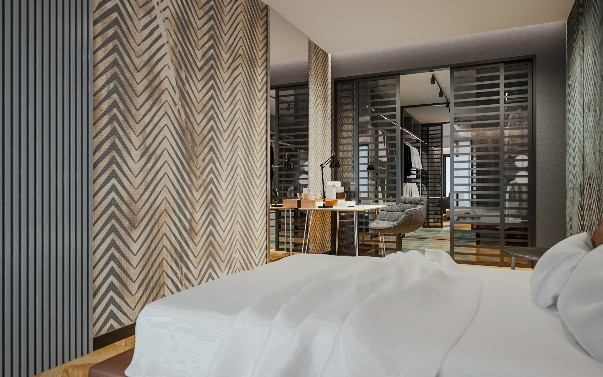 Le linee sono applicate anche ad alcune altre pareti e oggetti. I materiali scuri nella spaziosa casa sono giustapposti con forme morbide e sfumature di beige. Le luci intricate sono attaccate ai fogli ovali retroilluminati, che sono stratificati sul soffitto.