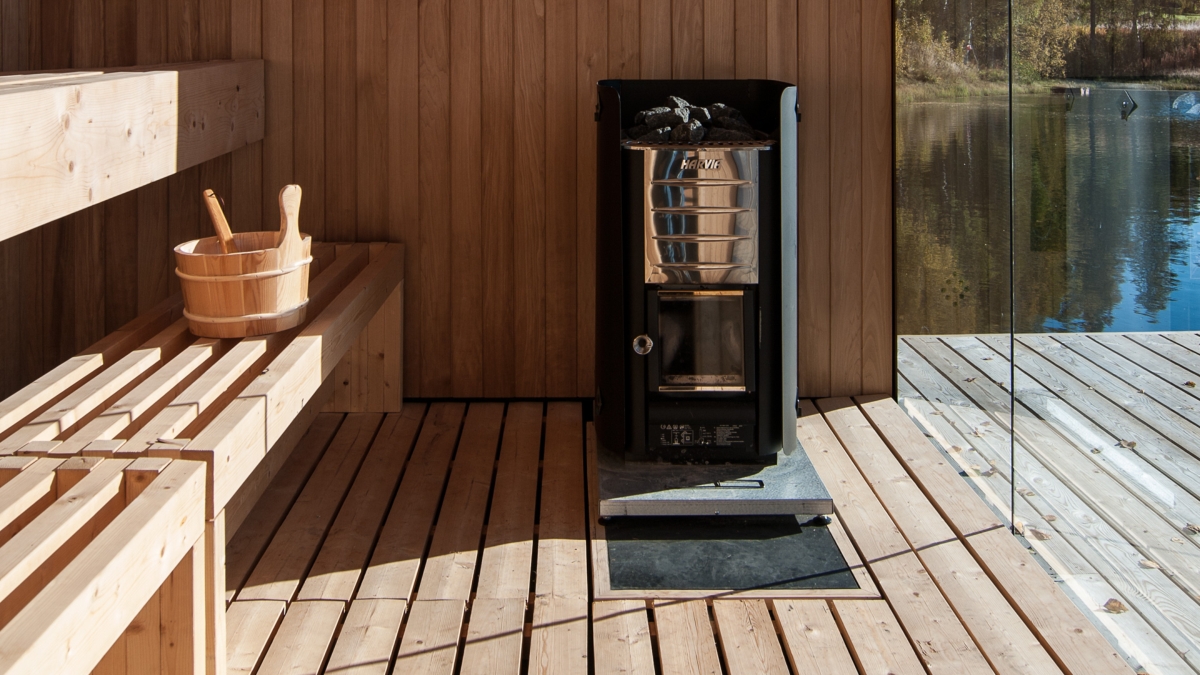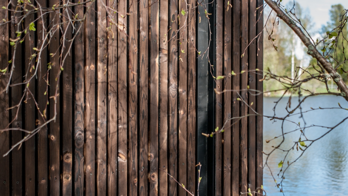 La parete verso il lago è completamente vetrata in modo tale da permettere la contemplazione dell’acqua e del paesaggio indipendentemente dalle condizioni atmosferiche. Mentre la finitura interna è realizzata in legno di ontano, molto simile alla betulla e tradizionalmente usato per i rivestimenti interni delle saune in tutta la Scandinavia, l’esterno trae ispirazione dalla tradizione giapponese.