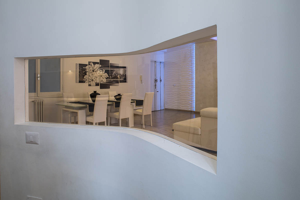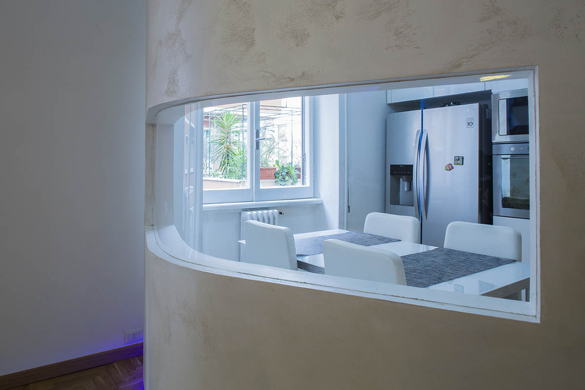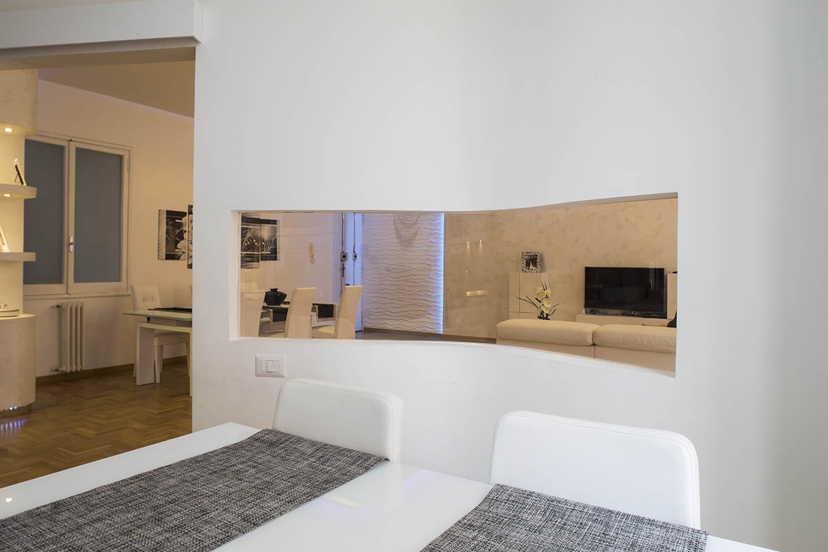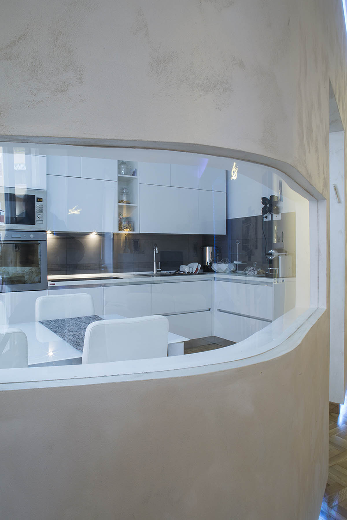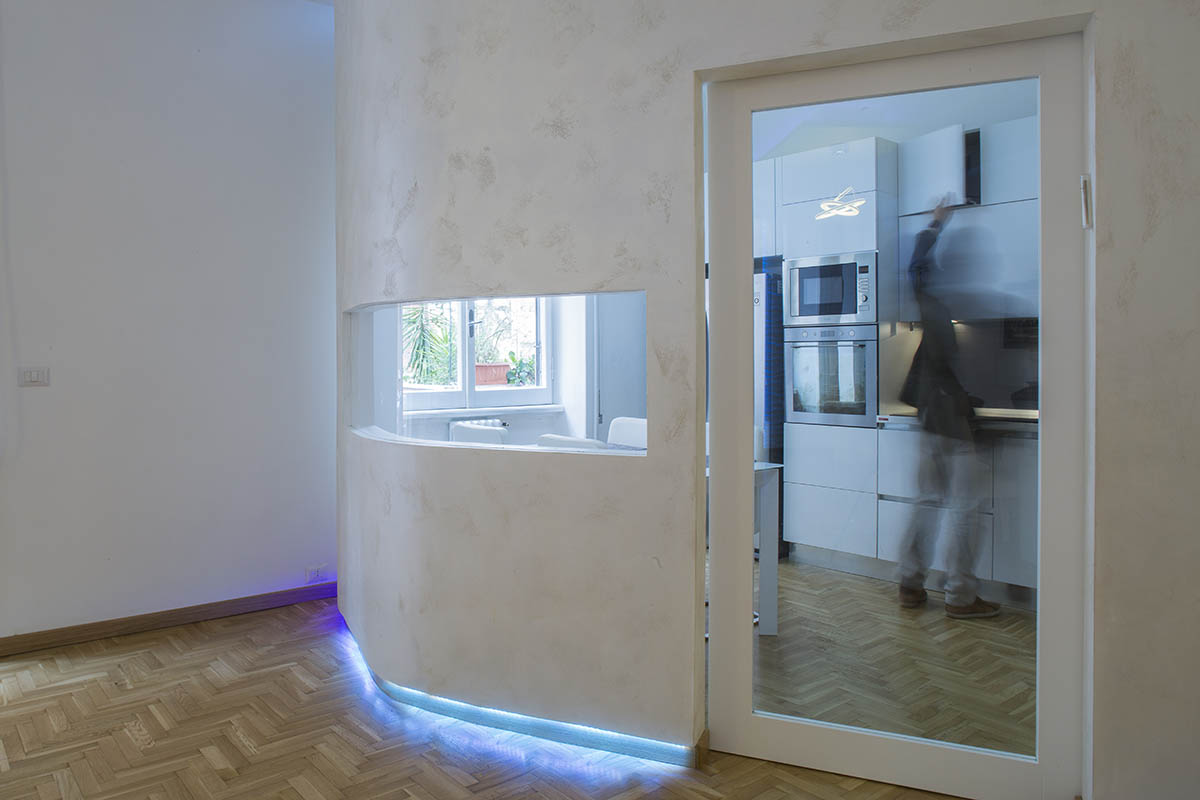 Così è nata l’idea di superfici sinuose nel grande living che come morbidi scogli sardi (rivestiti in materiale lapideo) andassero a caratterizzare l’ampia superficie definendo gli spazi destinati alla grande cucina, alla zona pranzo e all’ingresso, caratterizzato anche da un trattamento delle superfici con un motivo tridimensionale a onde, sottolineato da un’illuminazione led RGB.