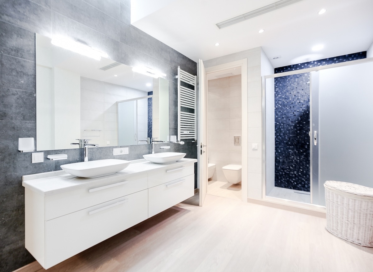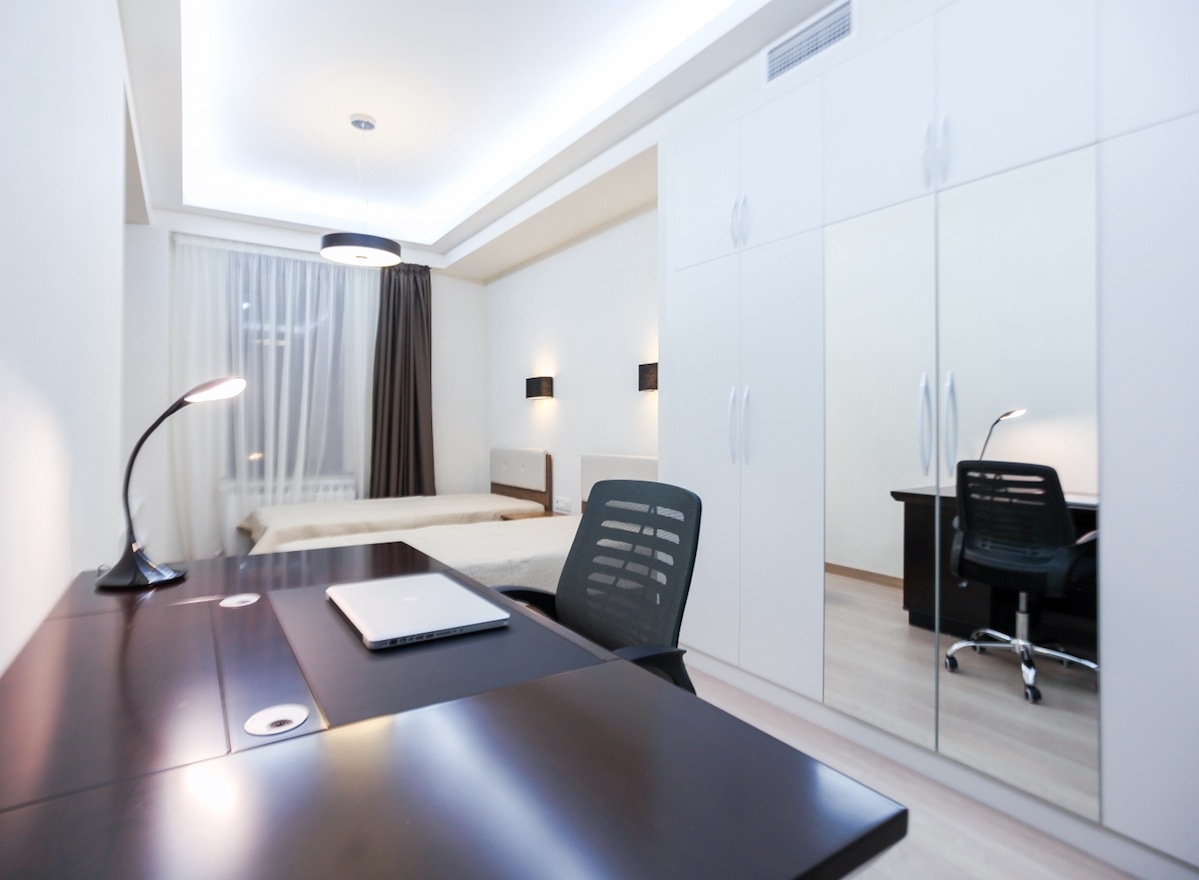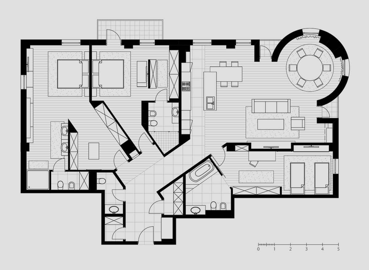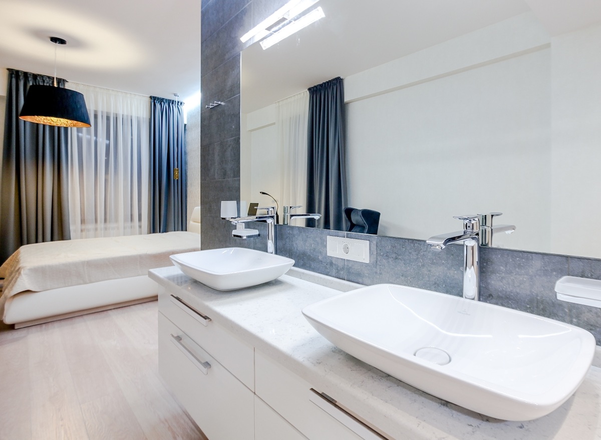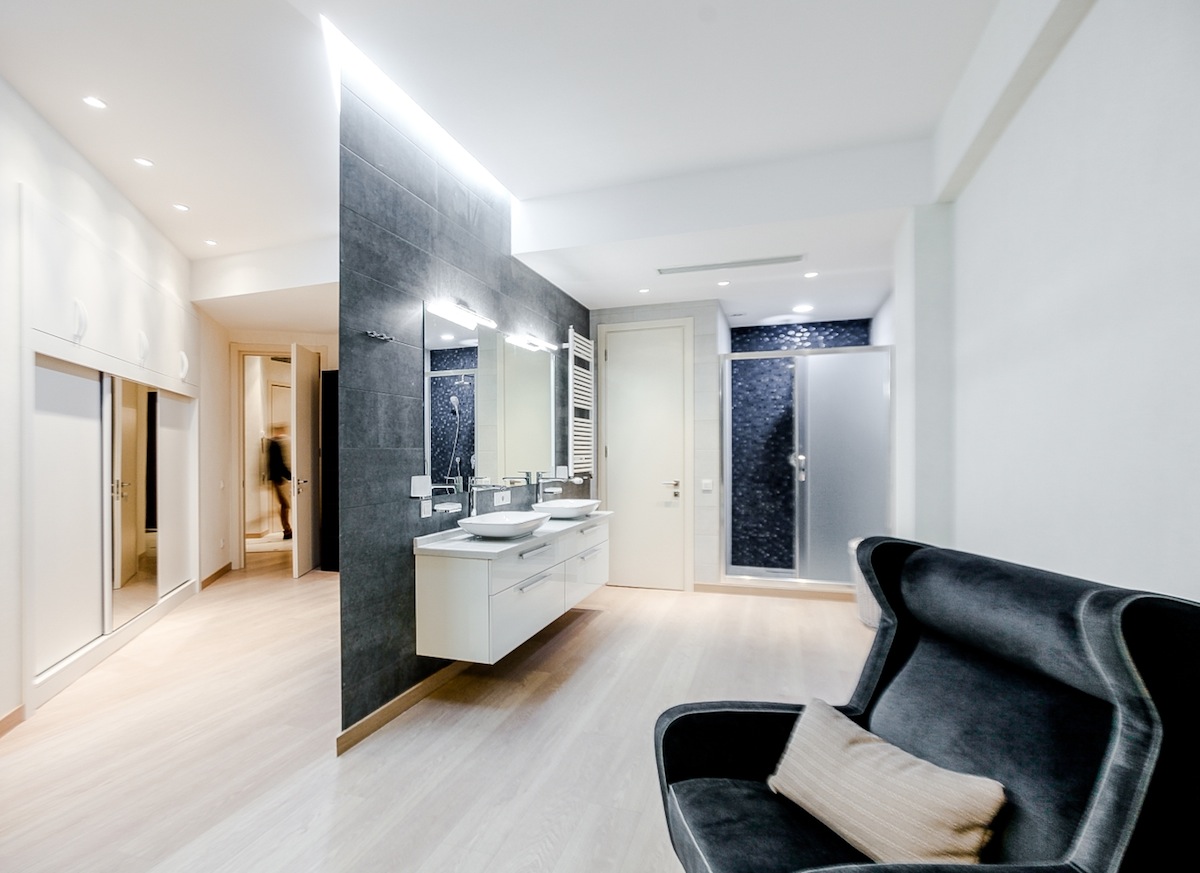 Compelling design choice was also made for the master bedroom, where two sinks are not shying away from eye, but are rather put on display, as integral element of the bedroom.