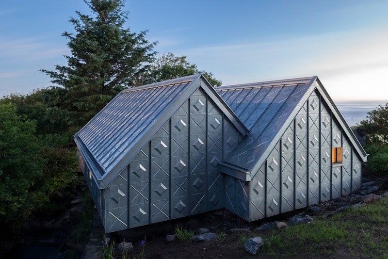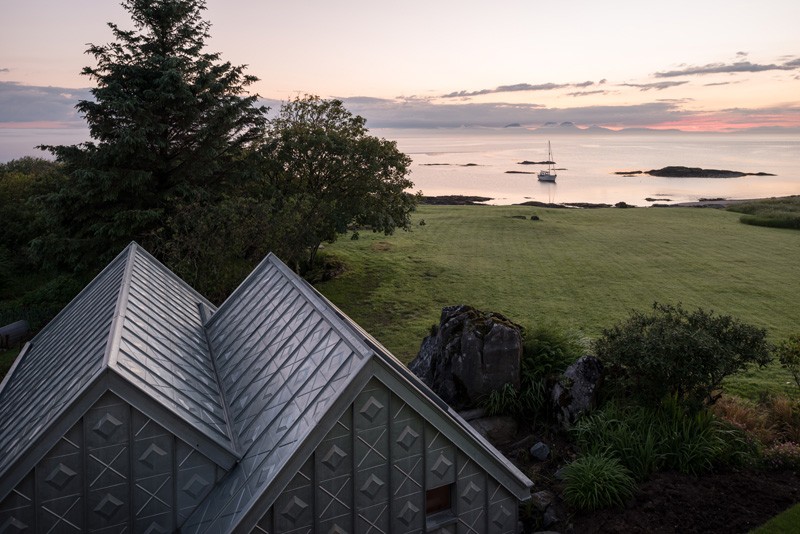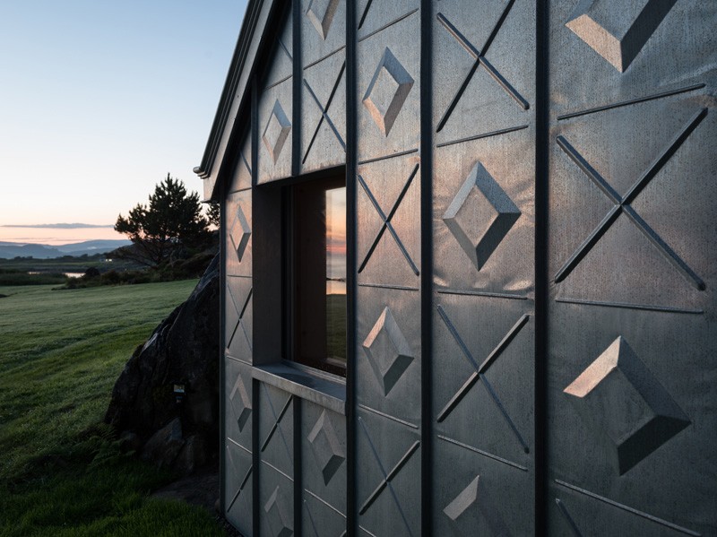 Rivestito in pannelli di lamiera zincata con disegni in rilievo questo edificio, costruito in parte sopra un torrente, è lo studio di un artista e si trova sulla costa occidentale della Scozia.