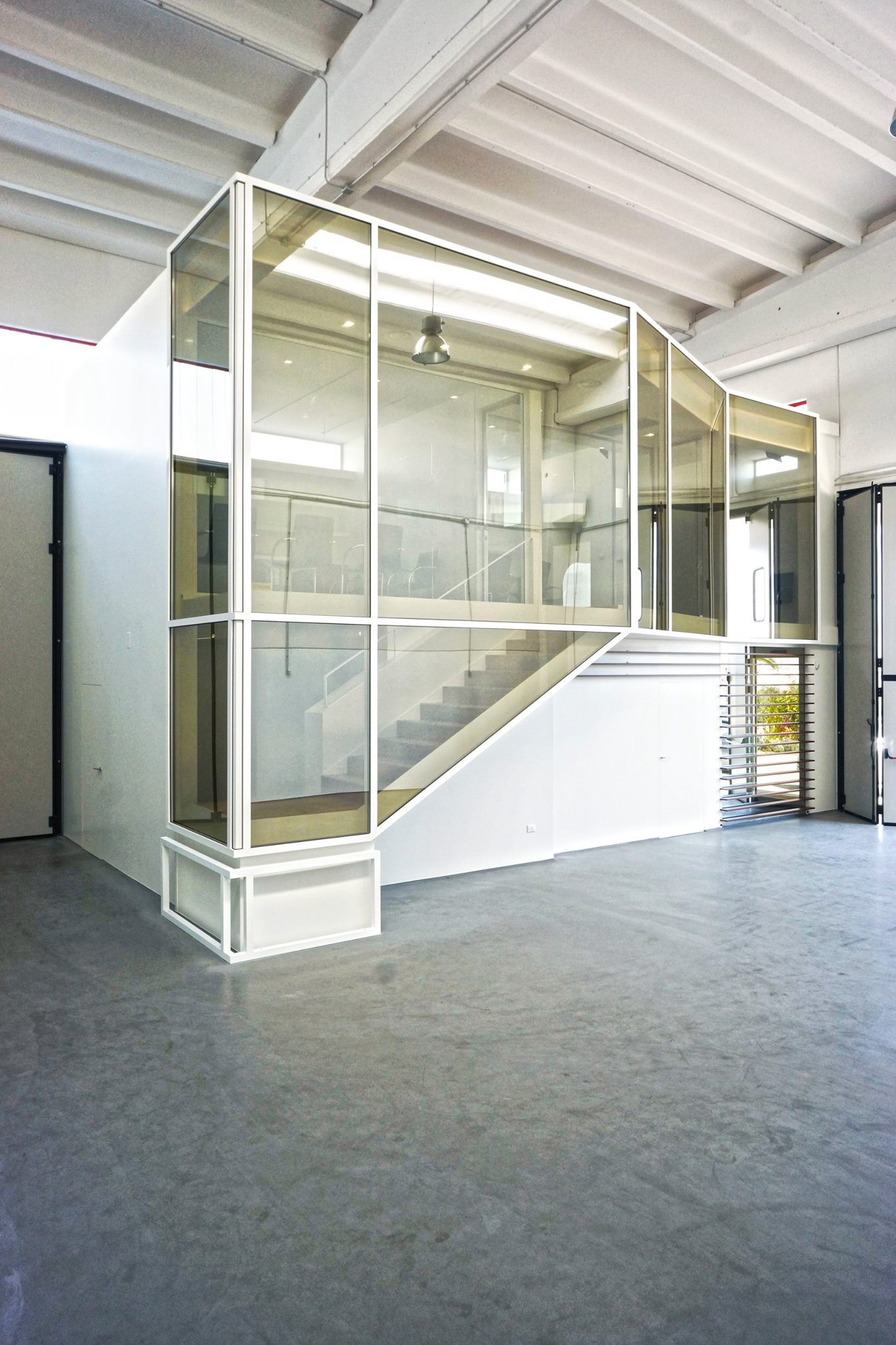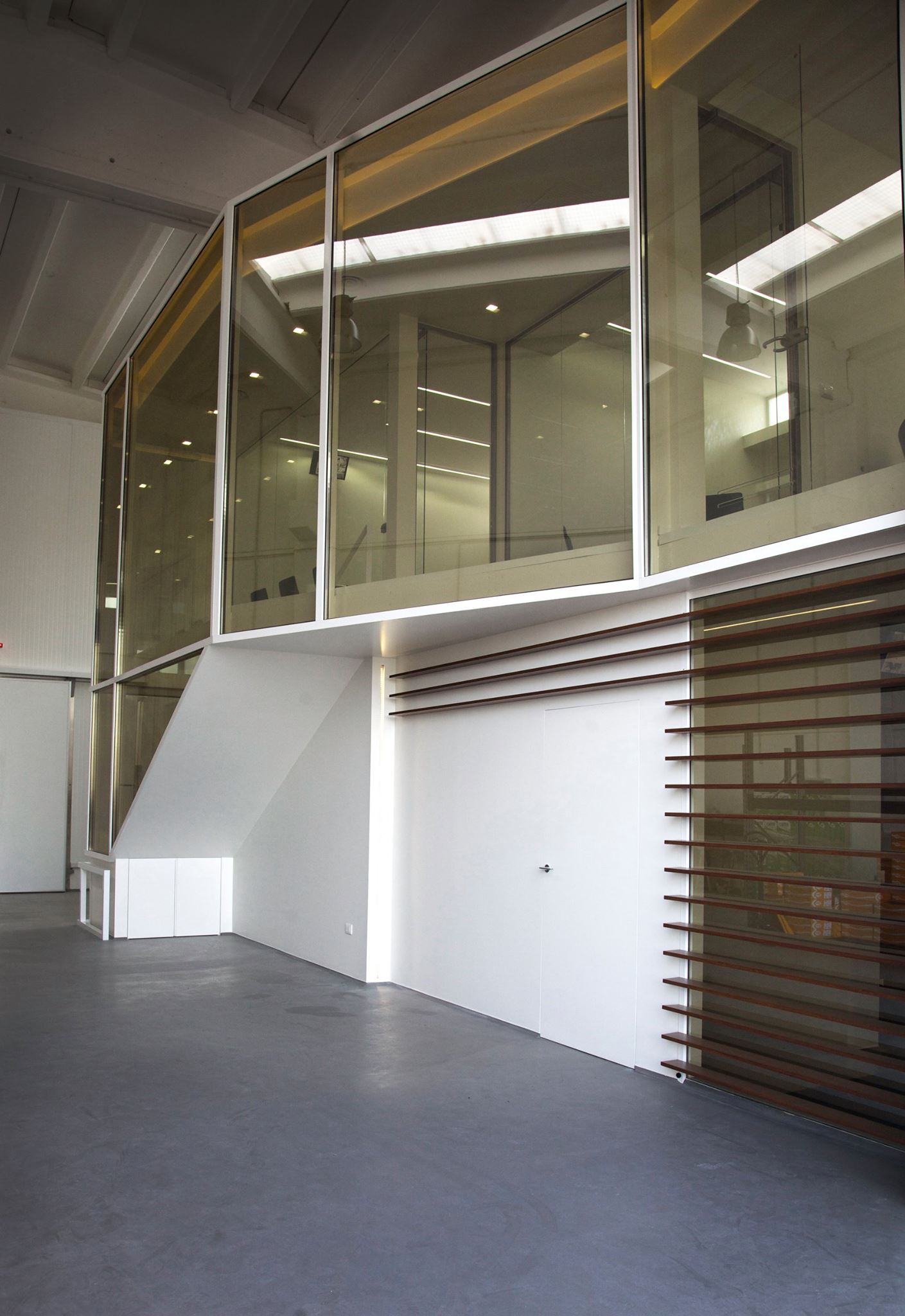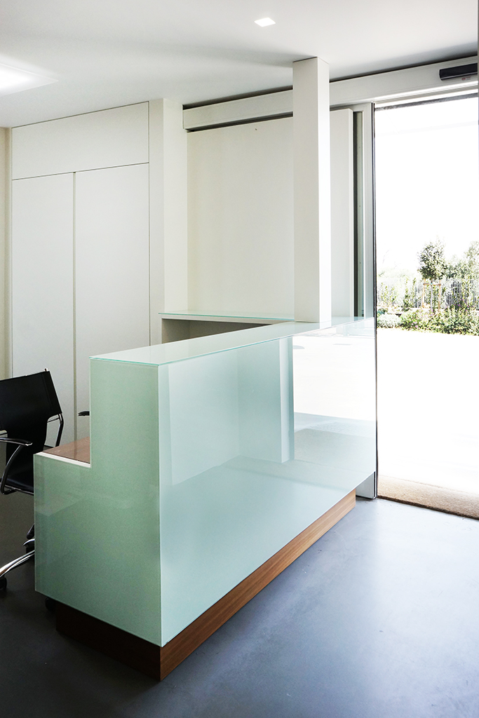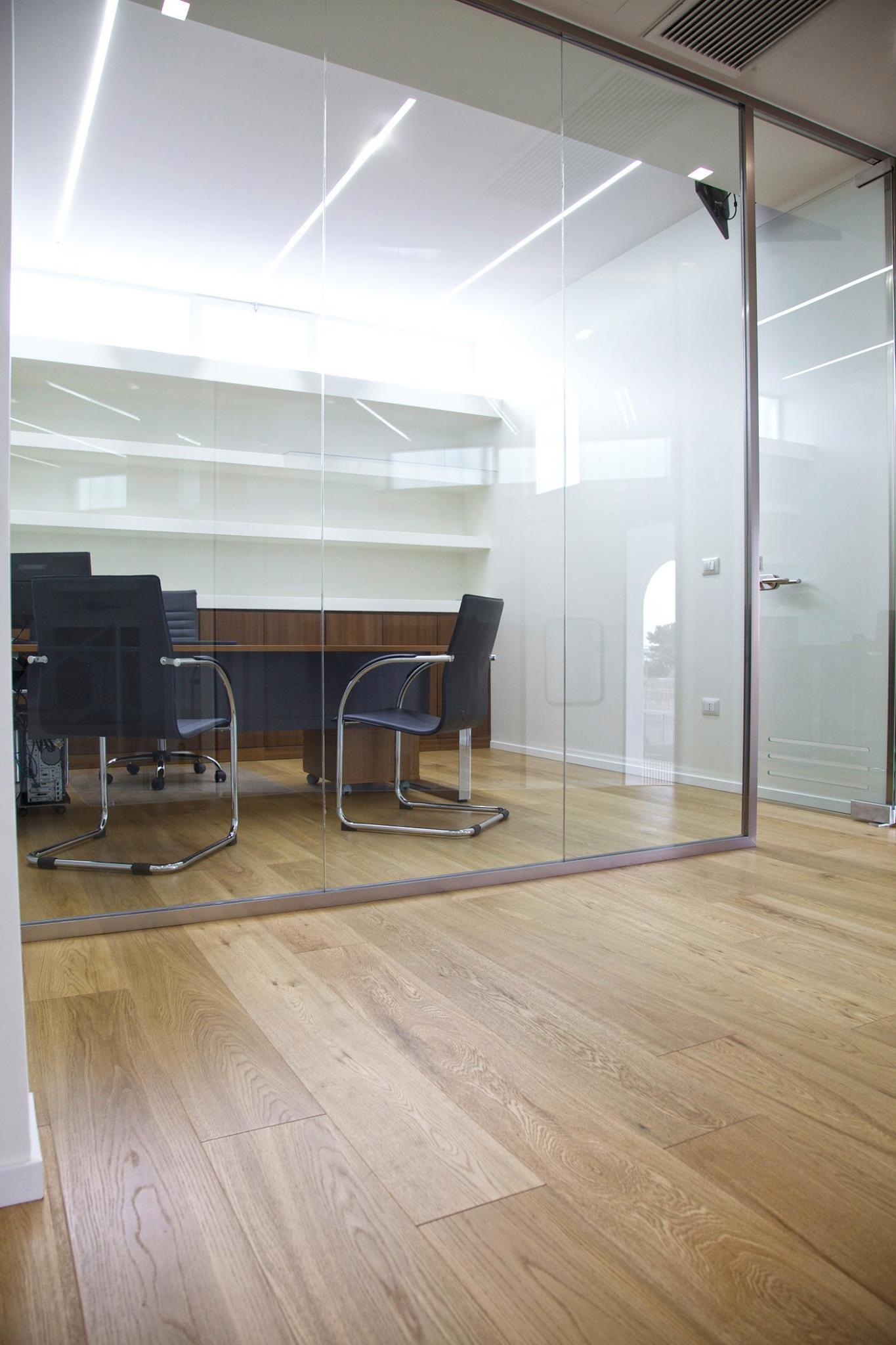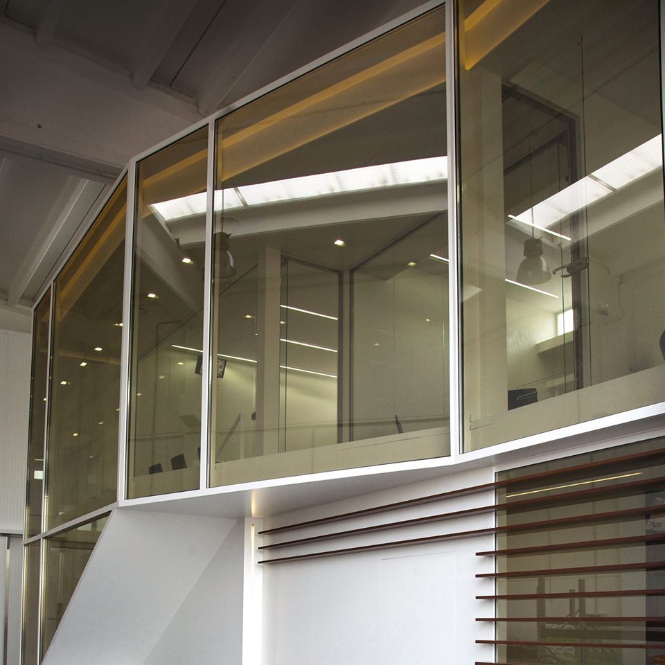 Questa scatola trasparente, accoglie sala riunioni, uffici e reception. Tutta la superficie, basata su un elegante pavimento in rovere, è divisa da pareti in cartongesso dalle superfici altamente riflettenti, mentre il perimetro degli stessi uffici, così come le porte, sono del tutto trasparenti. Lo sguardo è libero di spaziare tra interni ed esterni. Attraverso l’elemento vetro, Michelangelo Olivieri ha sapientemente abbinato a necessità tecniche, una scelta di grande impatto estetico. Il capannone infatti, sprovvisto di affacci e aperture verso l’esterno, non avrebbe fornito la giusta illuminazione alla zona uffici. Il vetro, unito al candore dei muri invece, dona immensa luce e freschezza agli ambienti, e pone in contatto visivo le differenti zone, dando la possibilità di monitorare costantemente i processi produttivi.