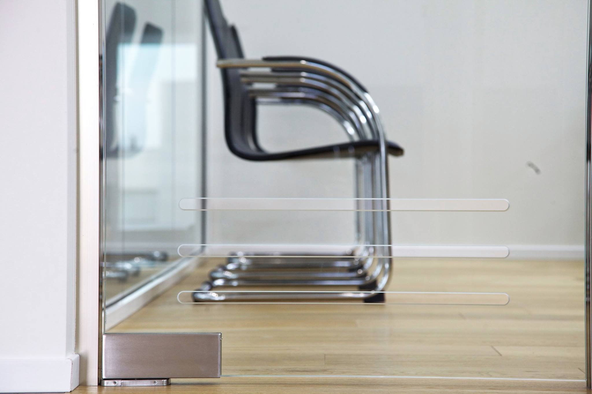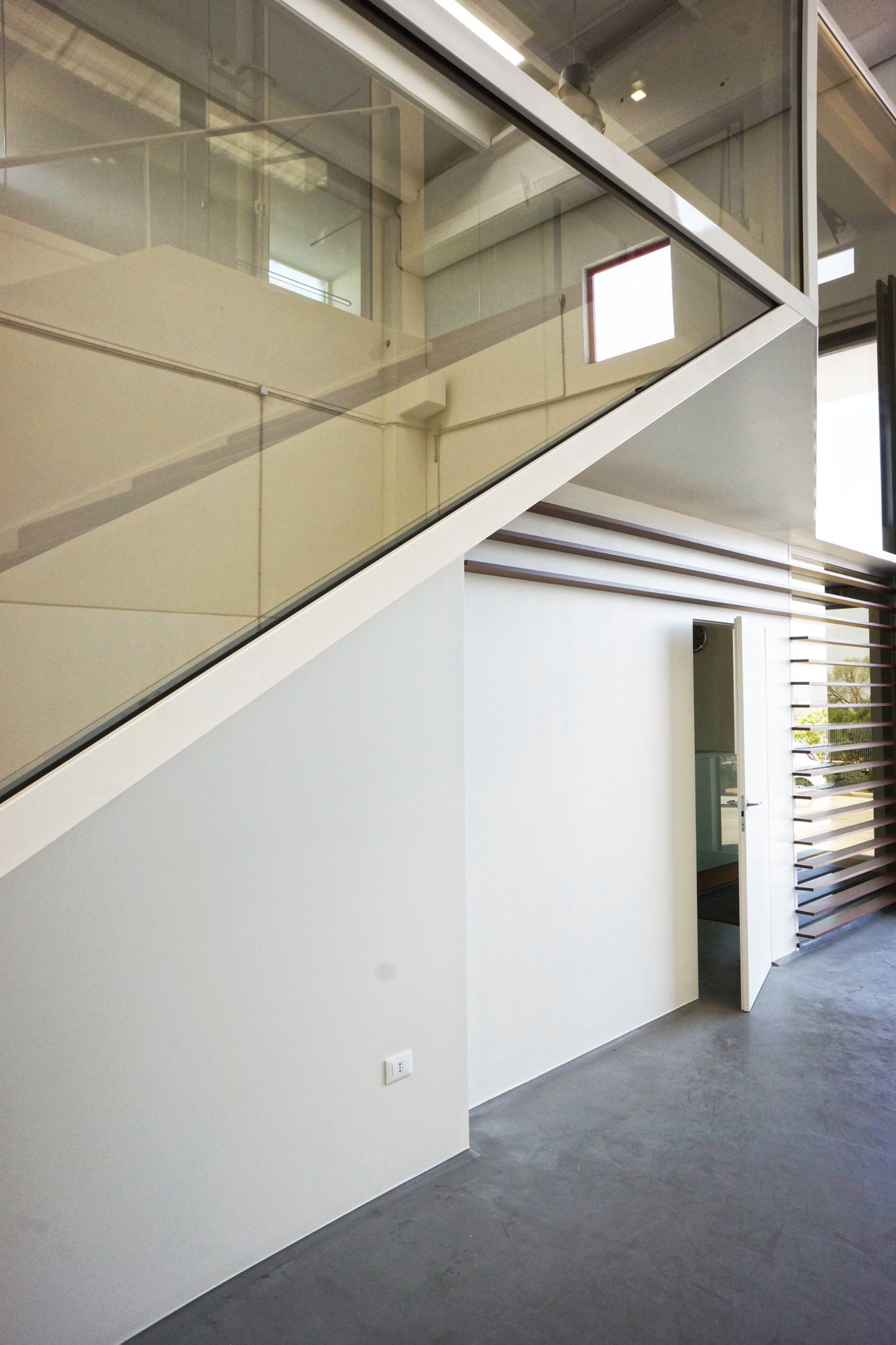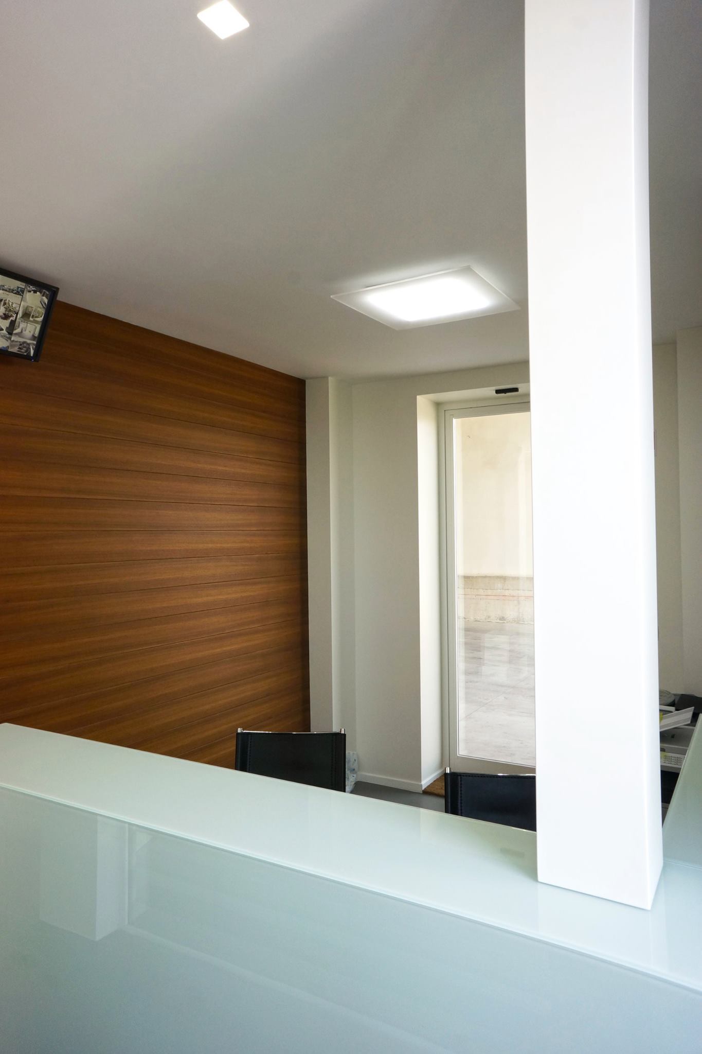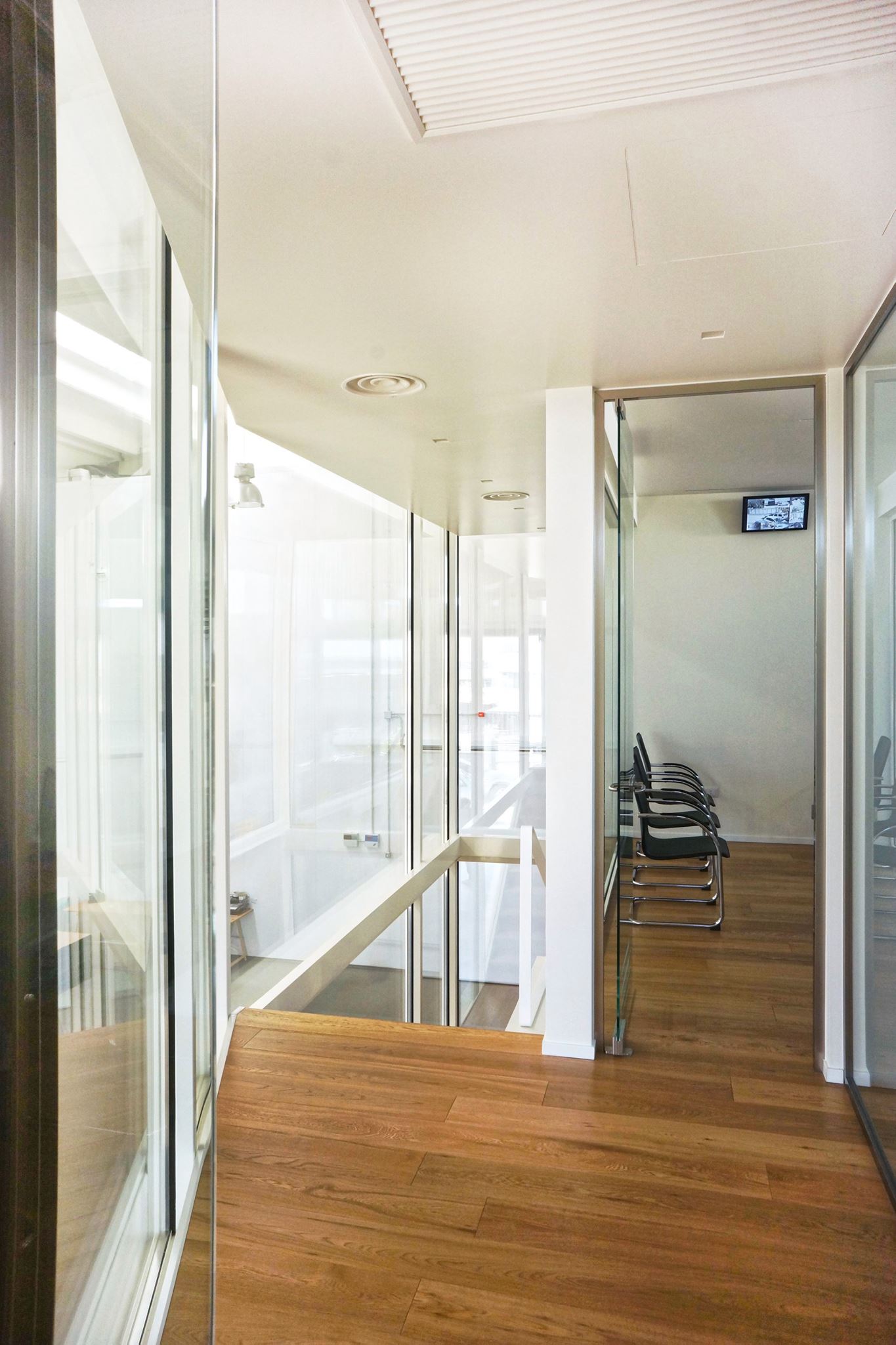 Questa scatola trasparente, accoglie sala riunioni, uffici e reception. Tutta la superficie, basata su un elegante pavimento in rovere, è divisa da pareti in cartongesso dalle superfici altamente riflettenti, mentre il perimetro degli stessi uffici, così come le porte, sono del tutto trasparenti. Lo sguardo è libero di spaziare tra interni ed esterni. Attraverso l’elemento vetro, Michelangelo Olivieri ha sapientemente abbinato a necessità tecniche, una scelta di grande impatto estetico. Il capannone infatti, sprovvisto di affacci e aperture verso l’esterno, non avrebbe fornito la giusta illuminazione alla zona uffici. Il vetro, unito al candore dei muri invece, dona immensa luce e freschezza agli ambienti, e pone in contatto visivo le differenti zone, dando la possibilità di monitorare costantemente i processi produttivi.